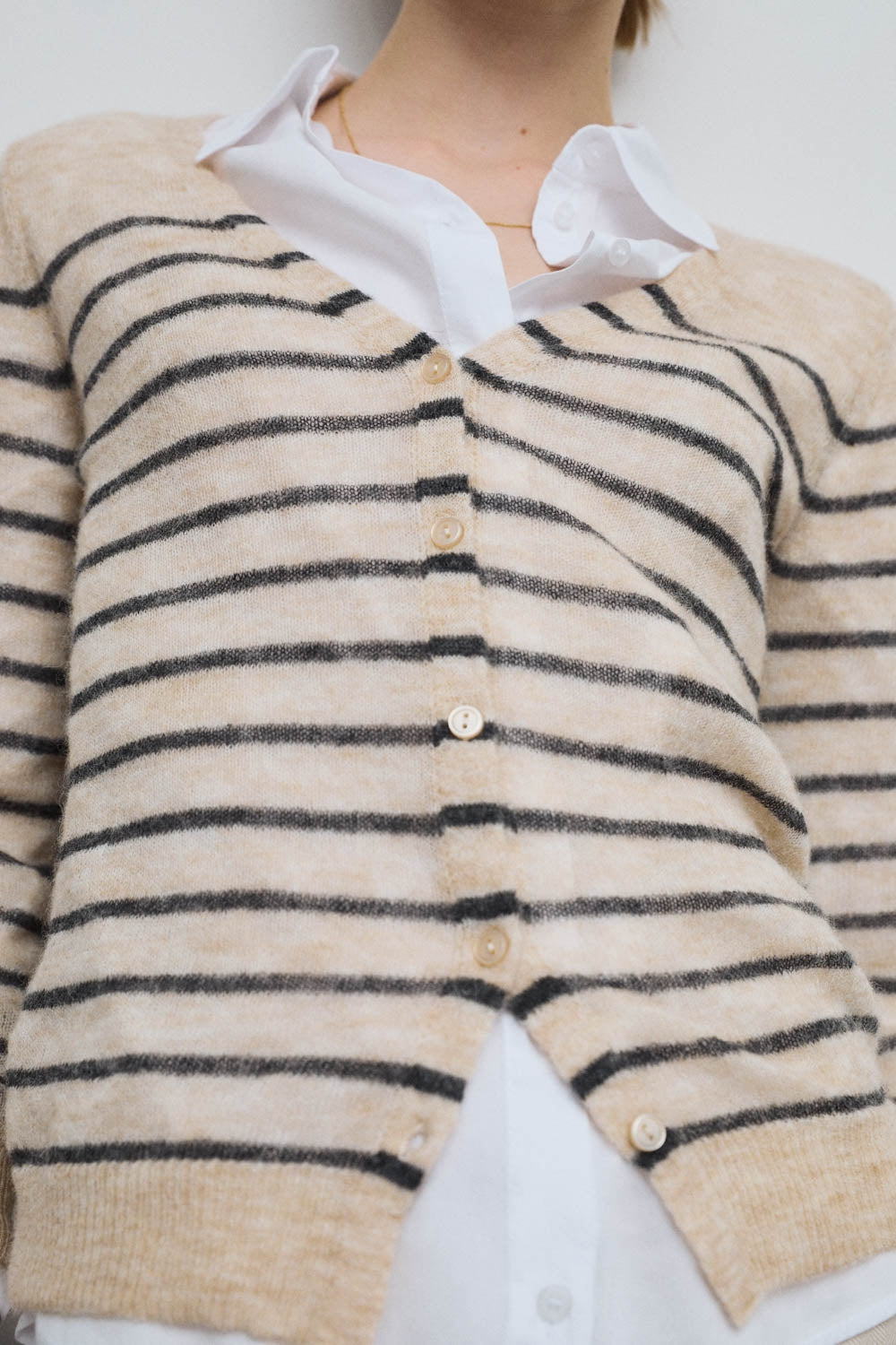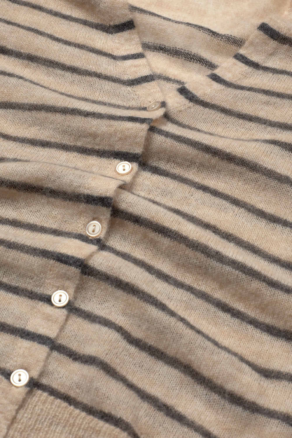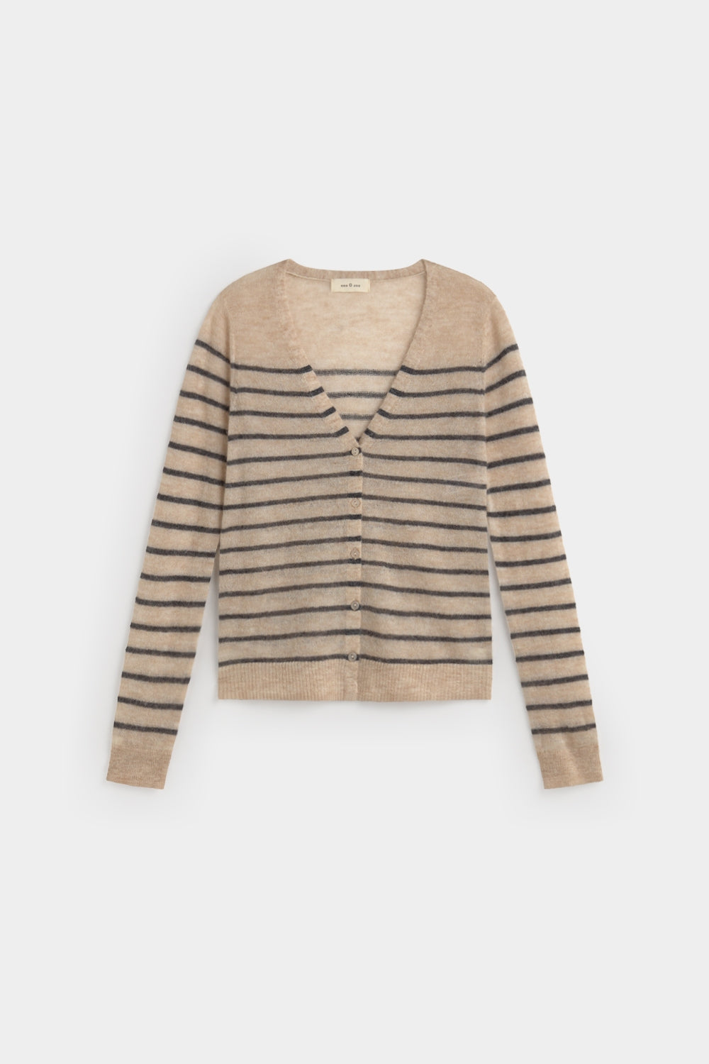 Cardigan eseOese Loire de punto fino crudo con estampado de rayas grises.