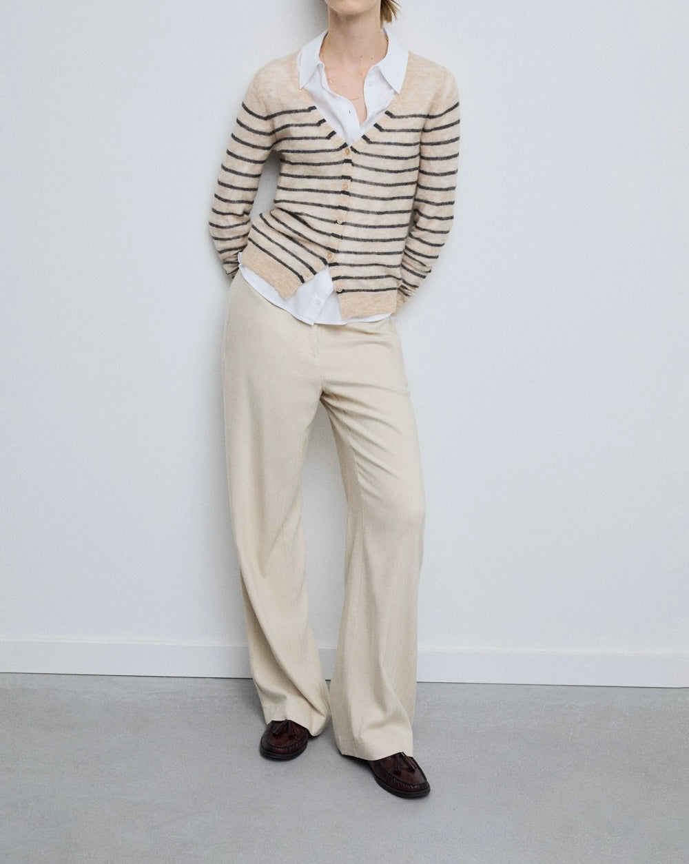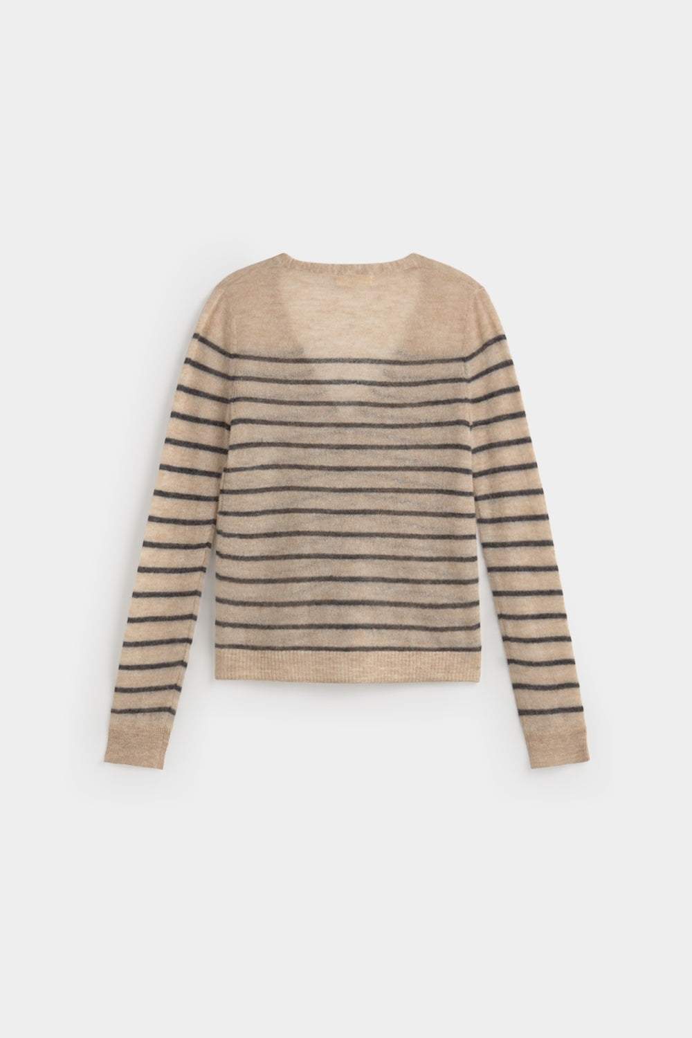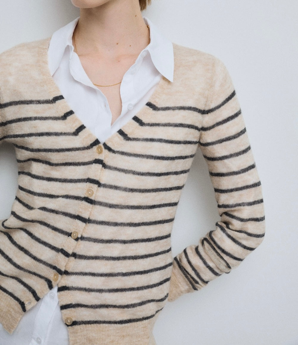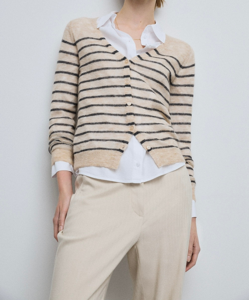 Cardigan eseOese Loire de punto fino crudo con estampado de rayas grises.