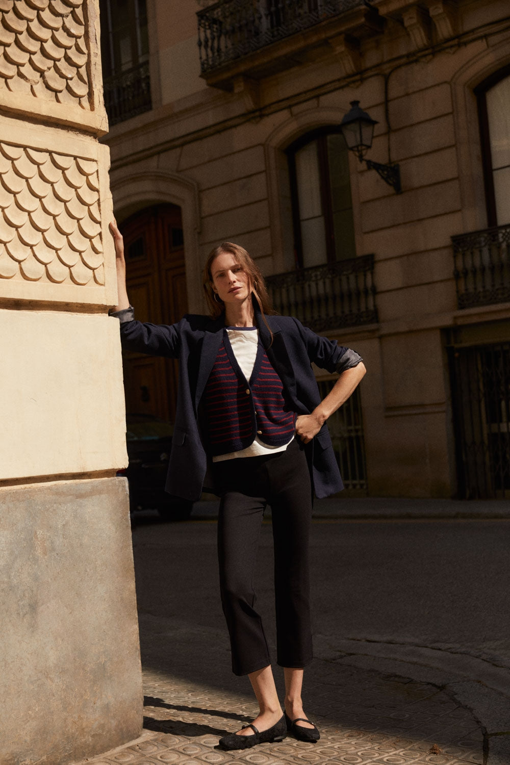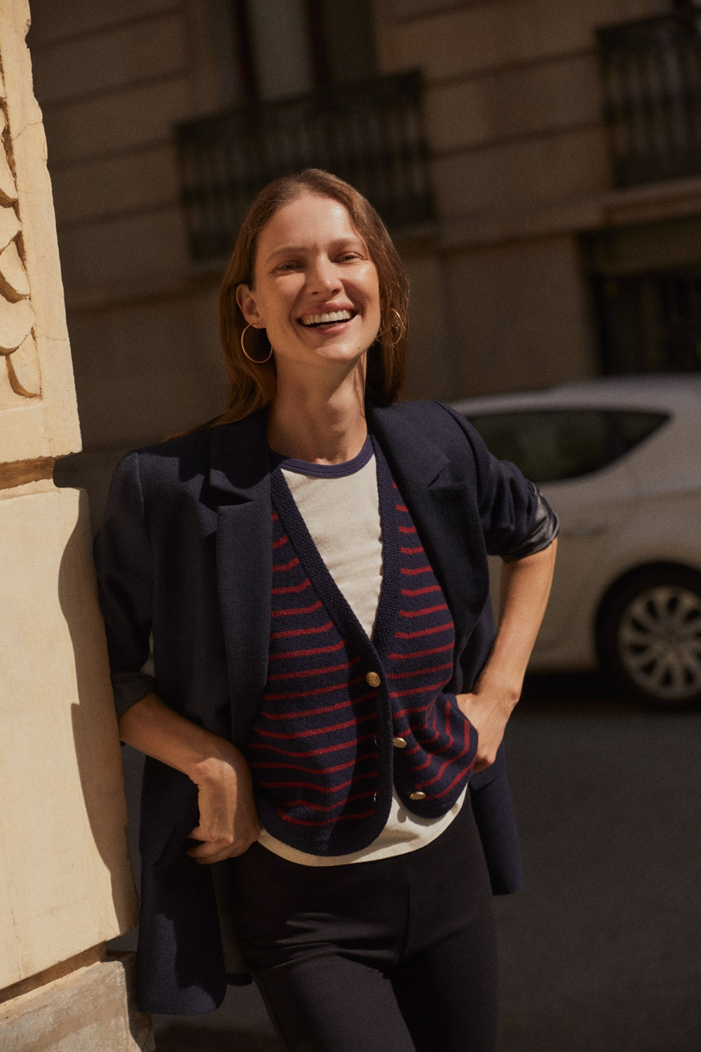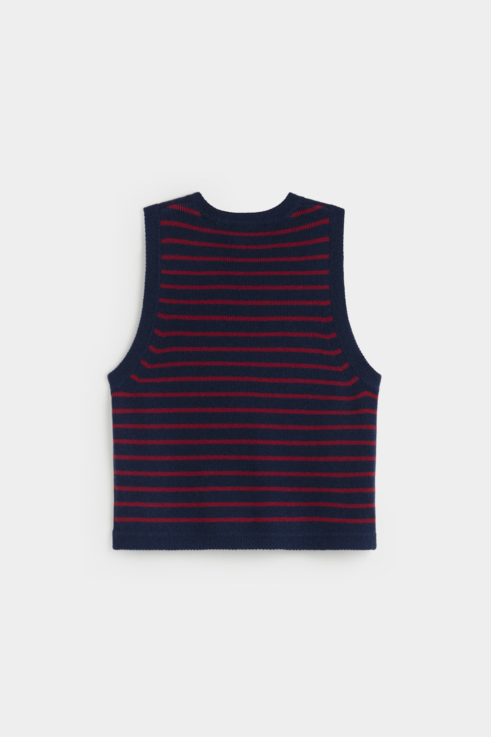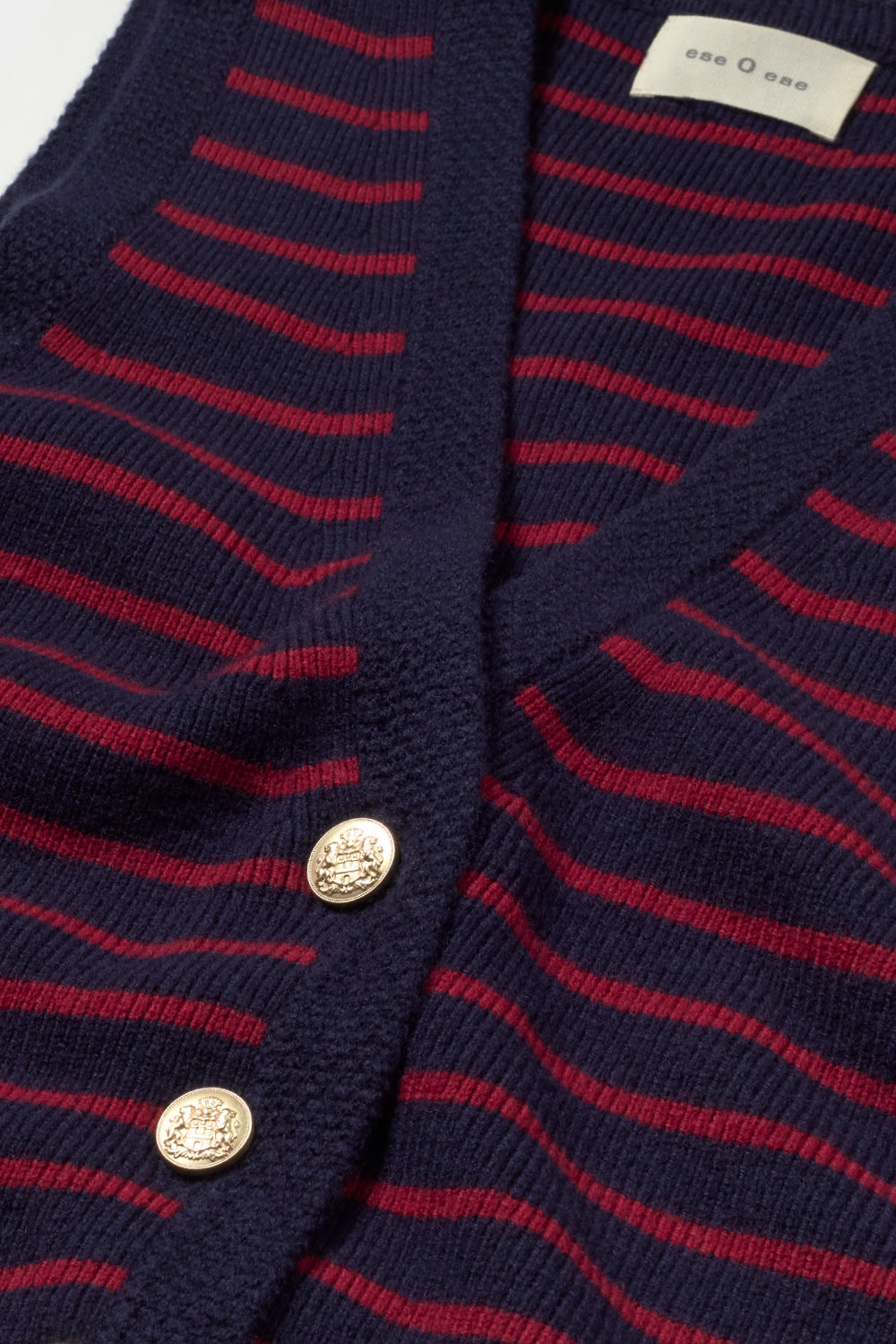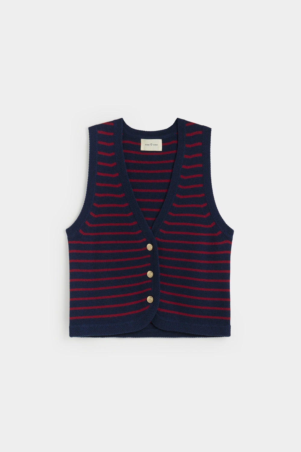 Chaleco eseOese Coco de punto en color navy con rayas en rojo, y botones dorados.