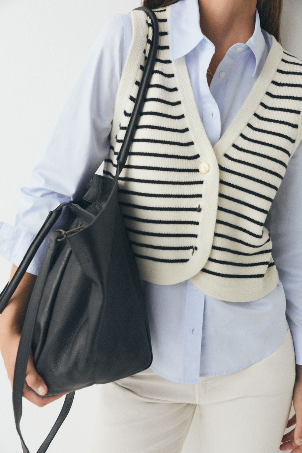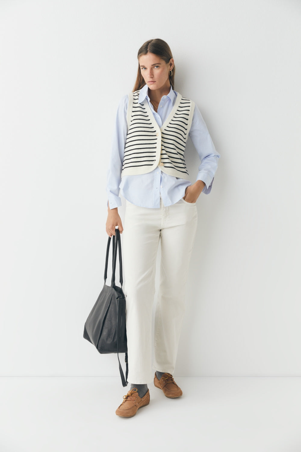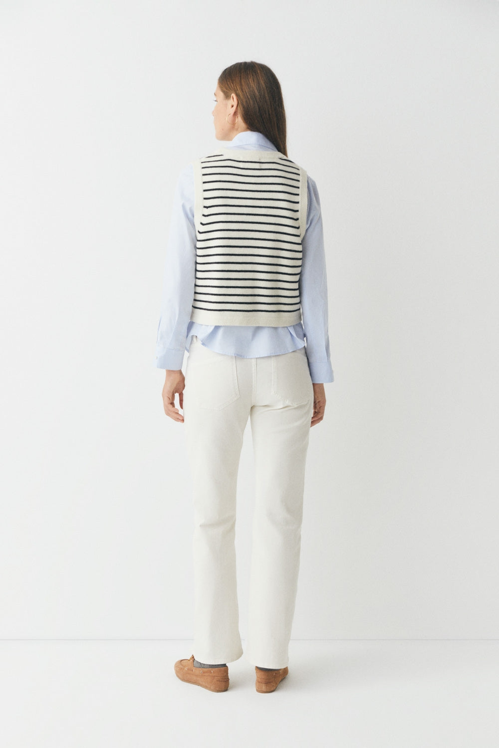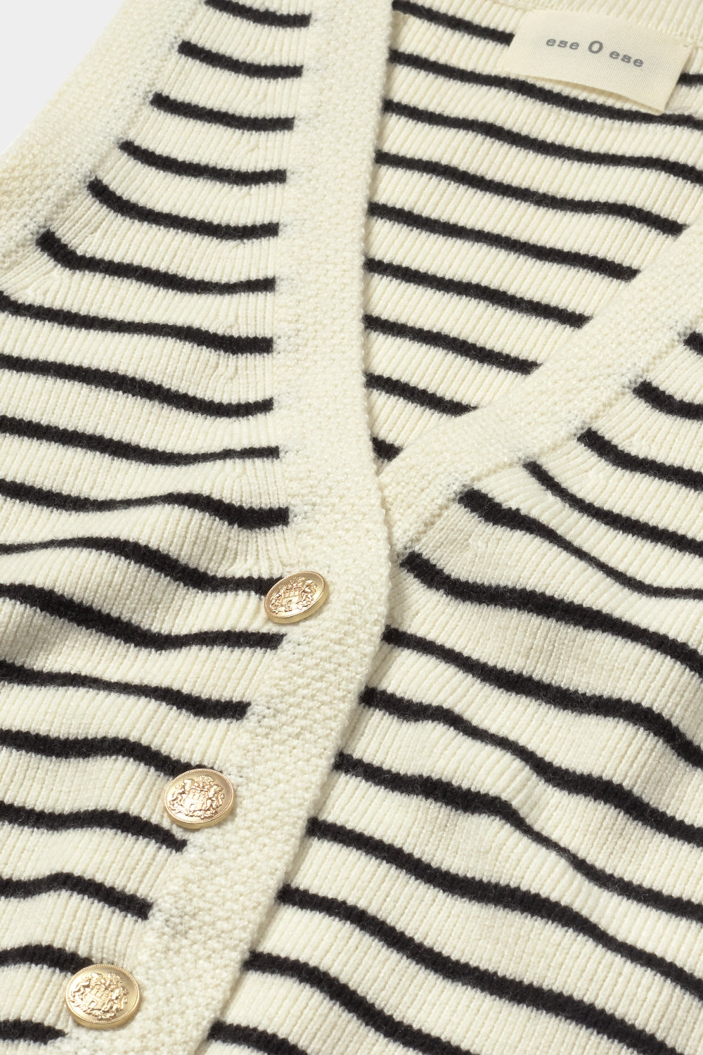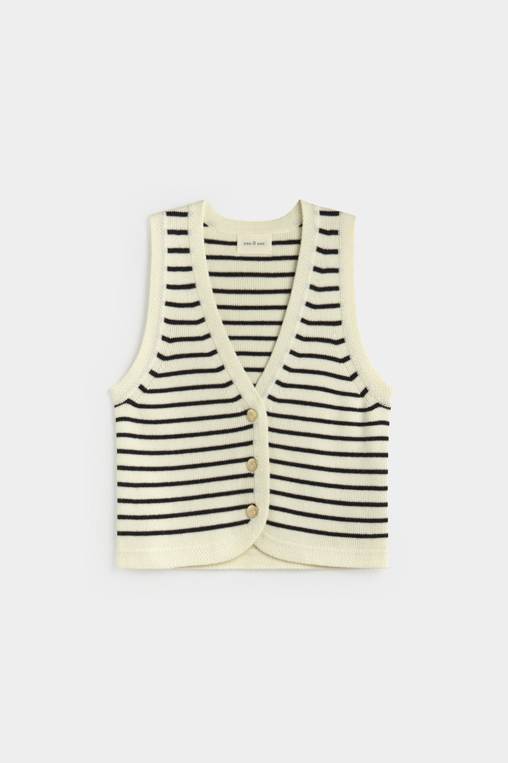 Chaleco eseOese Coco de punto en color crudo con rayas en navy, y botones dorados.