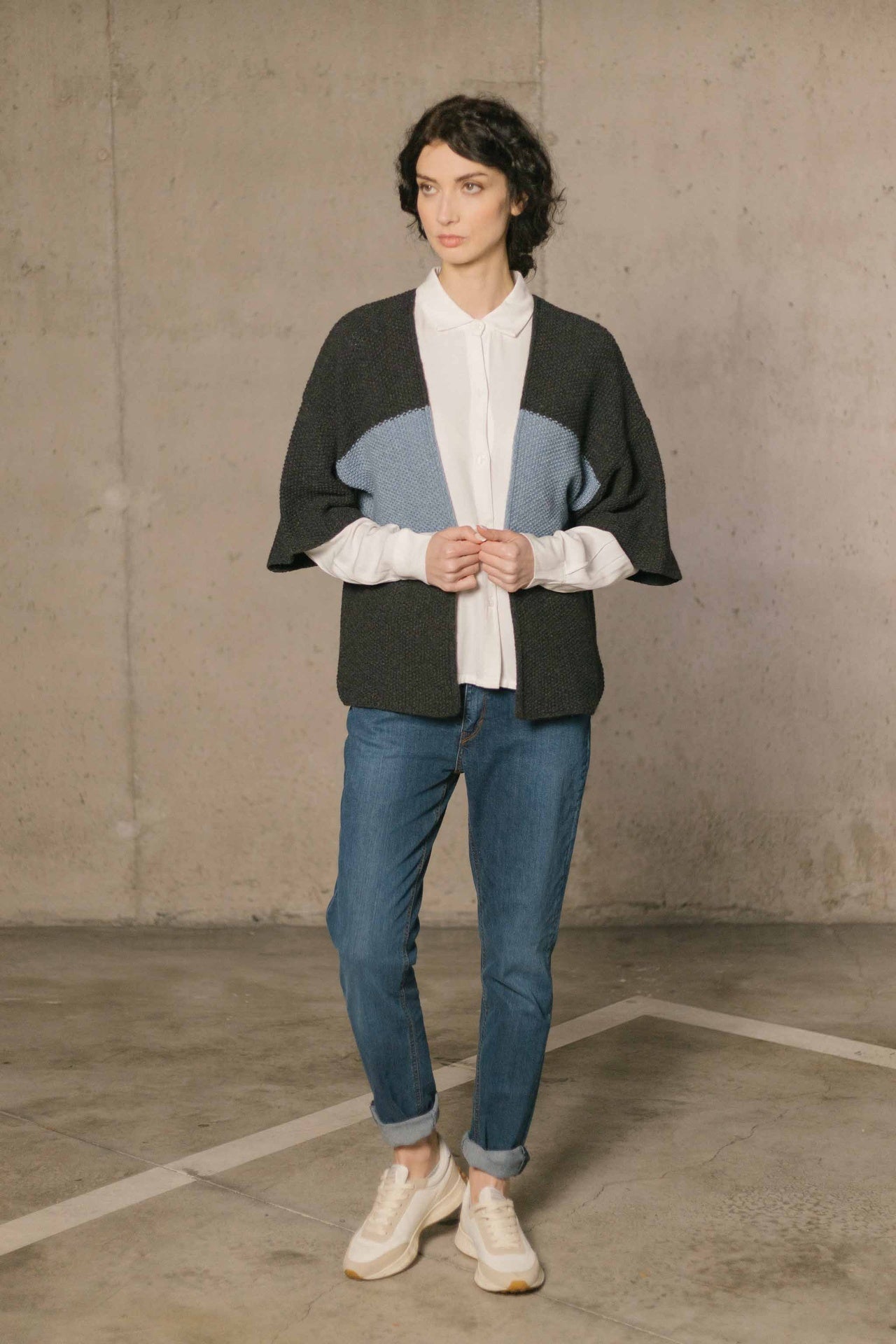 Chaqueta PAN PRODUCTO BASICO de punto en gris y azul.