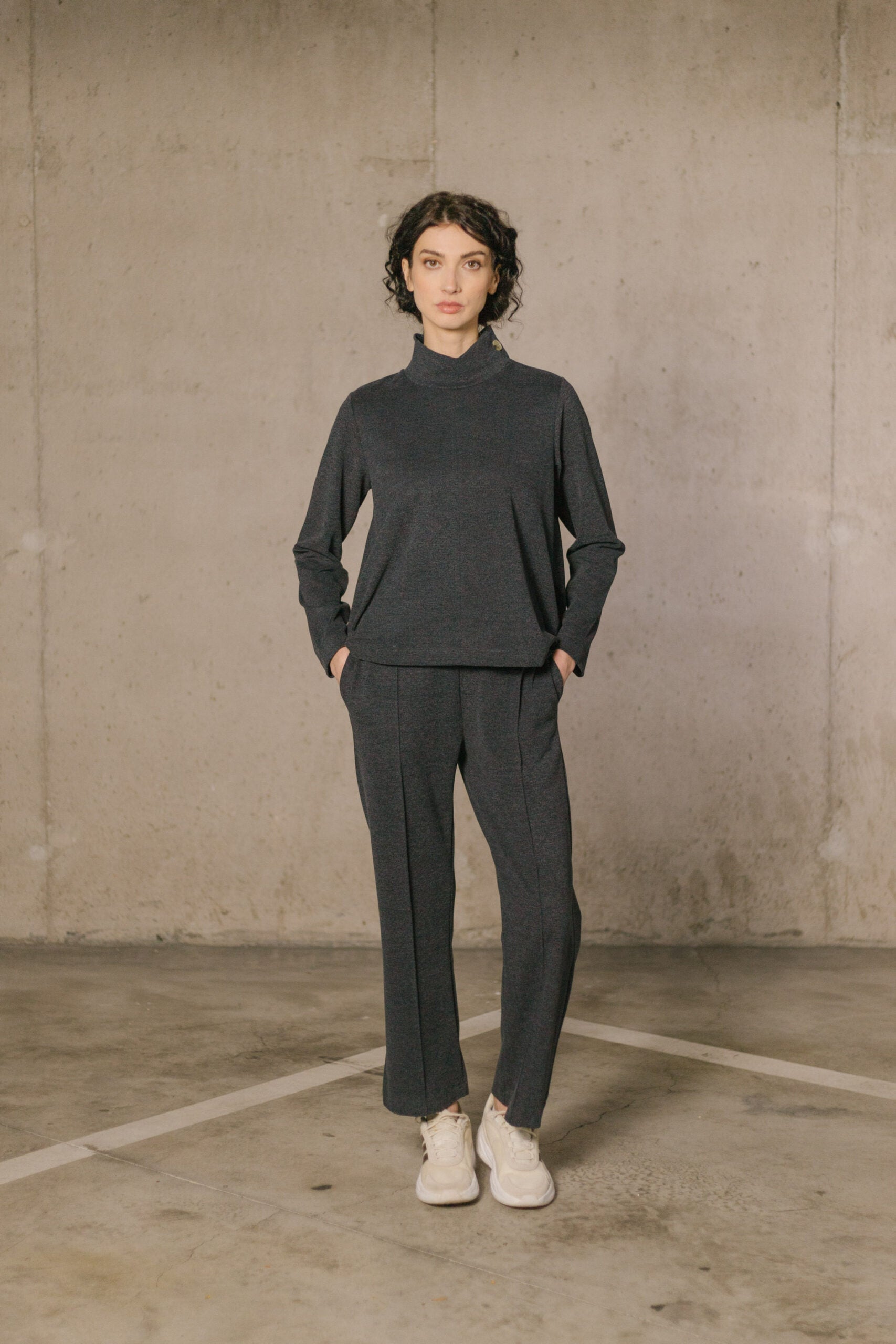 Pantalon PAN PRODUCTO BASICO en color gris marengo jaspeado con bolsillos y cintura elástica por detrás.