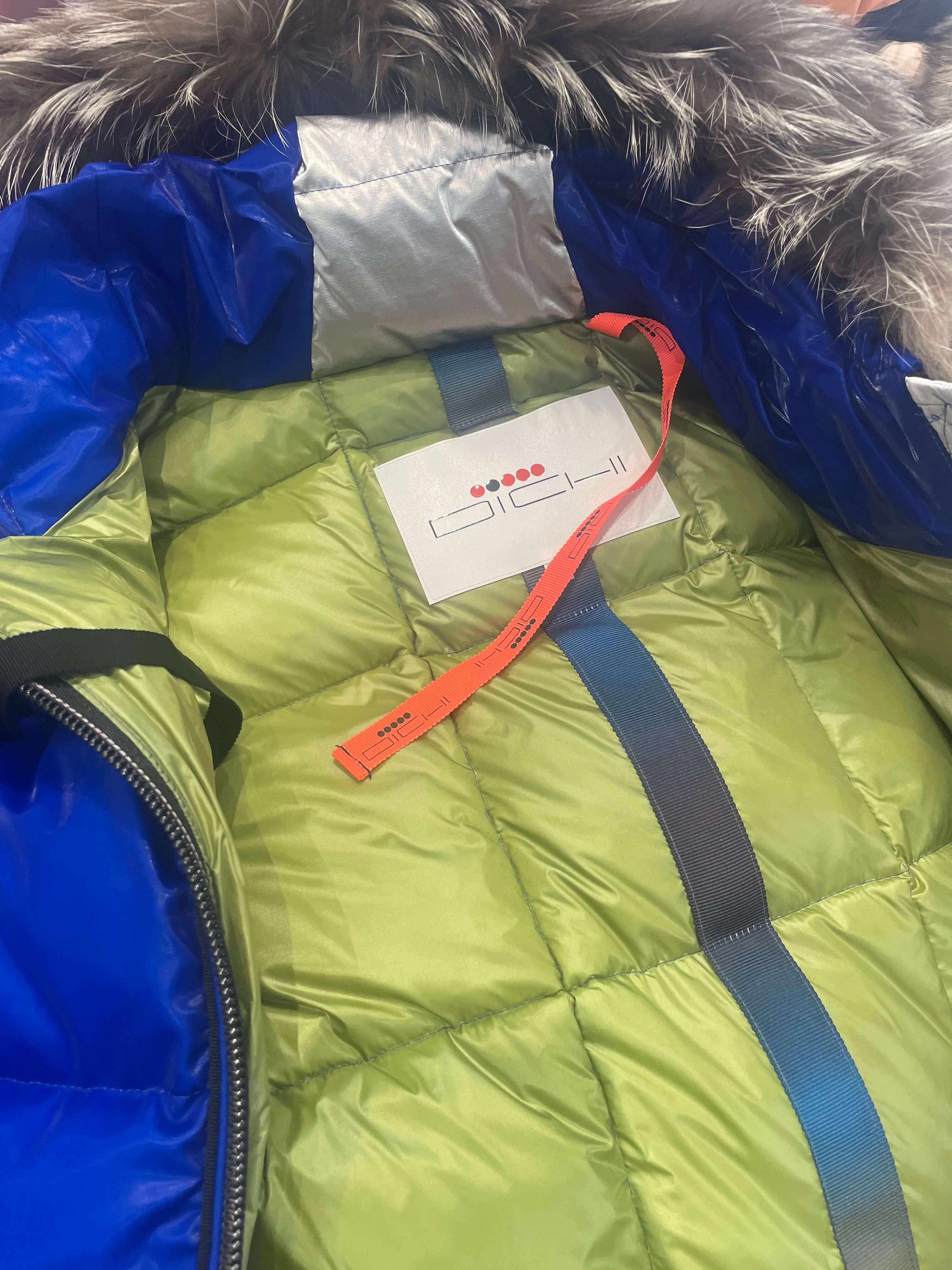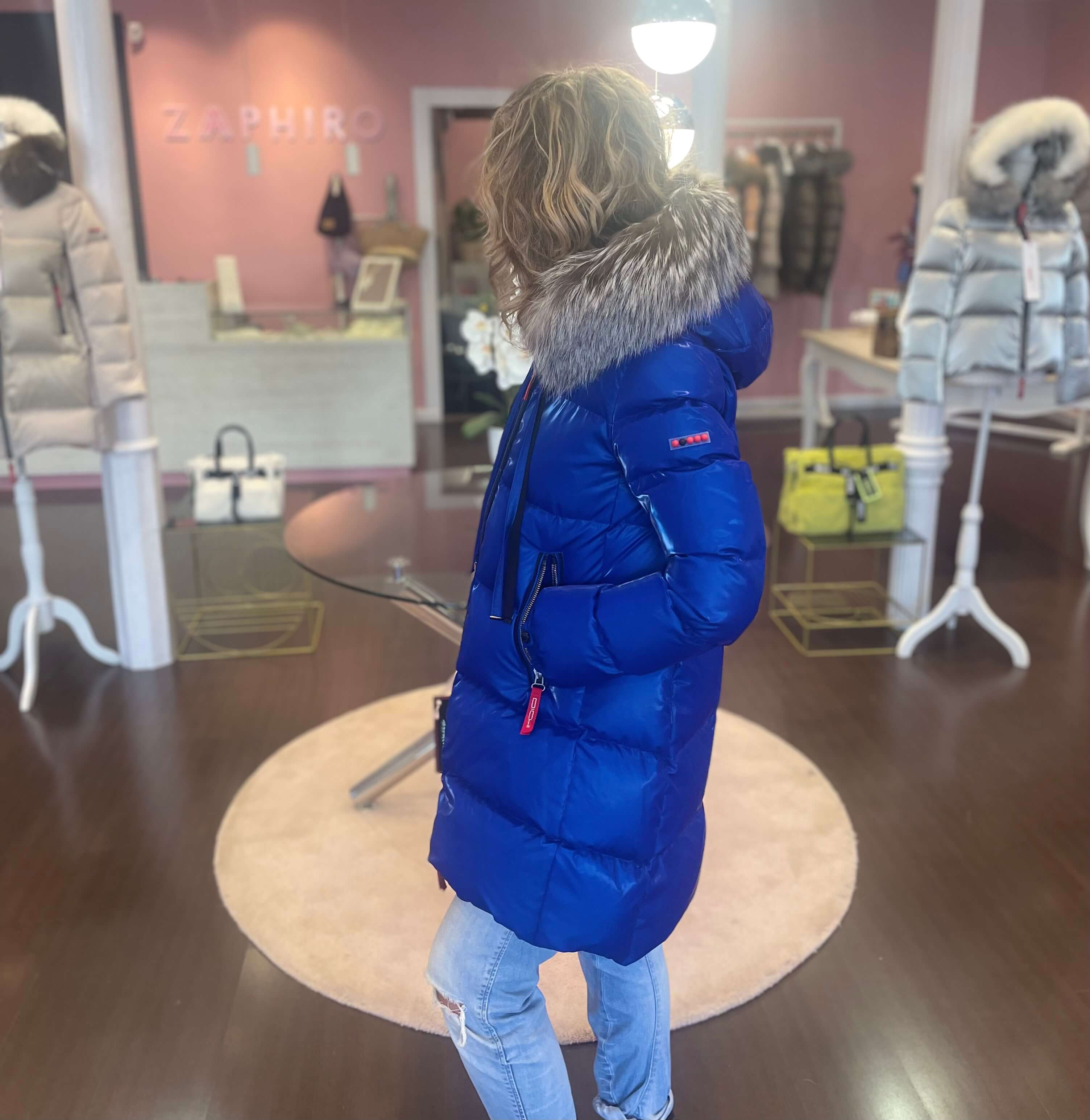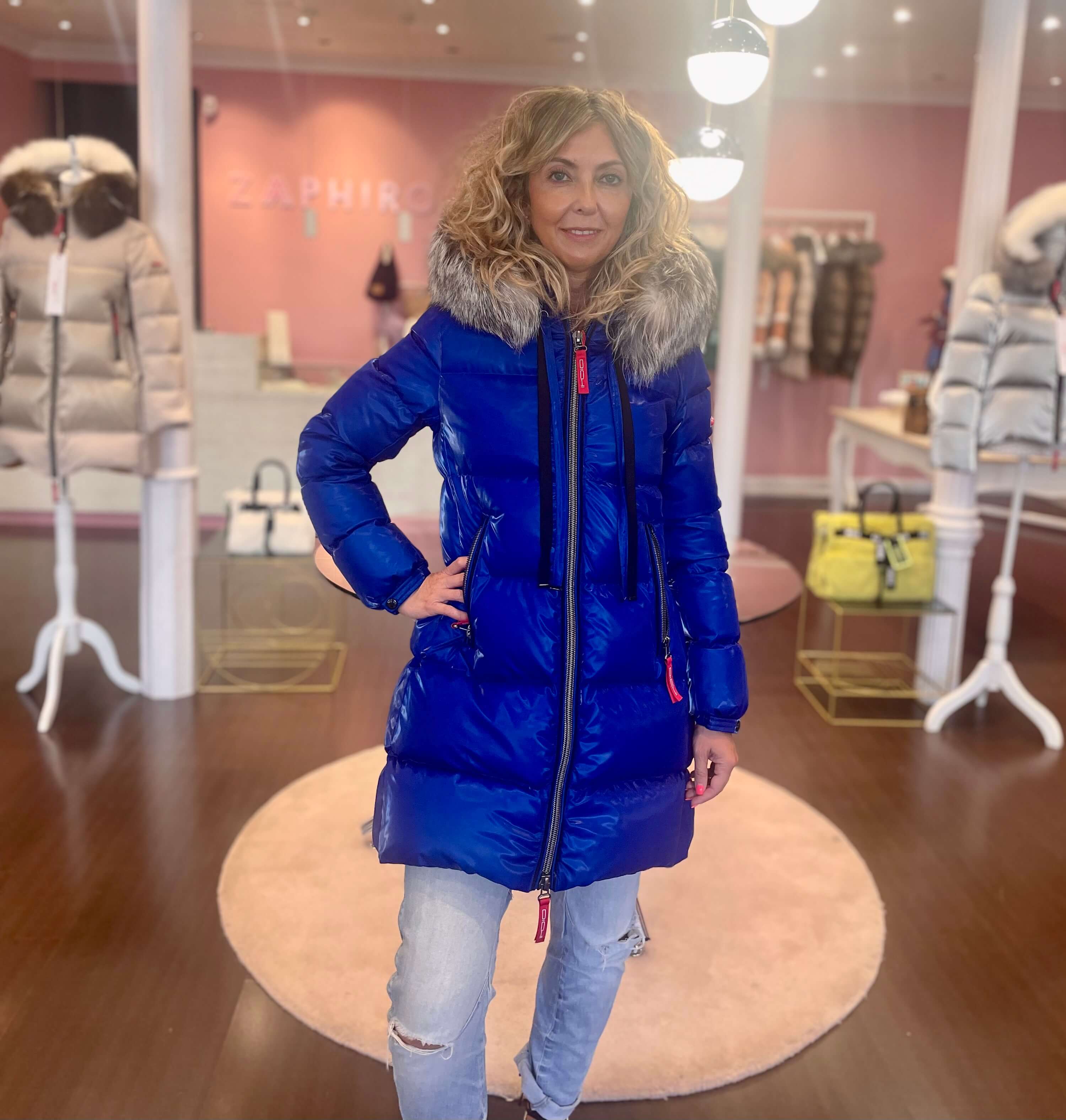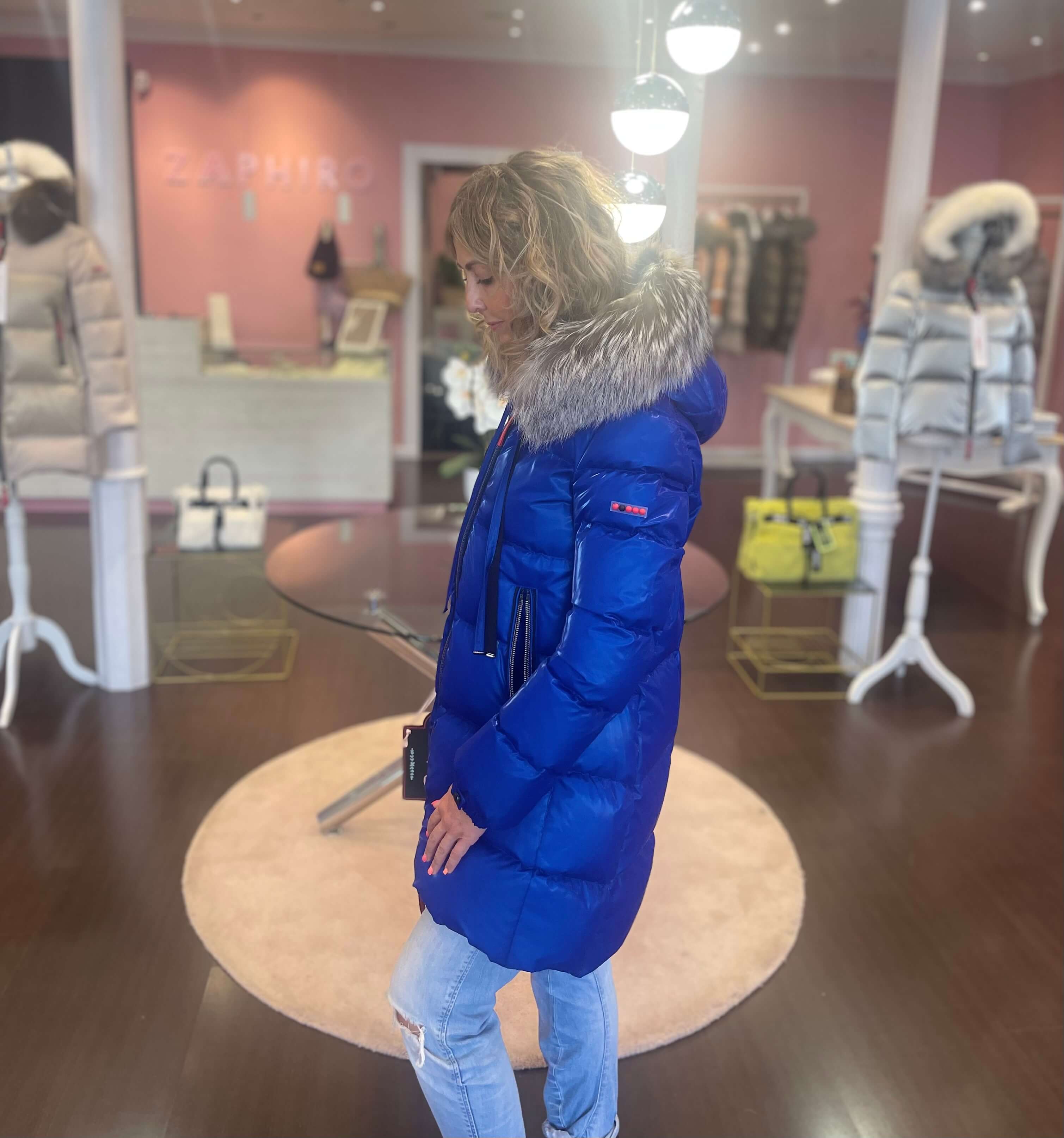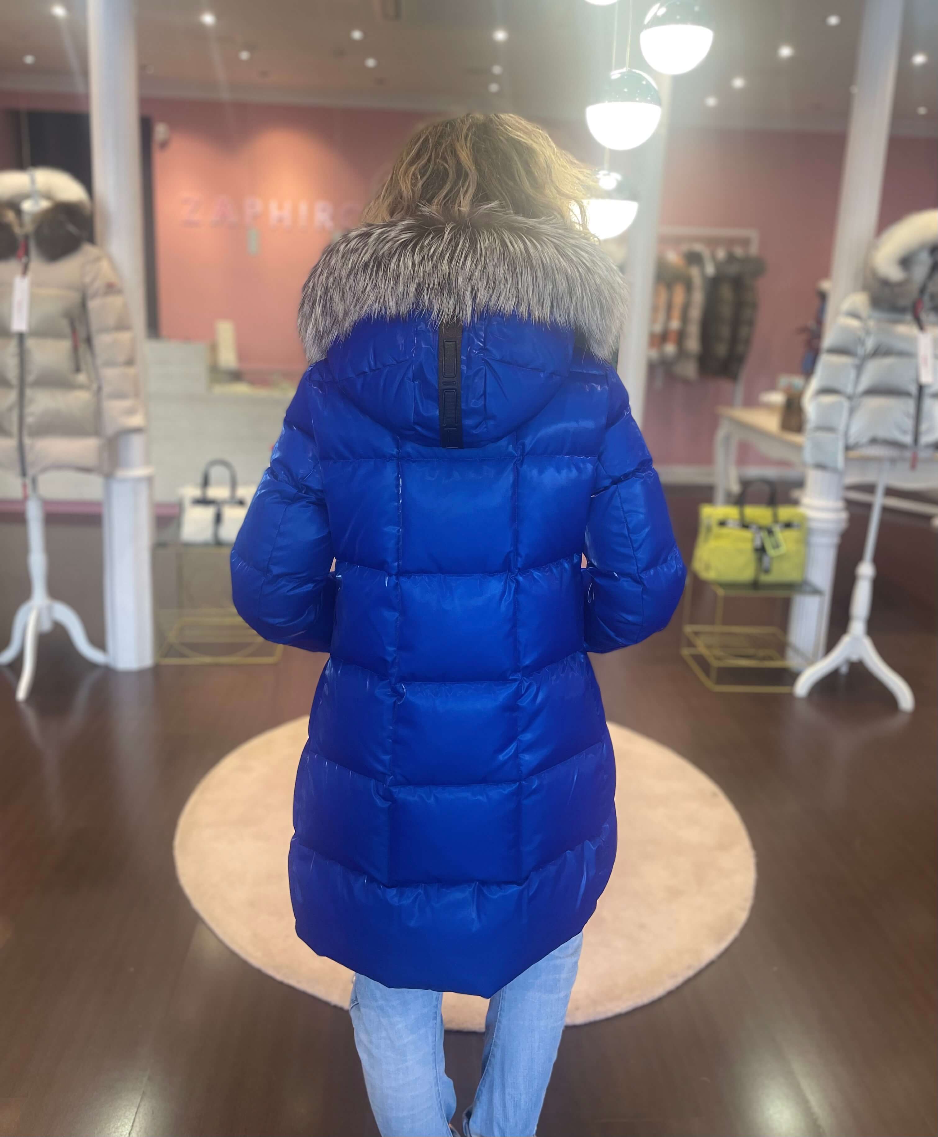 Plumífero Dichi Alsacia en color azul Klein con pelo natural desmontable.