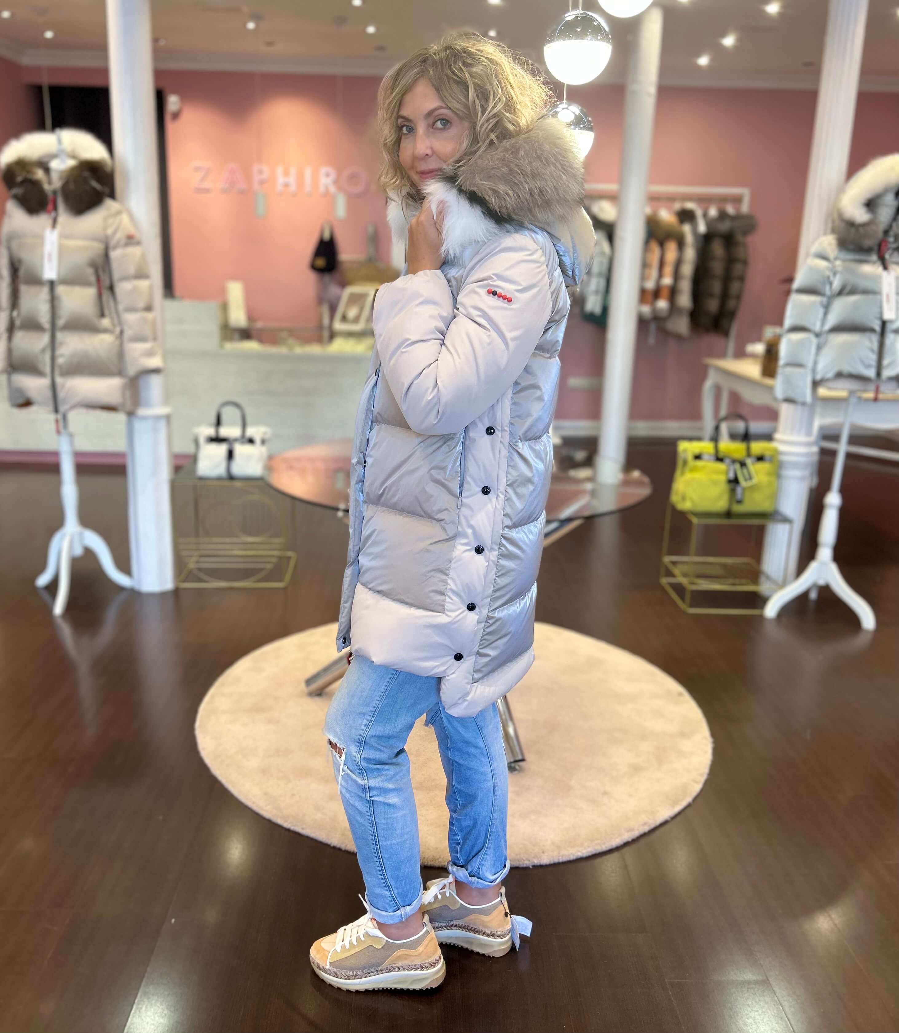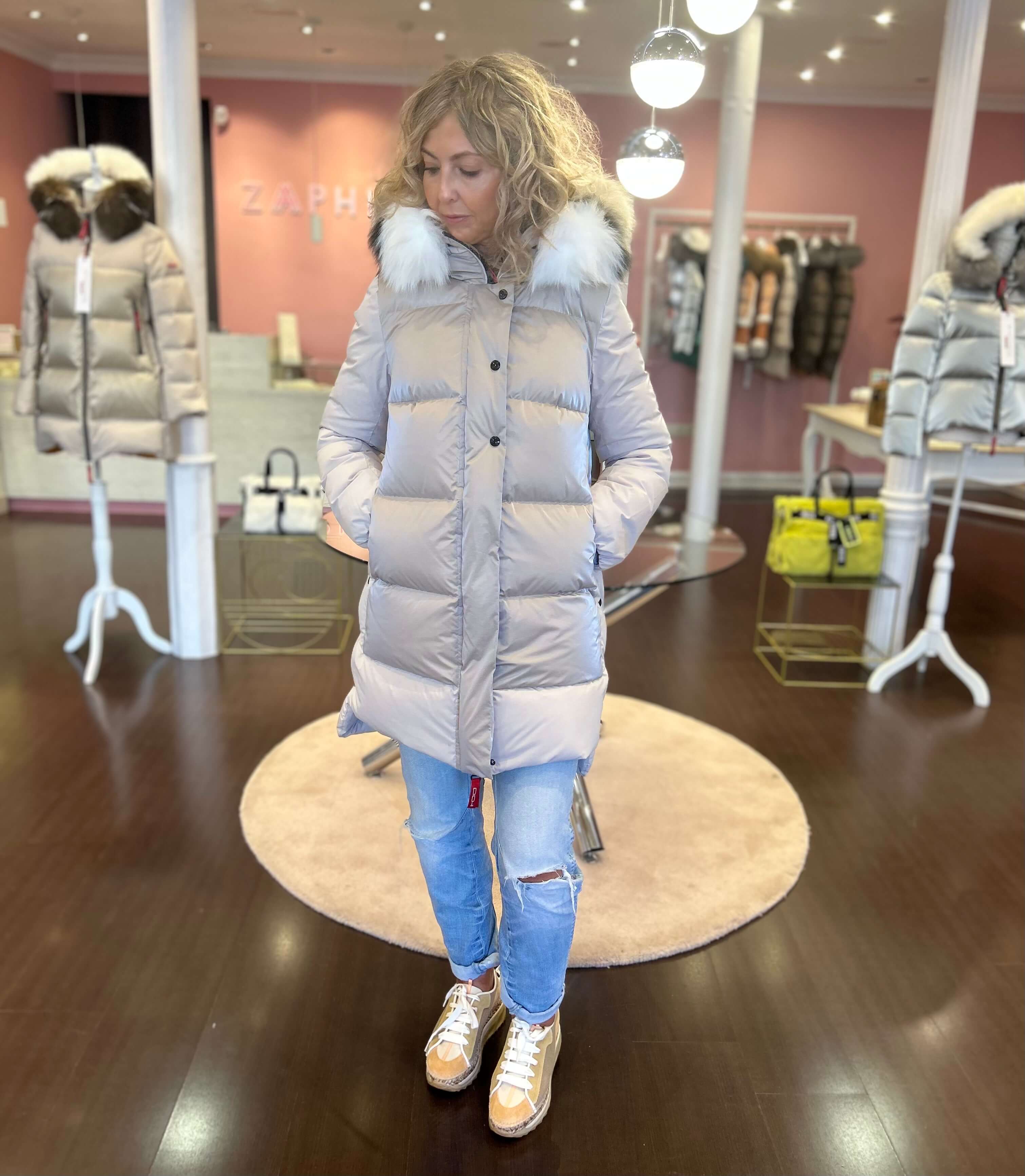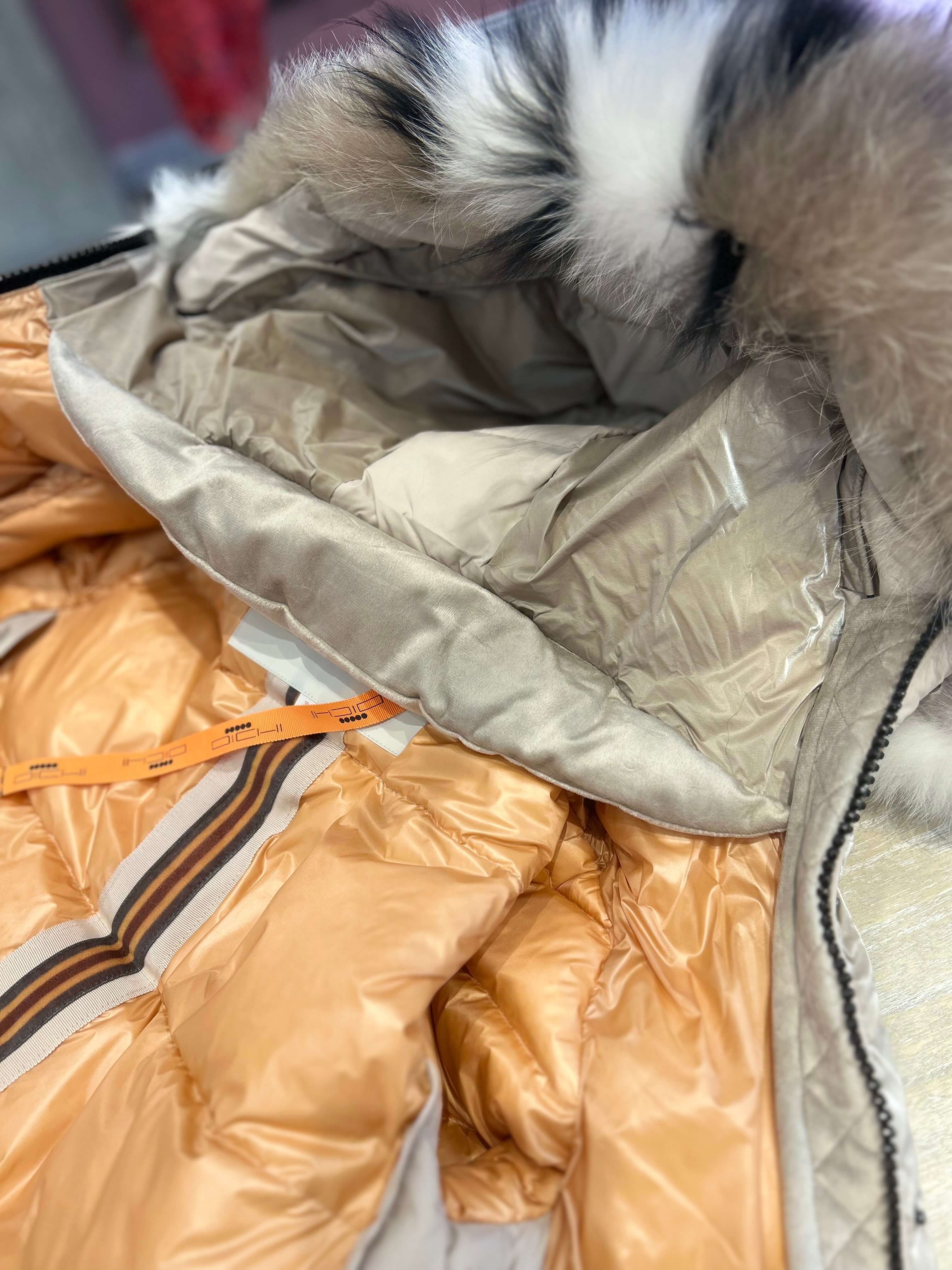 Plumífero Dichi Arandi en tono beige y con pelo natural desmontable. El plumífero Dichi Arandi es un abrigo elegante y funcional, con relleno de 90 % plumón de pato.