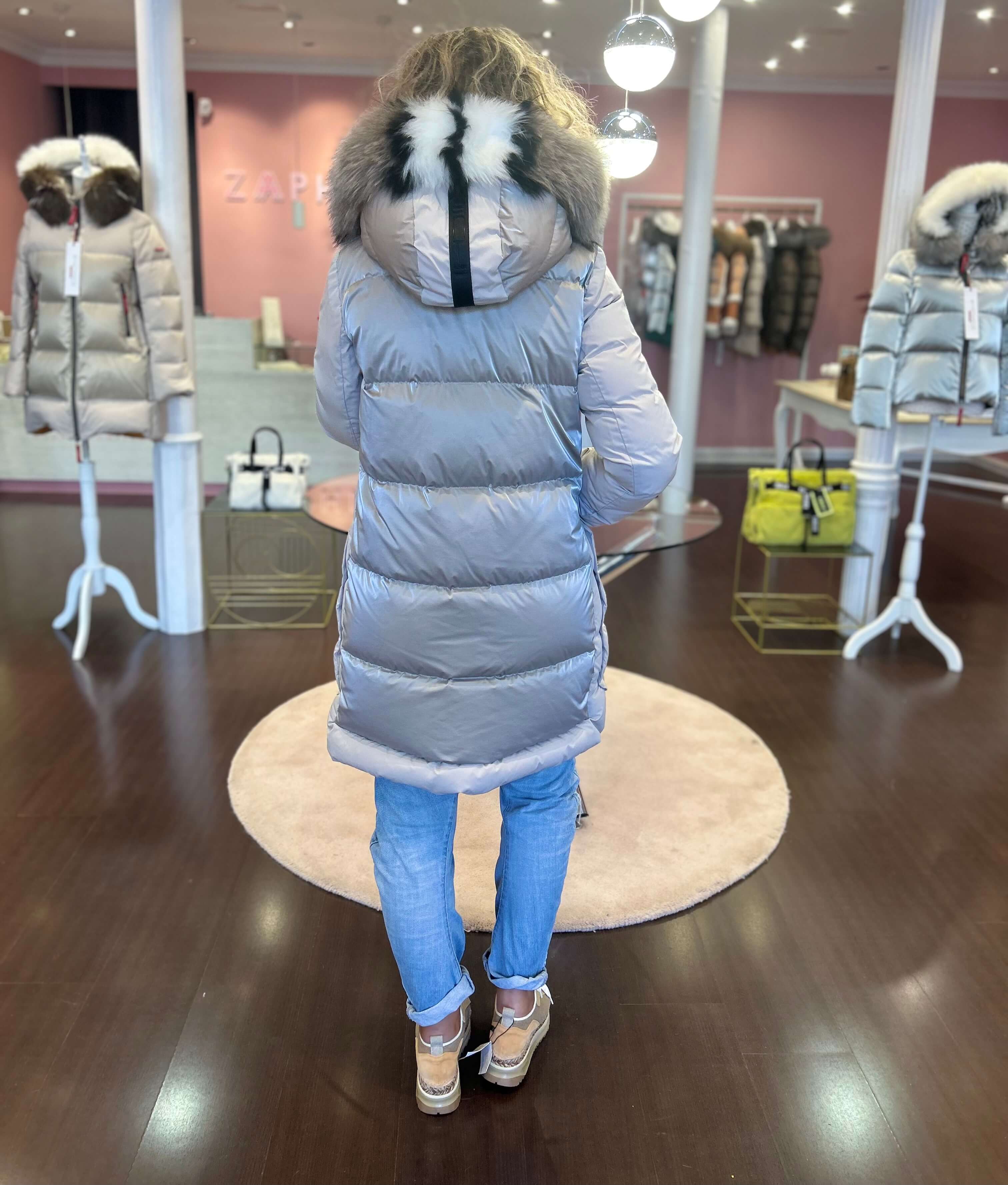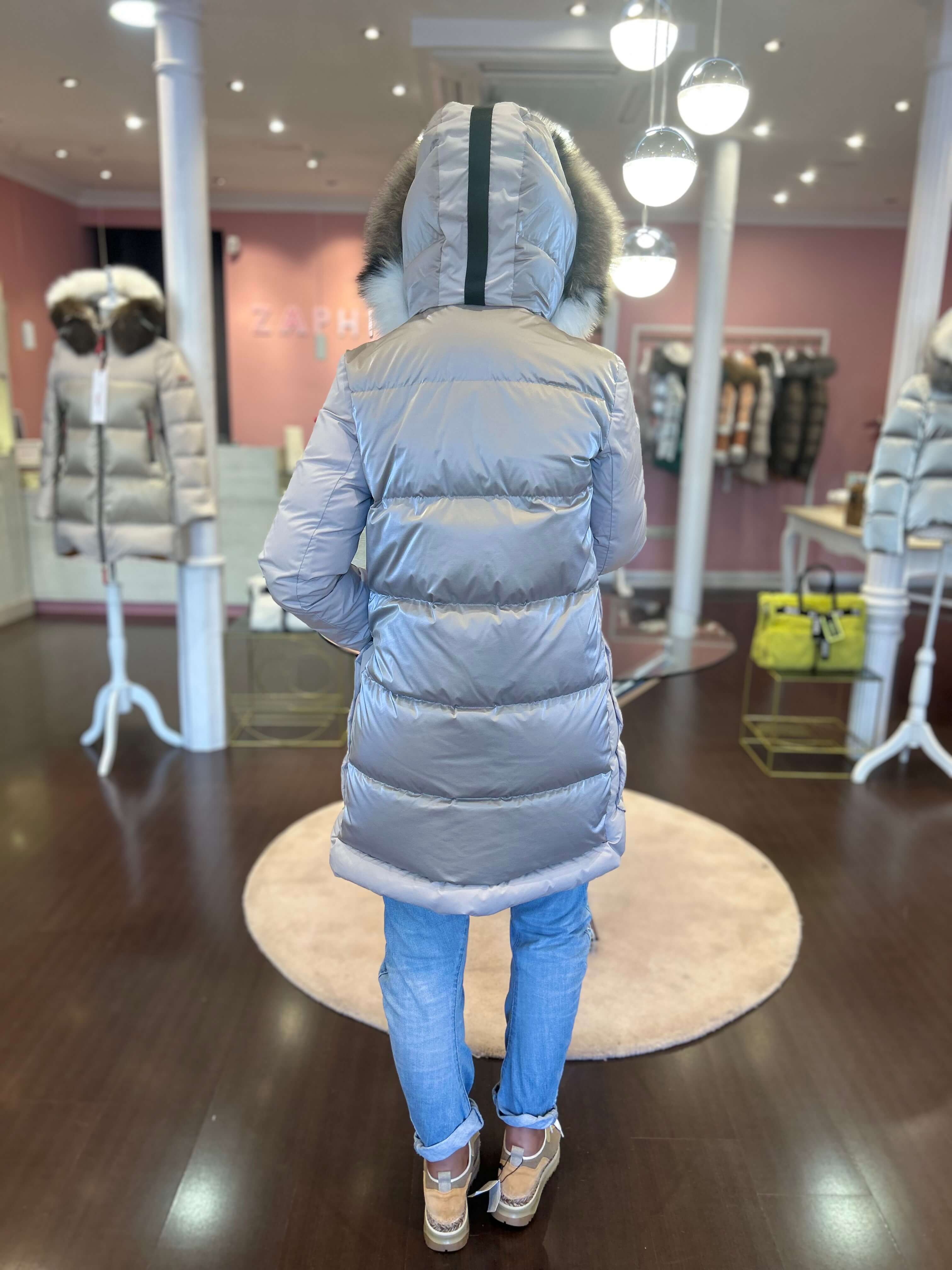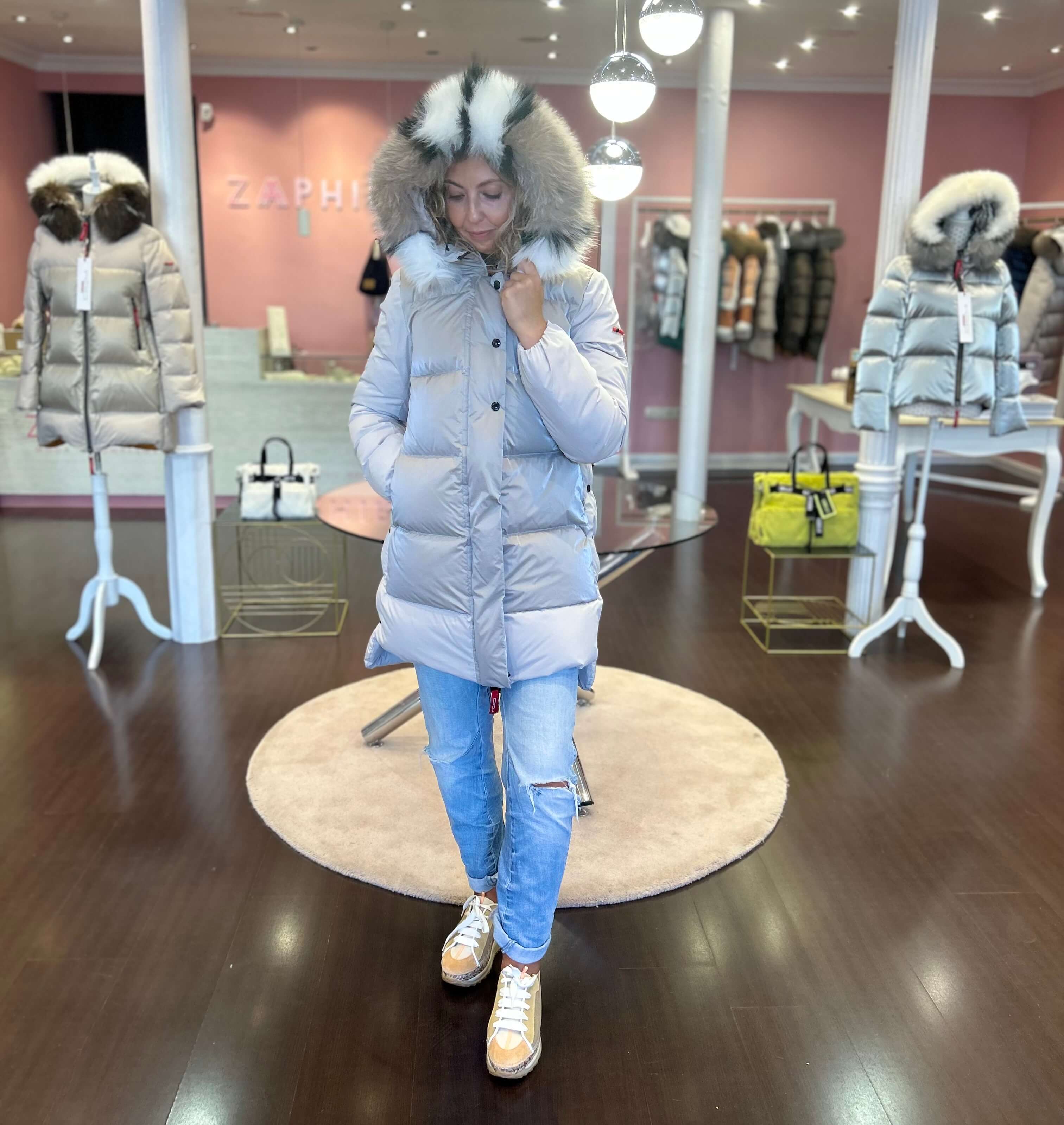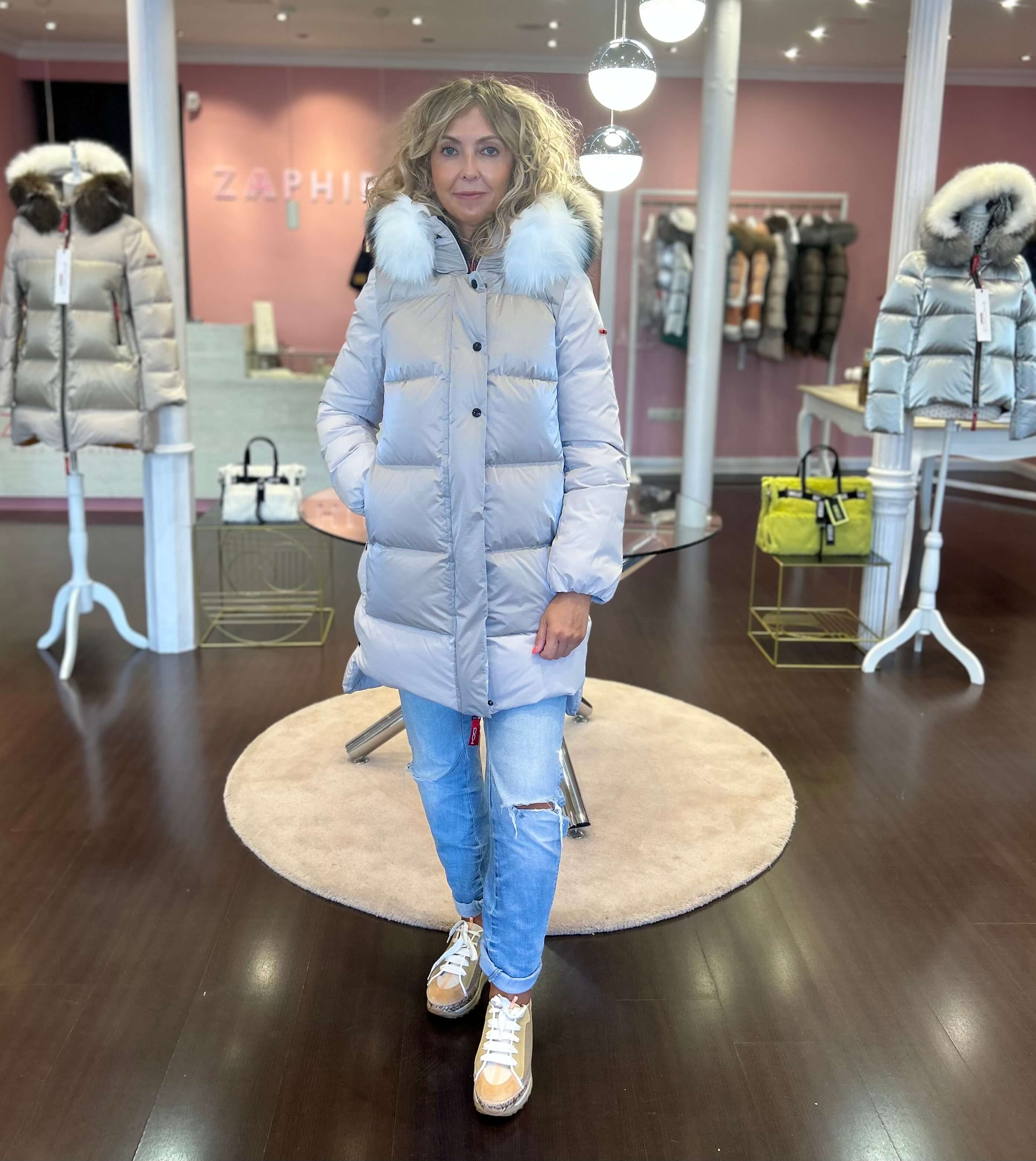 Plumífero Dichi Arandi en tono beige y con pelo natural desmontable. El plumífero Dichi Arandi es un abrigo elegante y funcional, con relleno de 90 % plumón de pato.