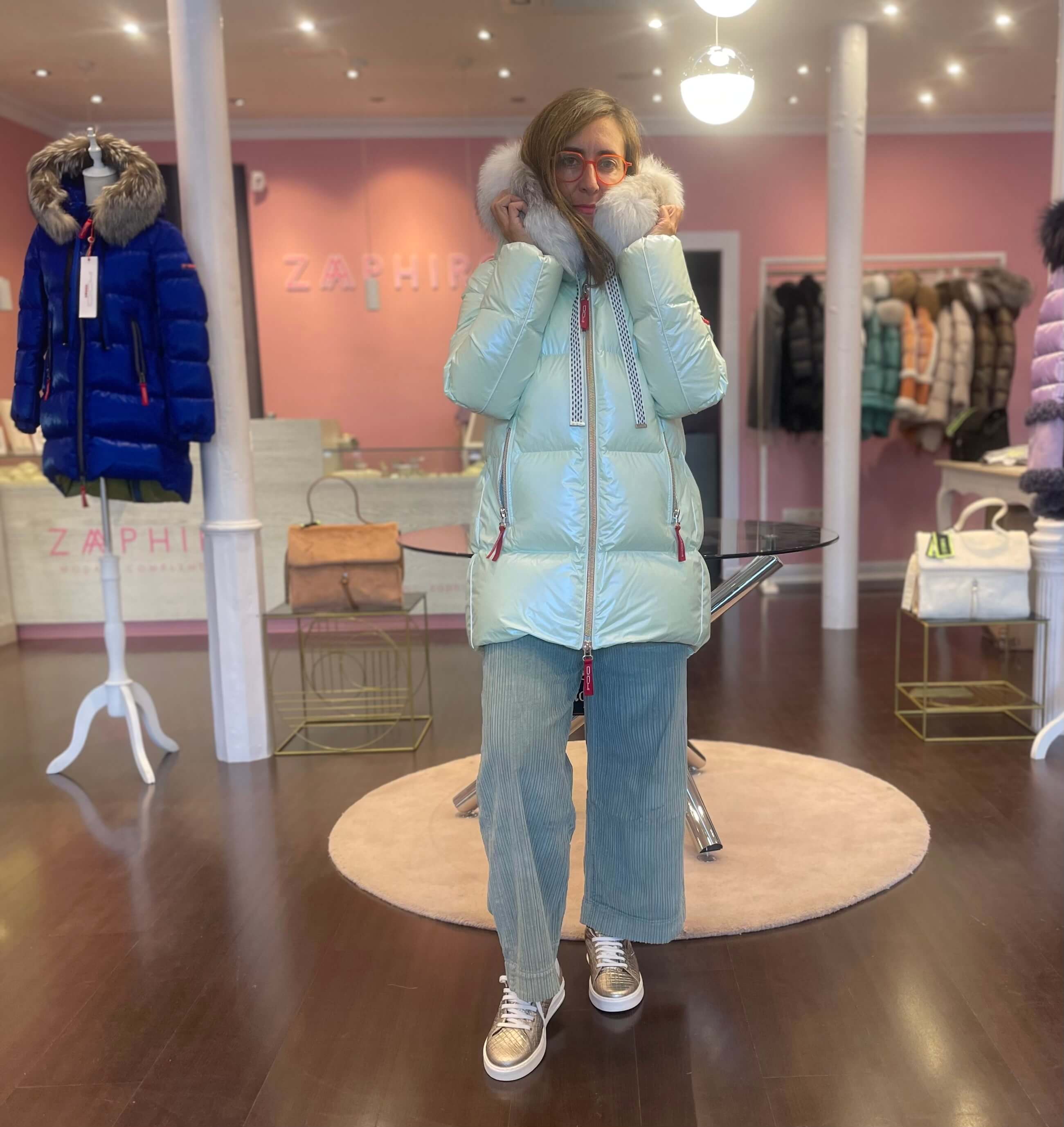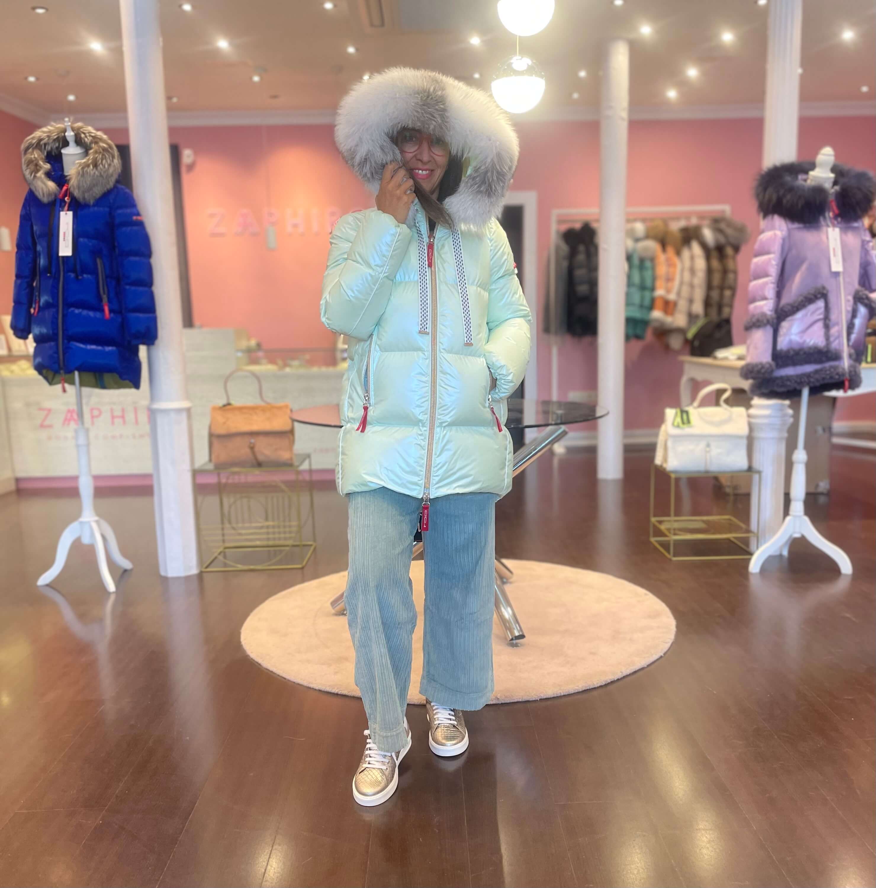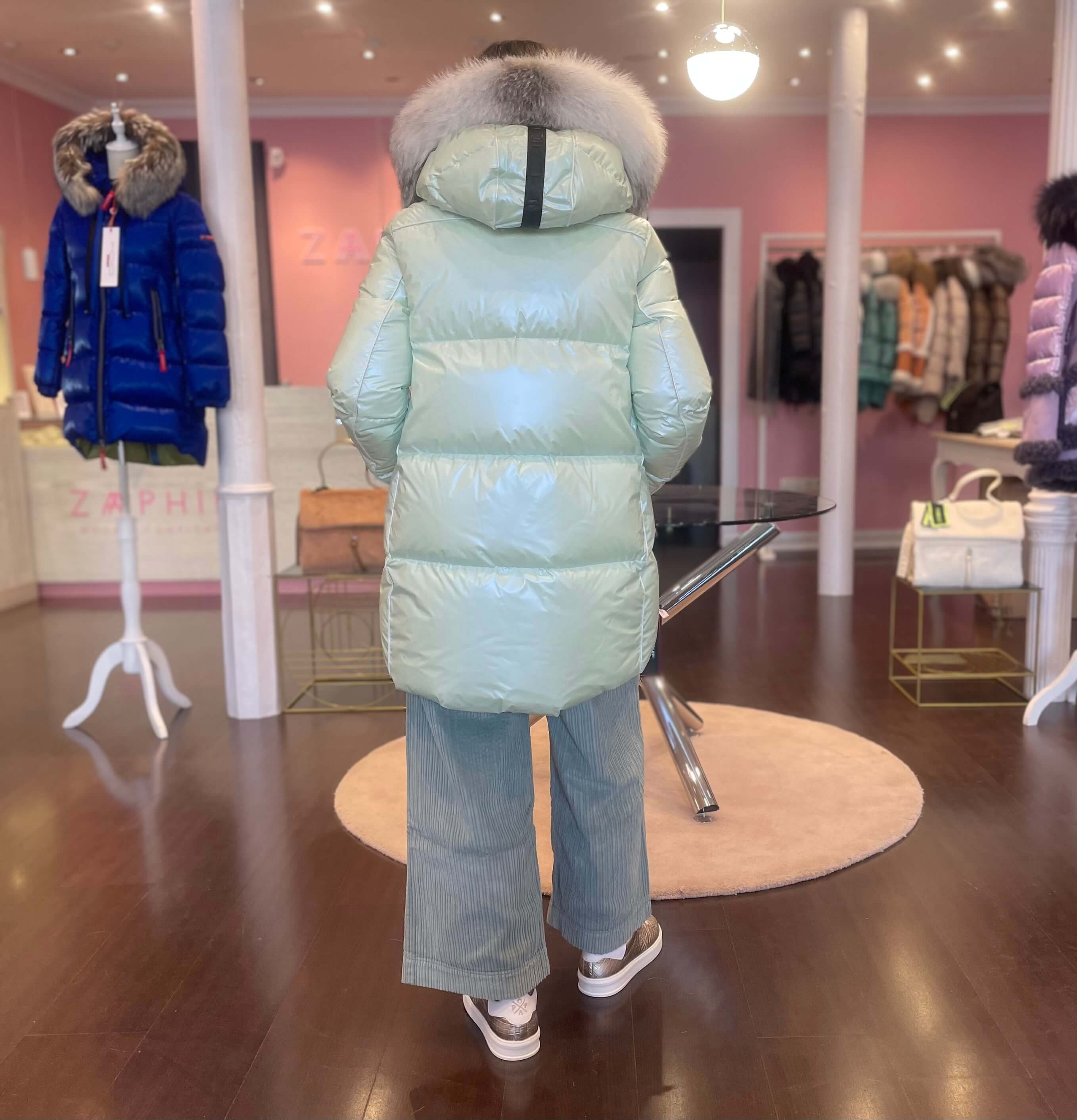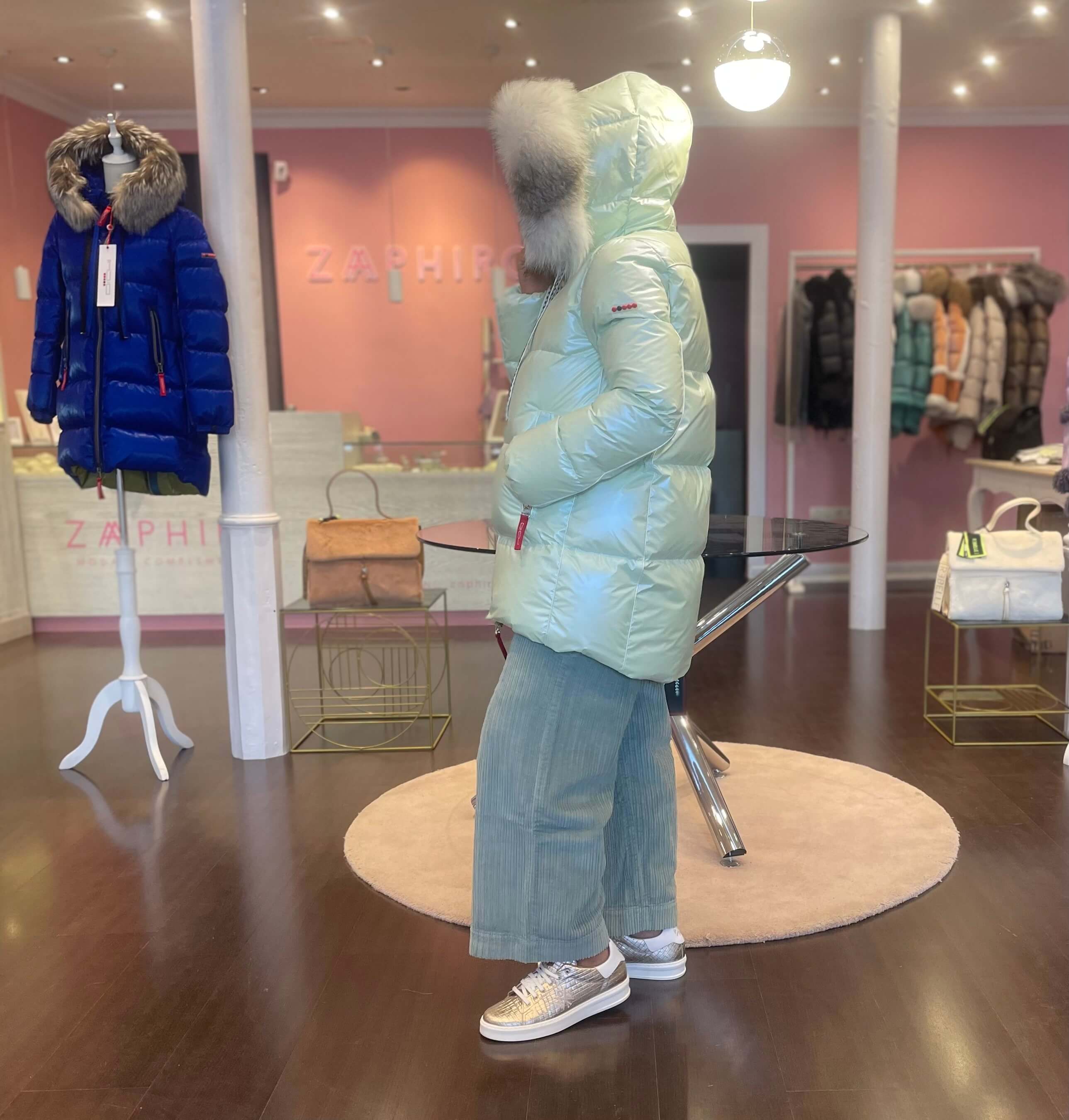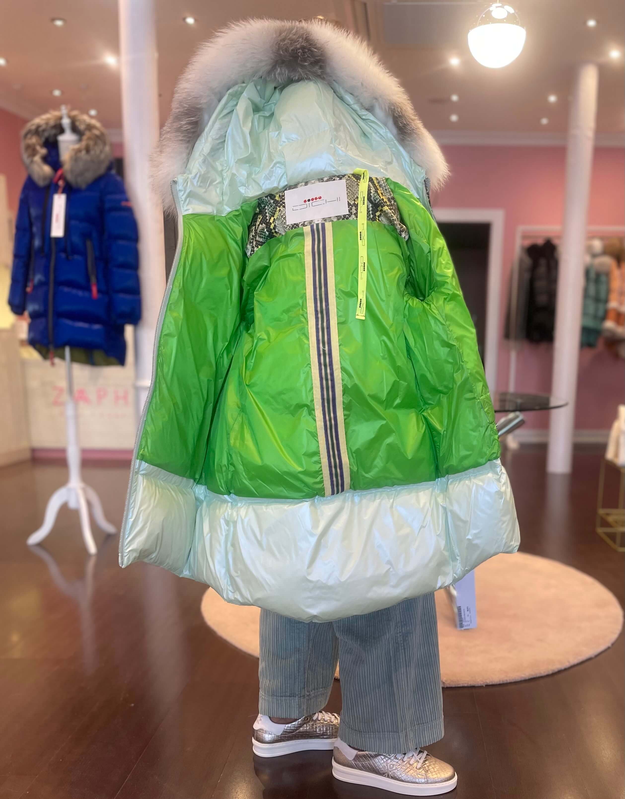 Plumífero Dichi Bianca en color lima claro y con pelo natural blanco desmontable.