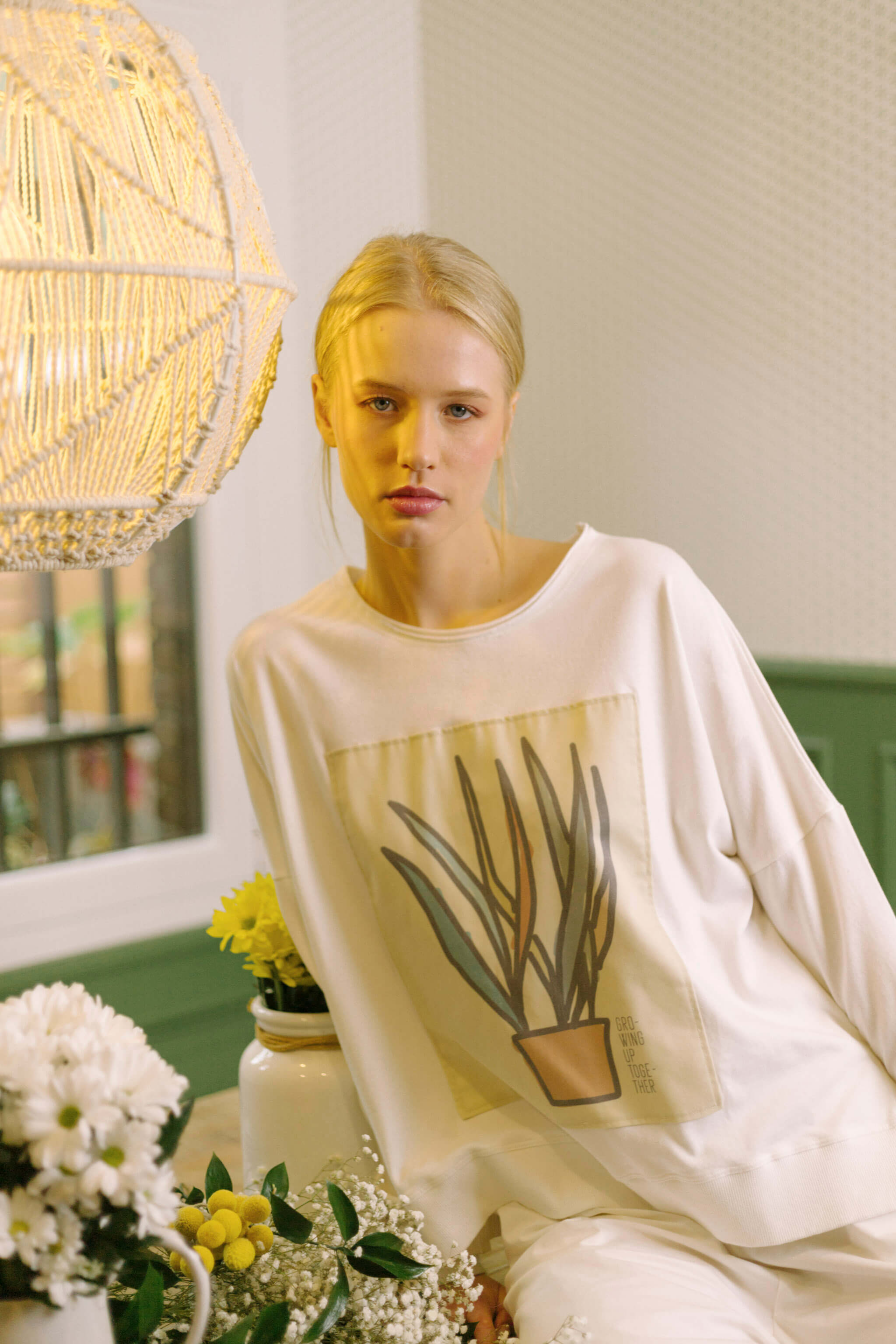 Sudadera Pan Producto Basico maceta de algodón blanco con dibujo en parte delantera.