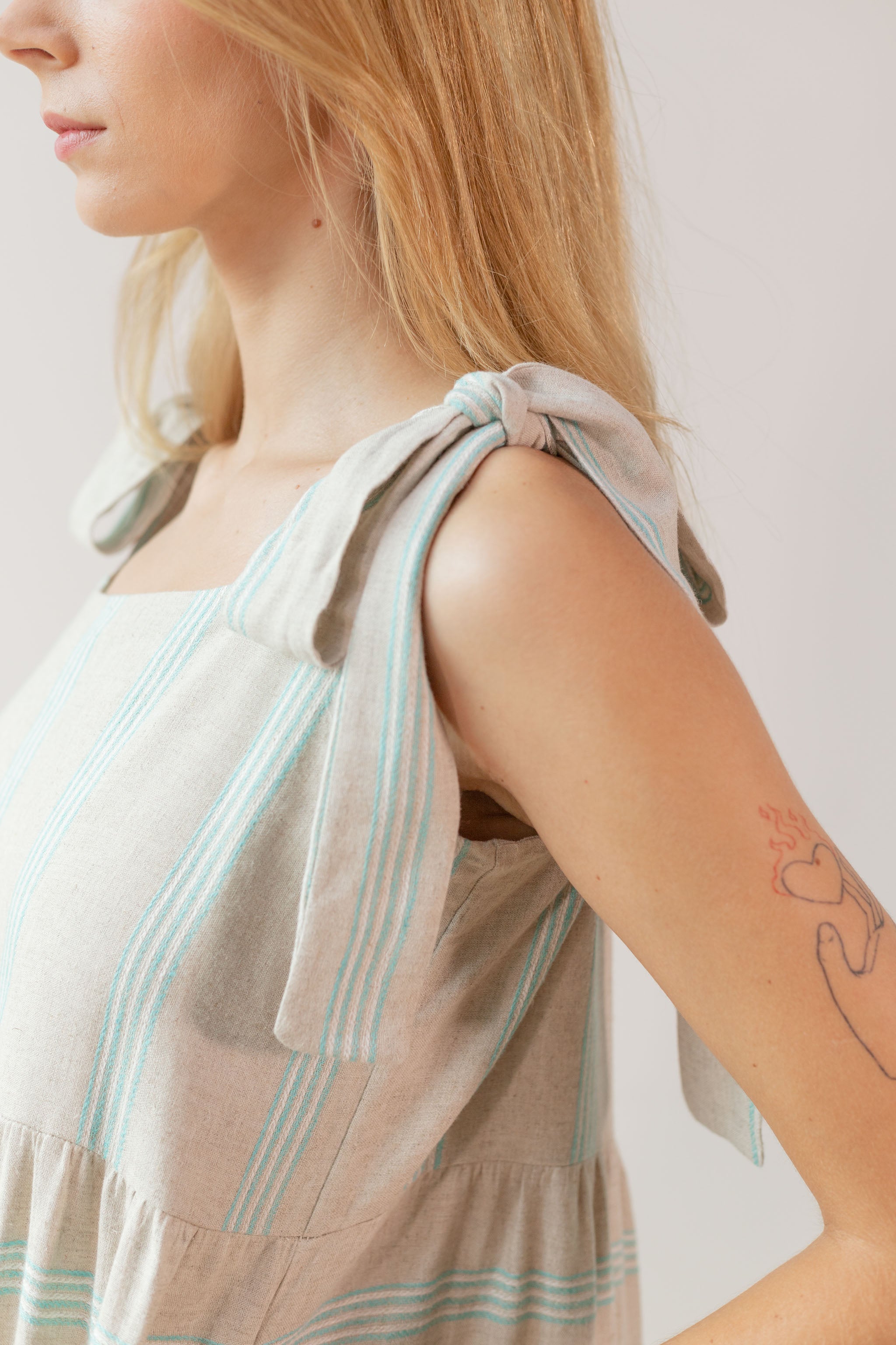 Vestido PAN con rayas en tono azul, tirantes ajustables y bolsillos.