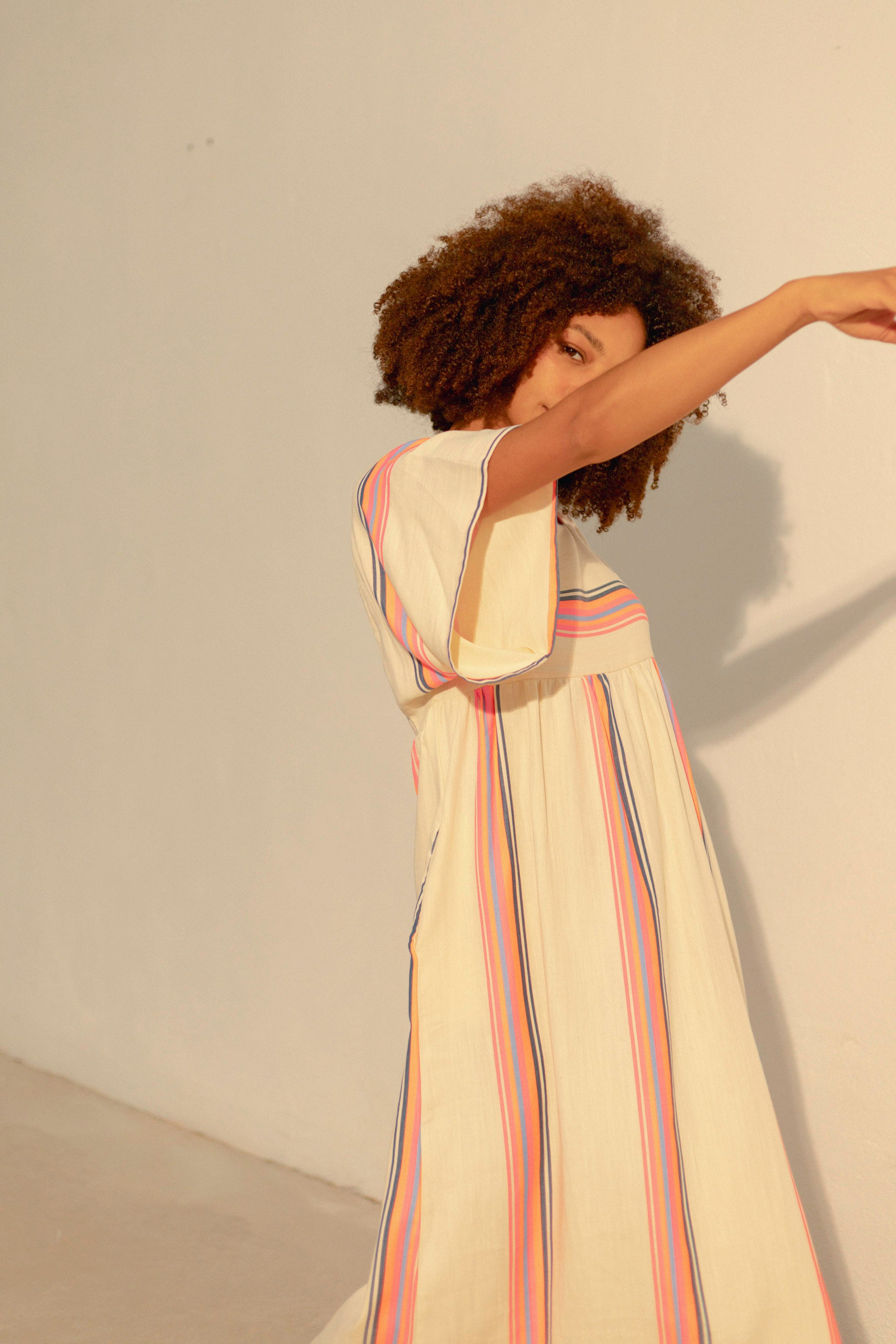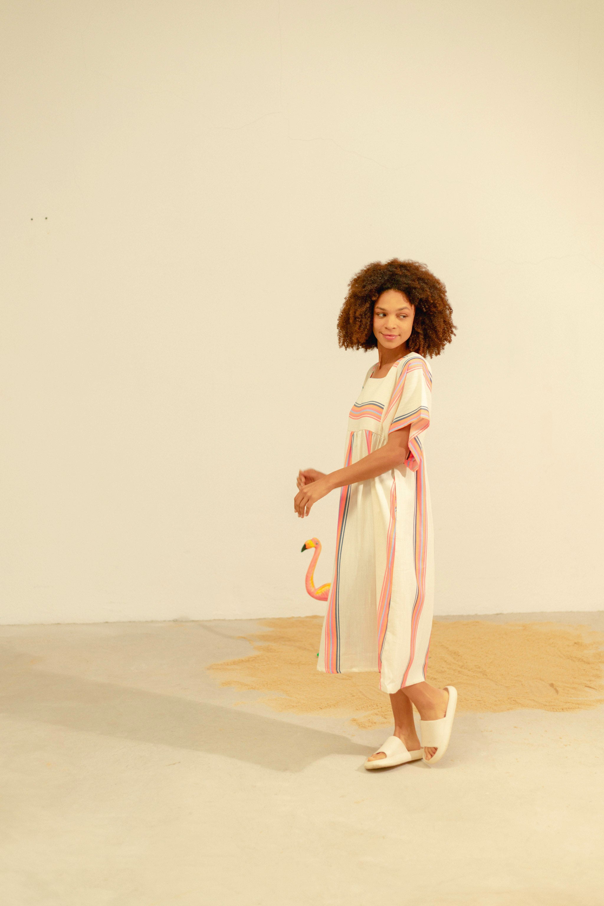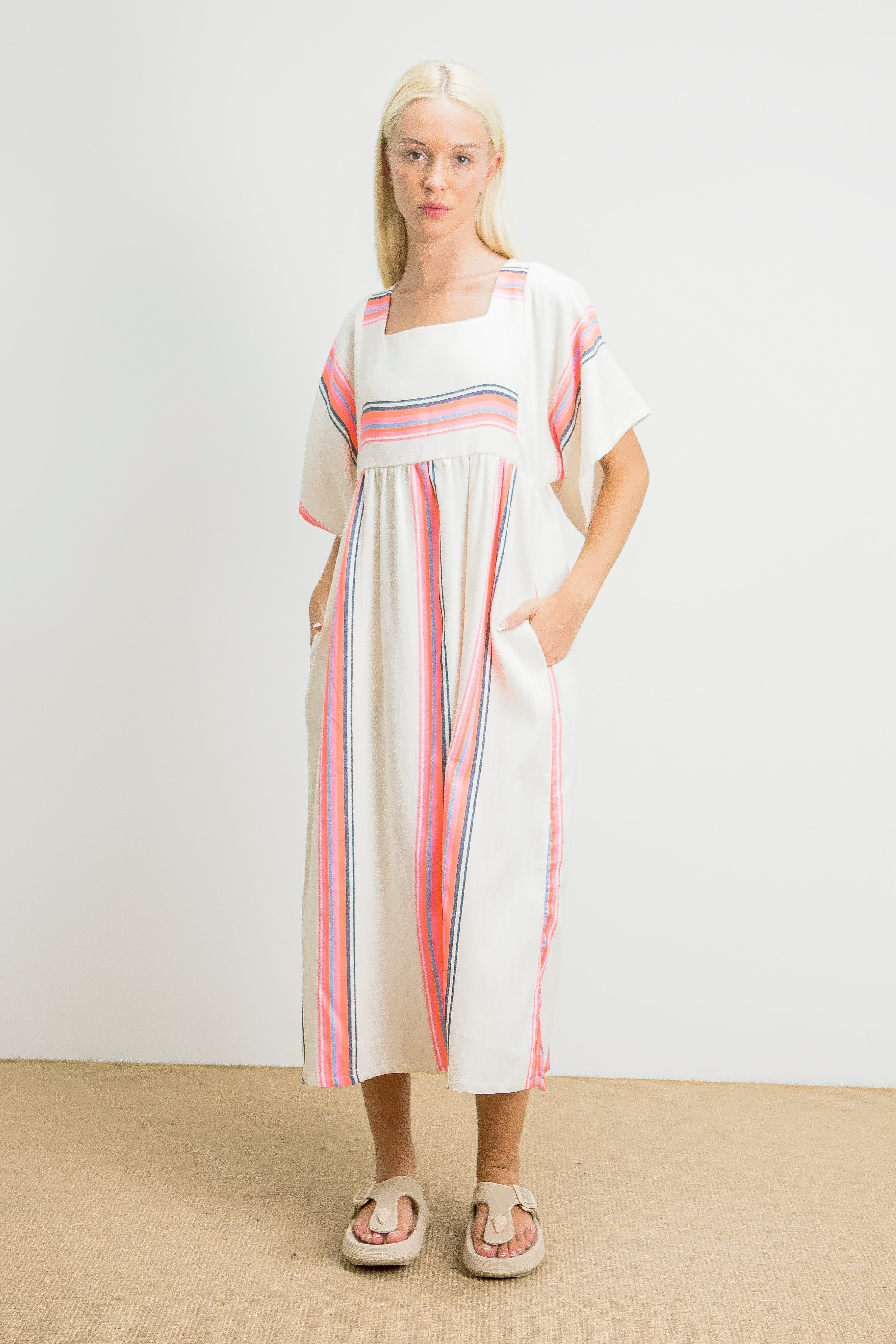 Vestido Pan Producto Basico con rayas en tono rosa flúor y con bolsillos.