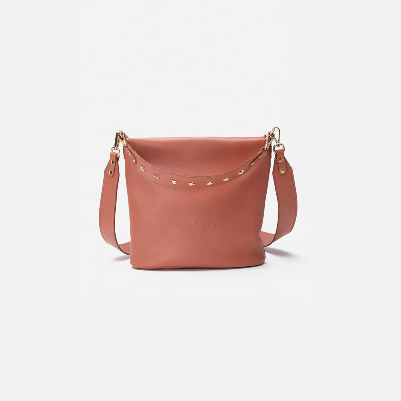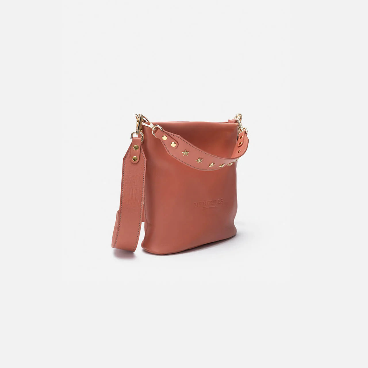 Bolso MERCULES Tango de piel en color terracota, con doble asa , el asa más corta con estrellas doradas