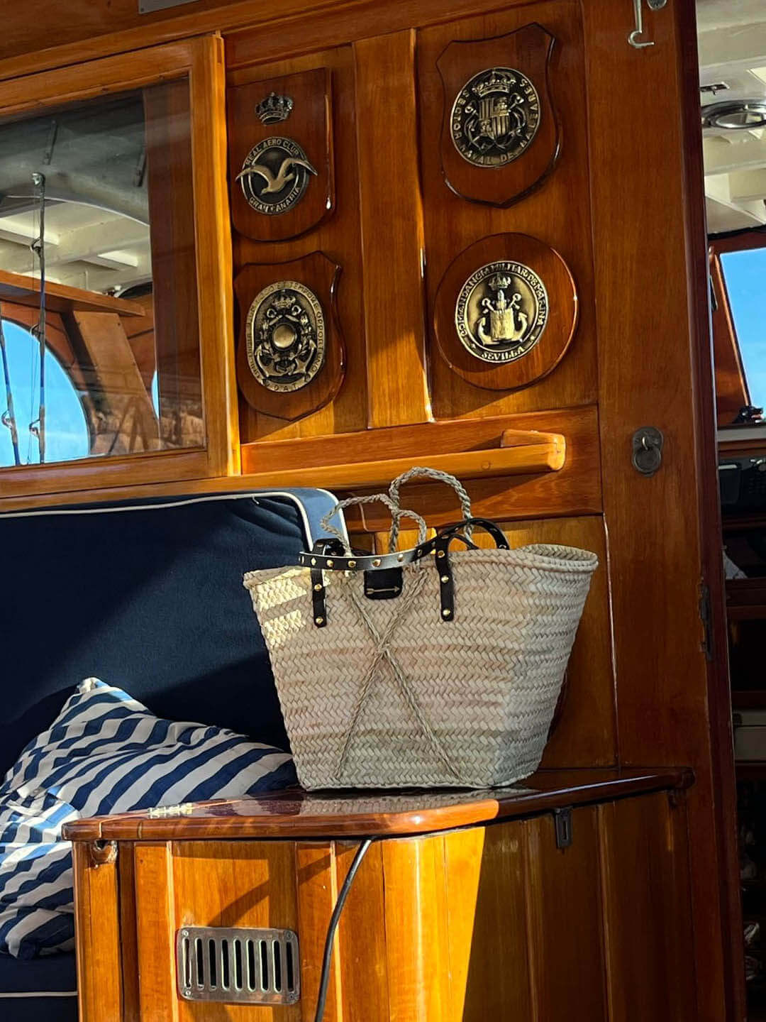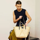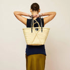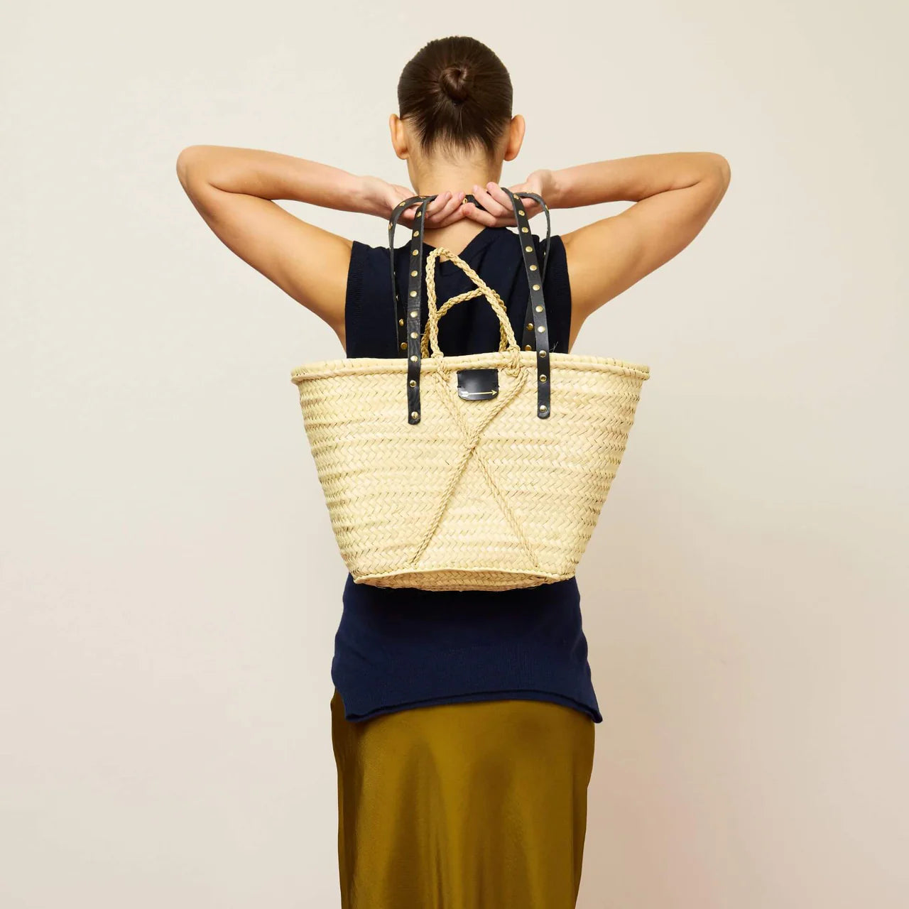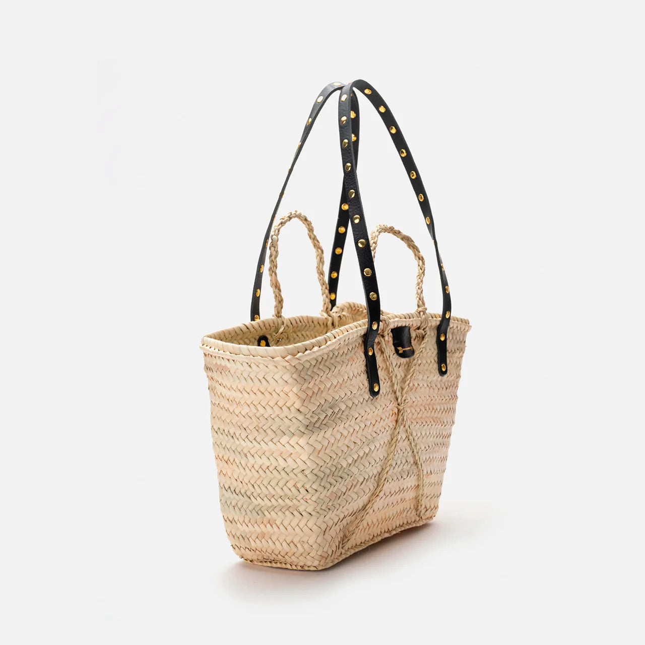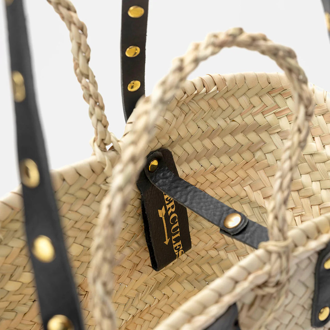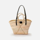 Capazo MERCULES Basket con tiras de piel negra con tachuelas. Hecho de hoja de palma y correas de piel
