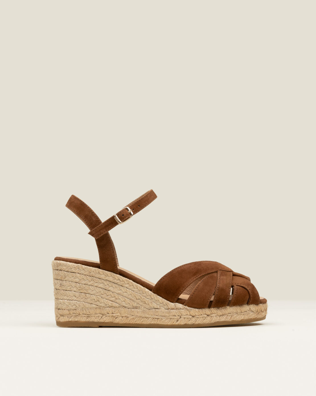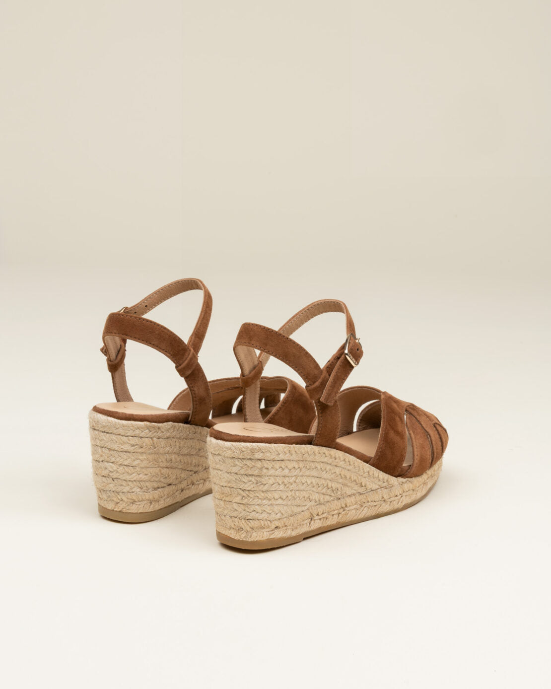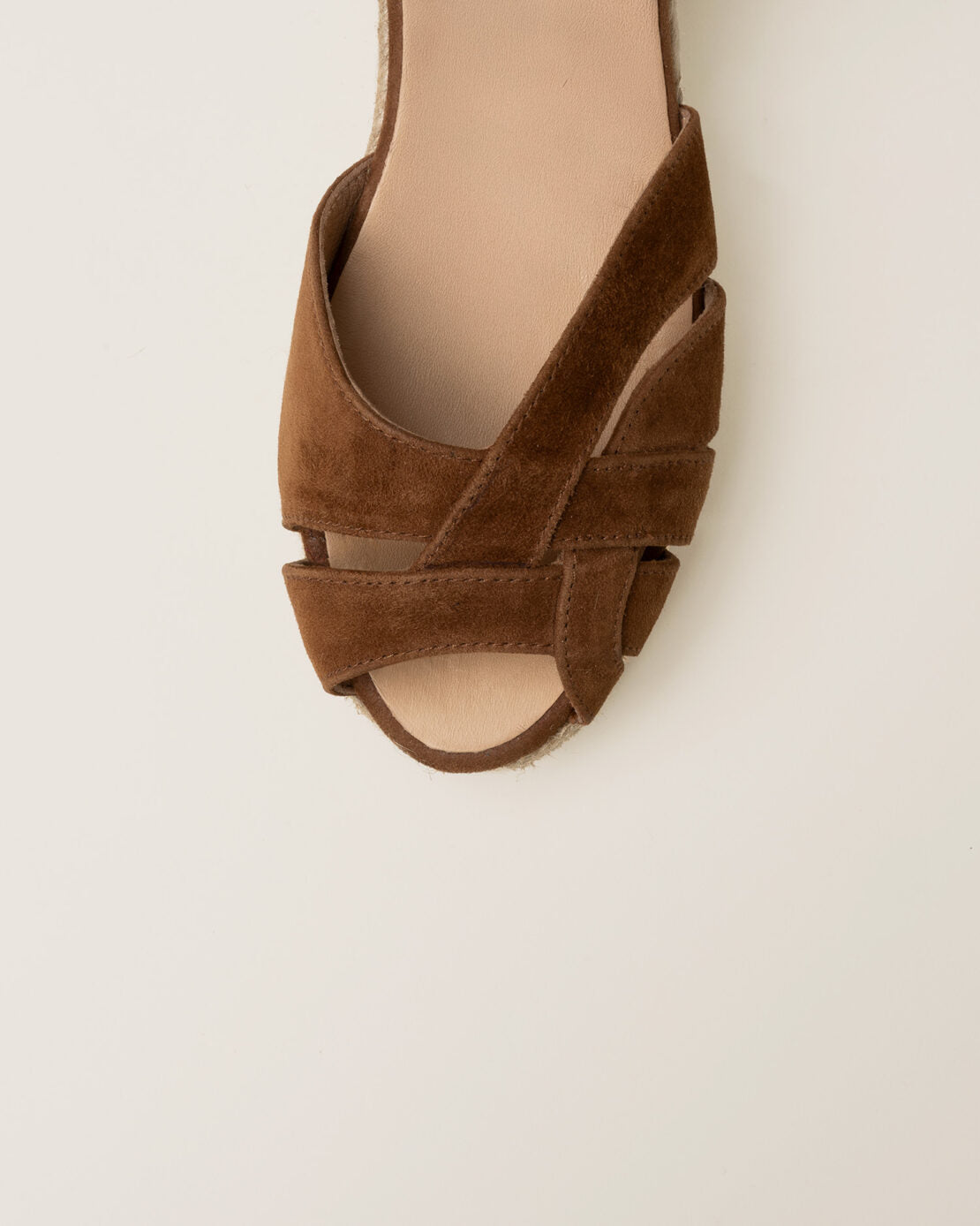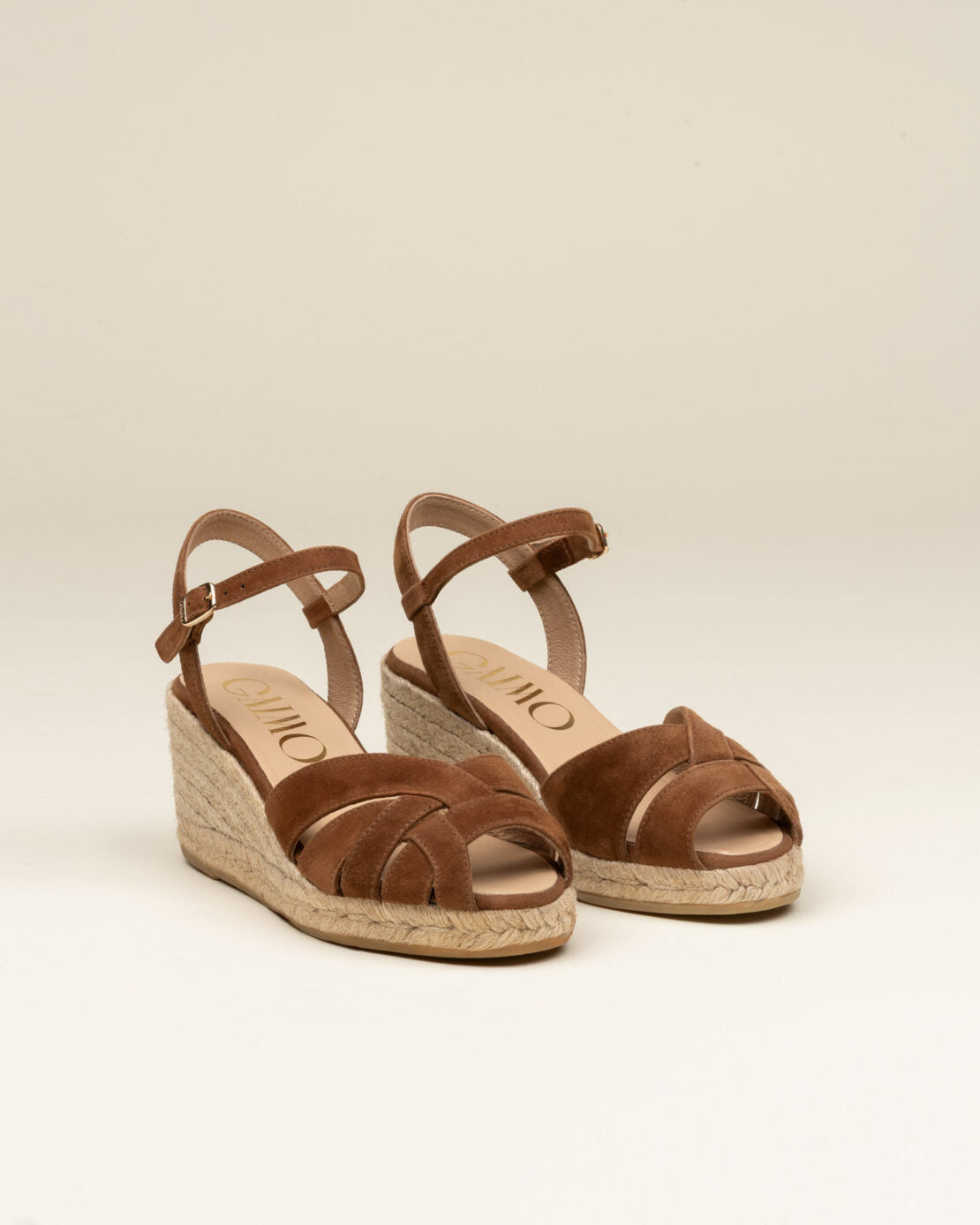Alpargata GAIMO Terra en ante en color marrón, de tiras entrelazadas, y cuña de yute de unos 6 cm.
