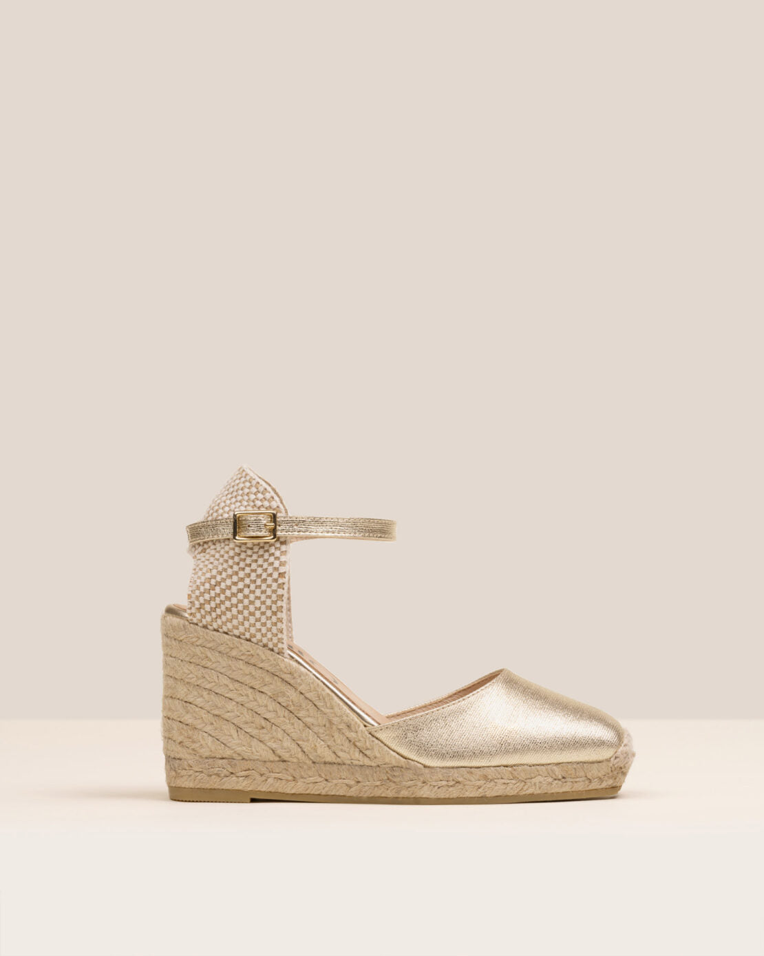 Alpargata GAIMO Yosie en piel dorada metalizada y puntera cuadrada, cuña de yute de 9cm aproximadamente