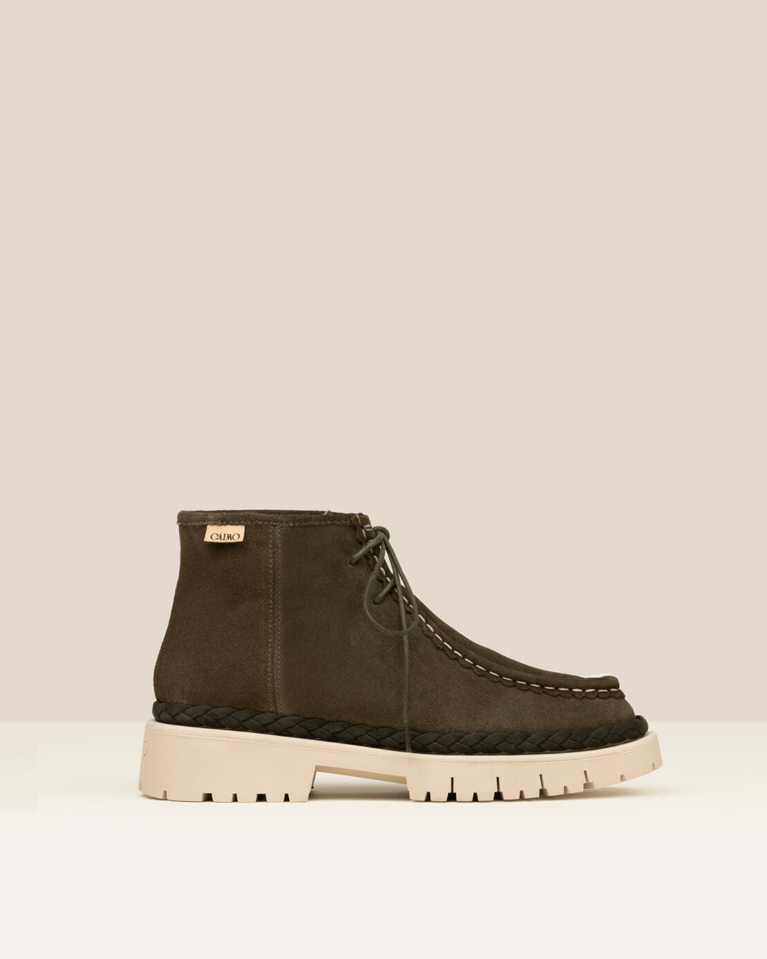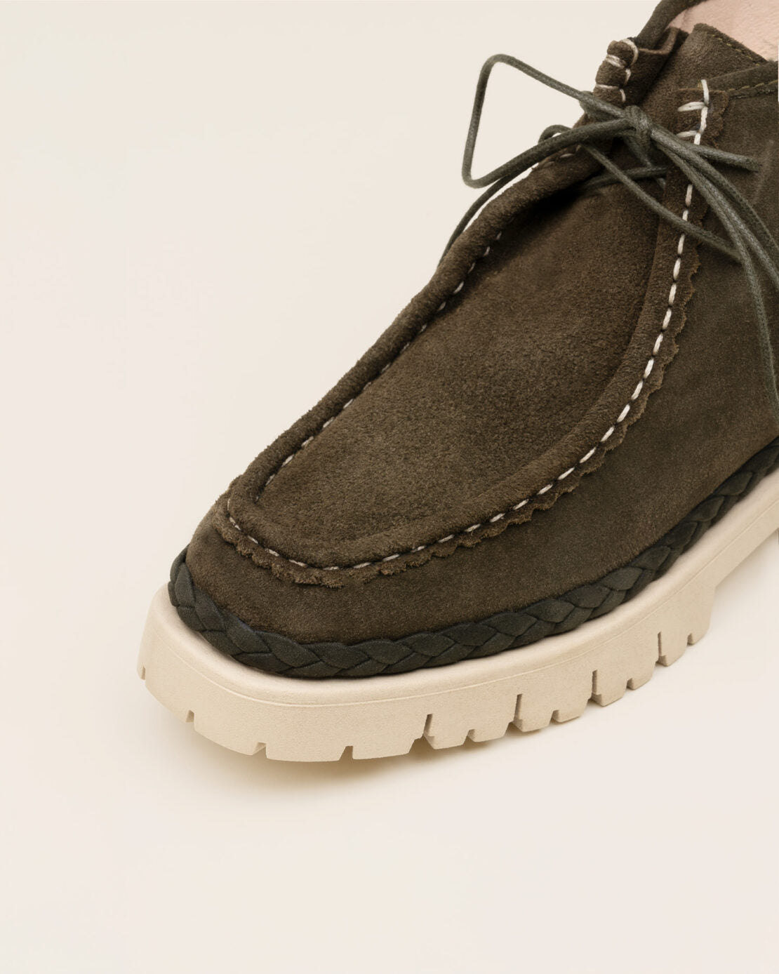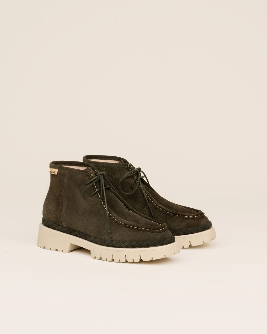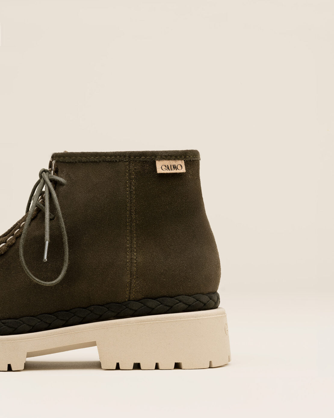 Botin Gaimo Caeli en piel color verde, suela truck y detalle trenzado.