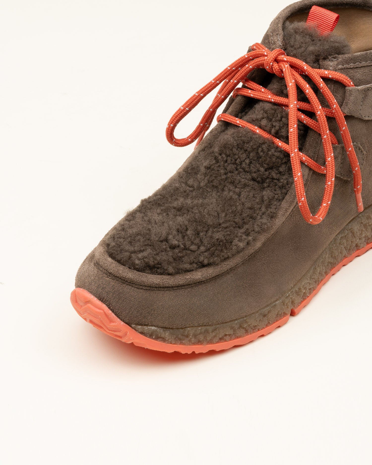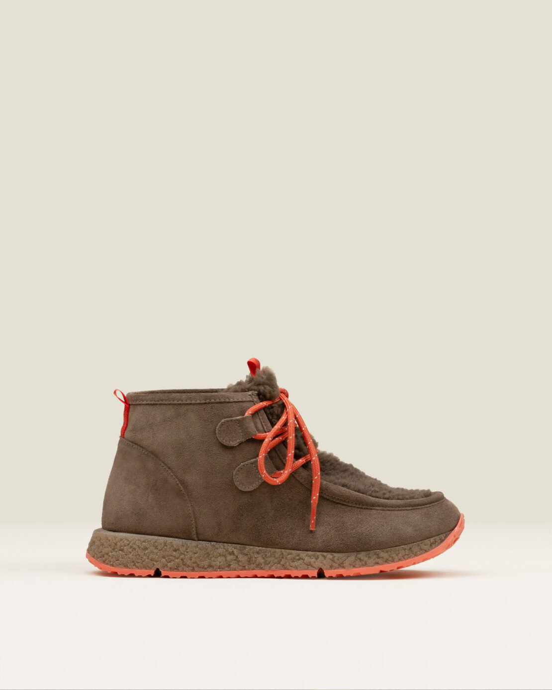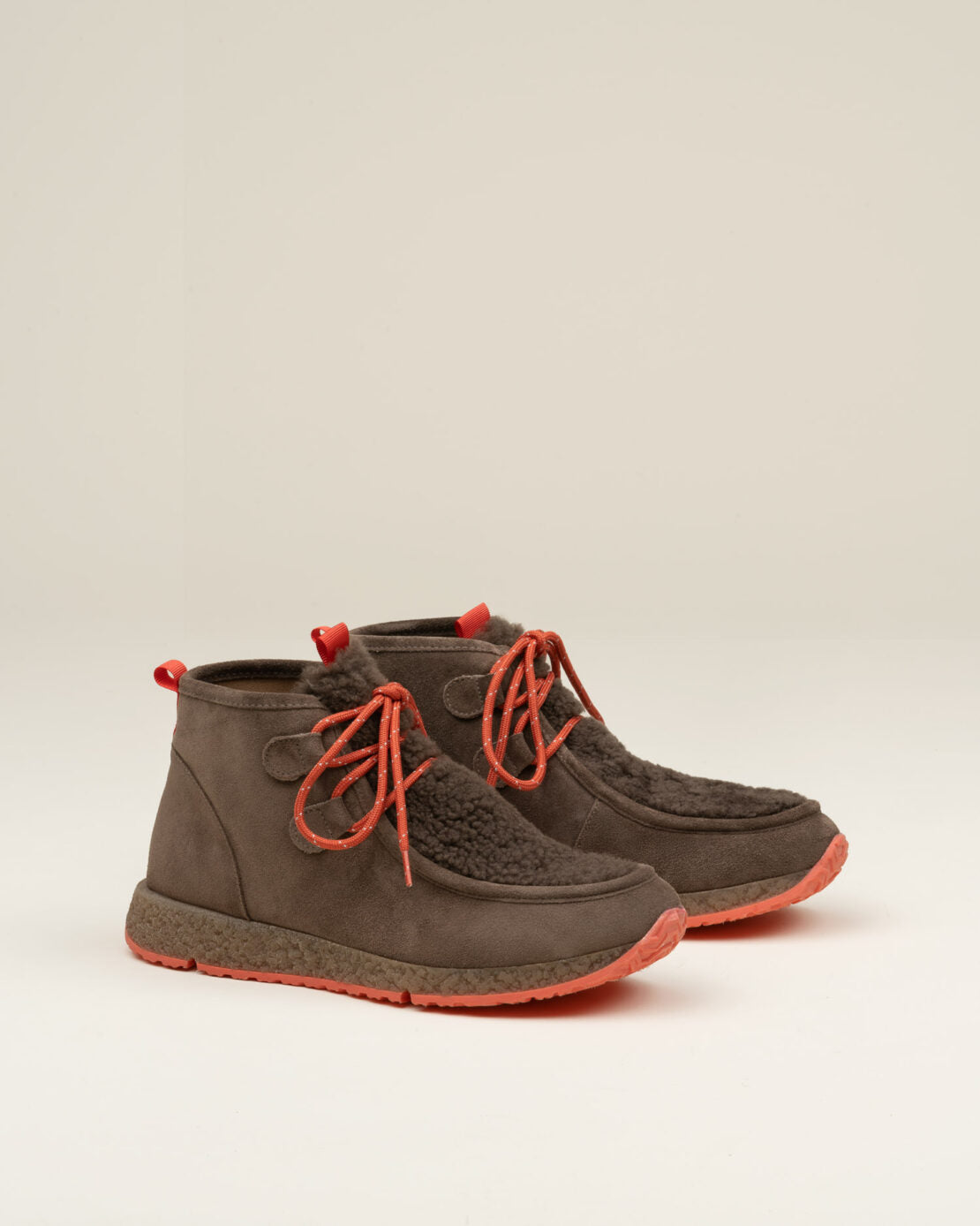 Botines GAIMO Prince de piel en tono marrón, con borreguito y cordones en color coral como la suela.