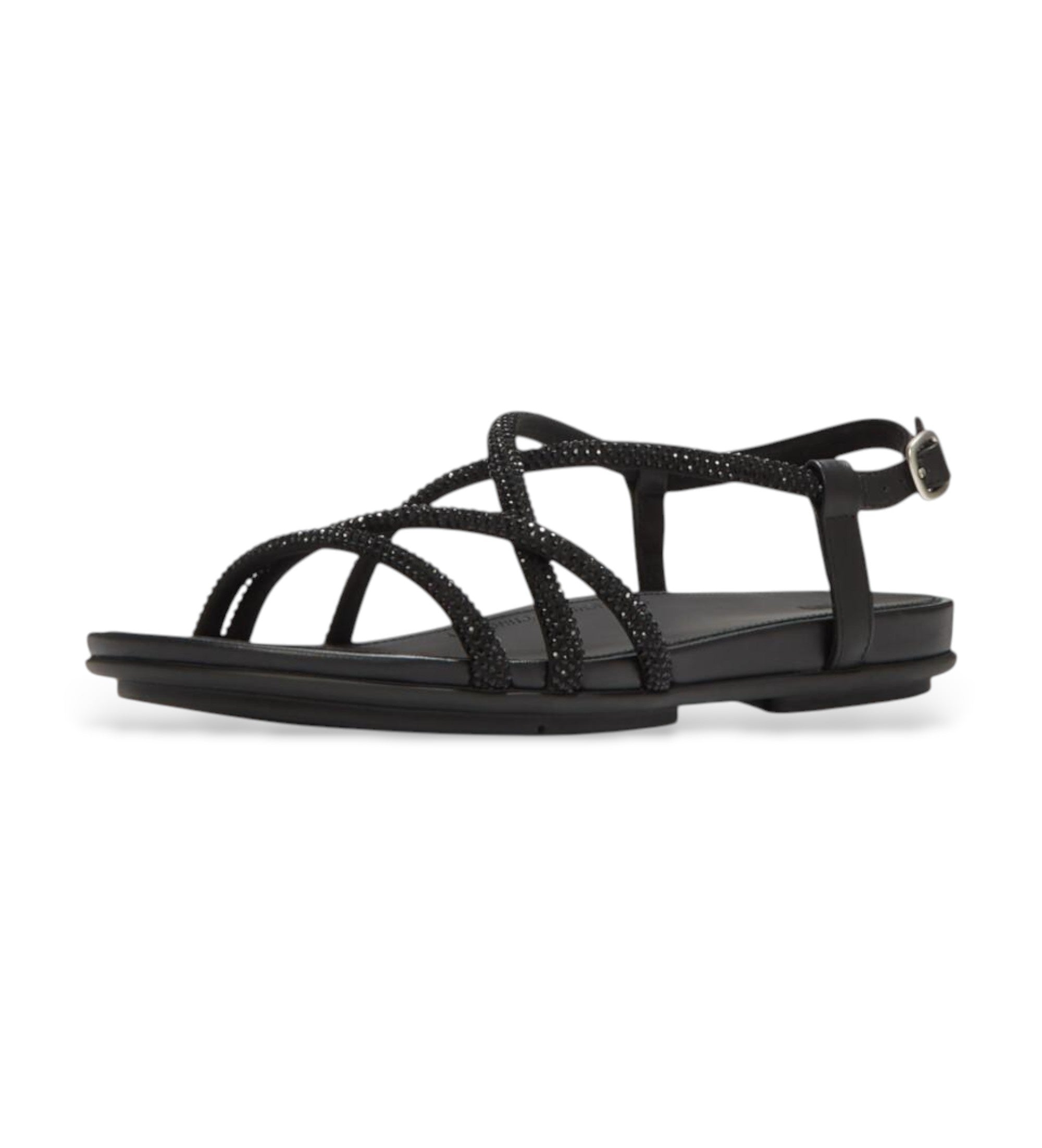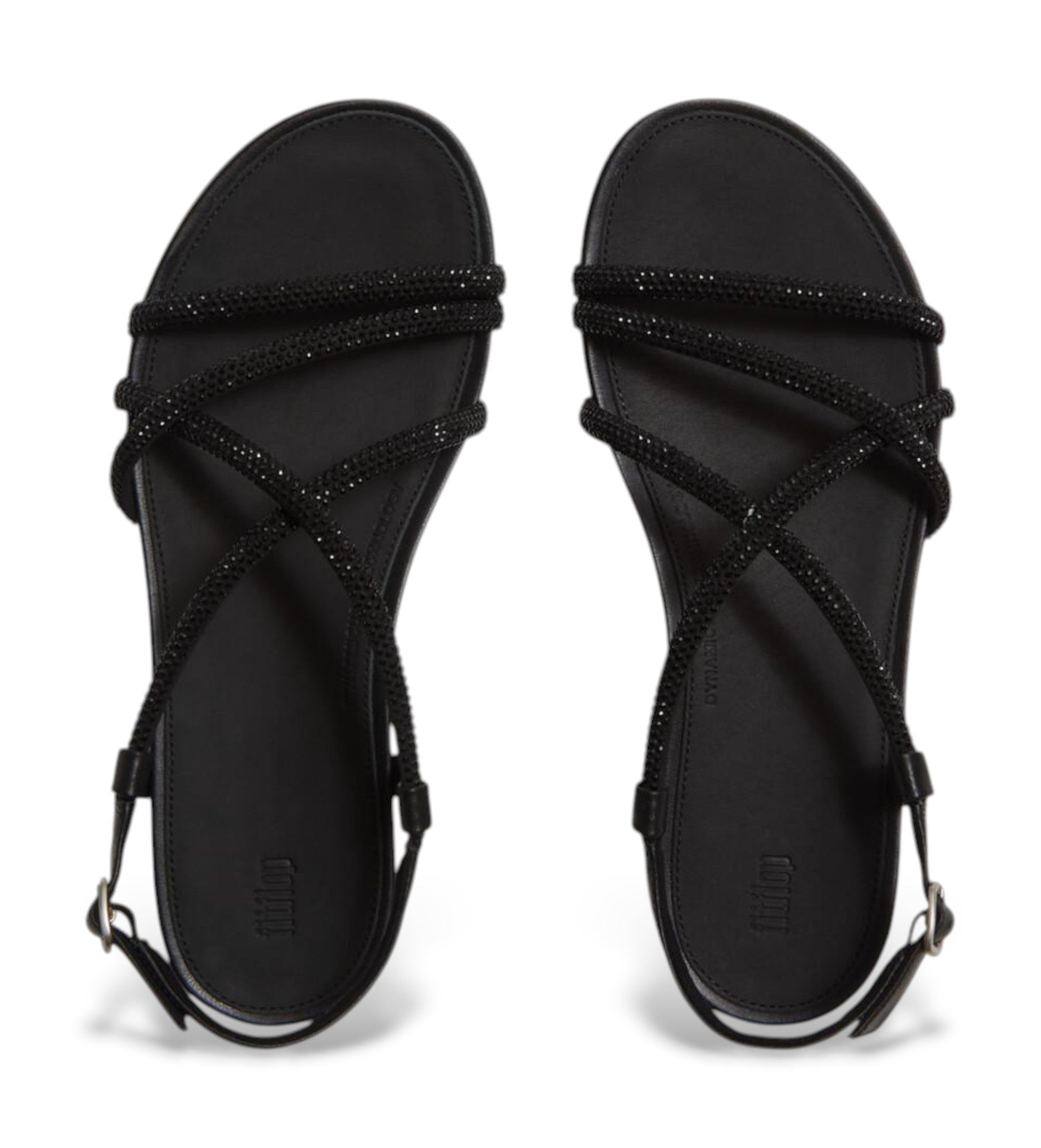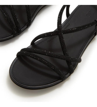 Sandalia FITFLOP Gracie negra de tiras de piel con cristales negros y cierre con hebilla.