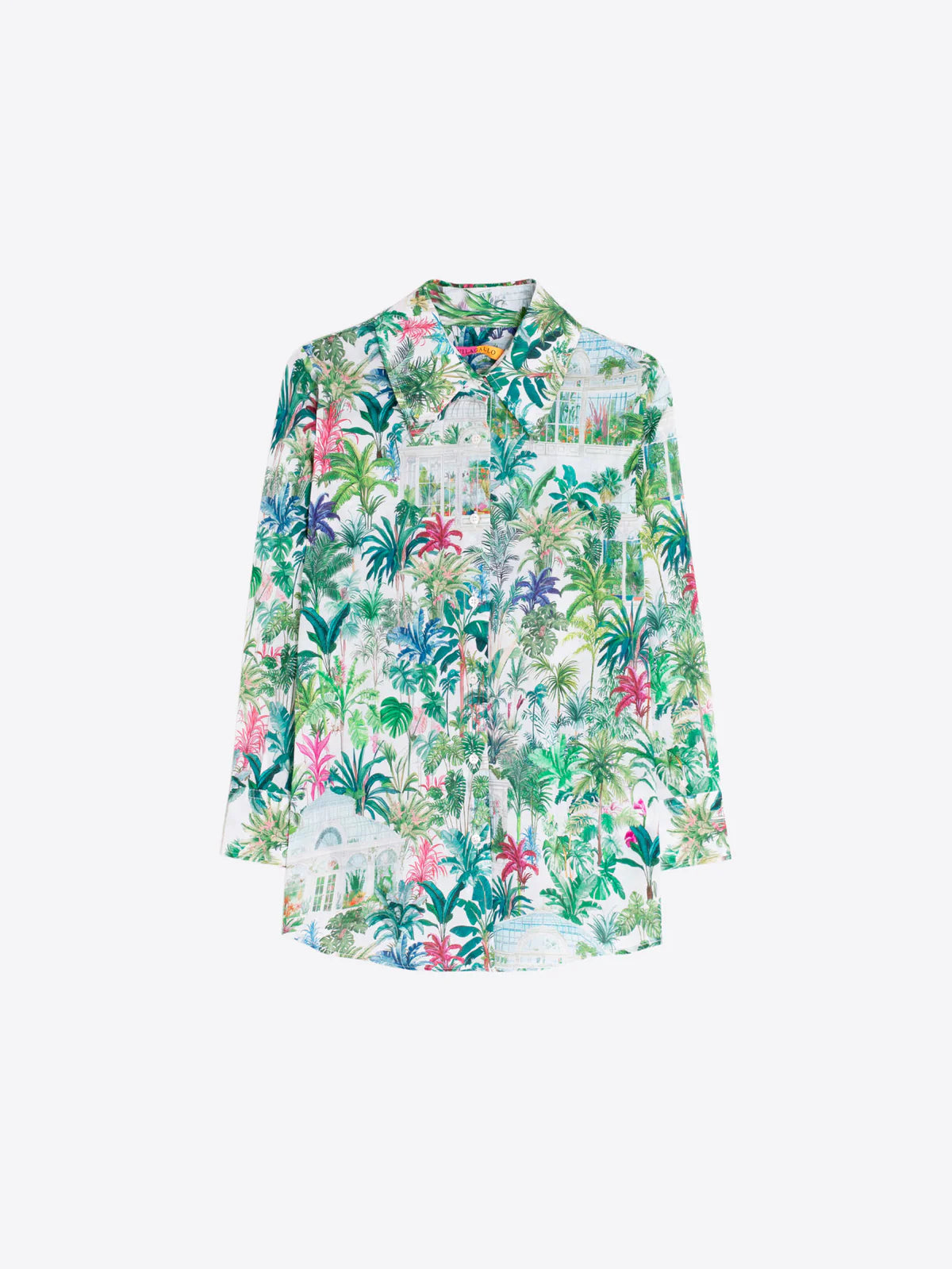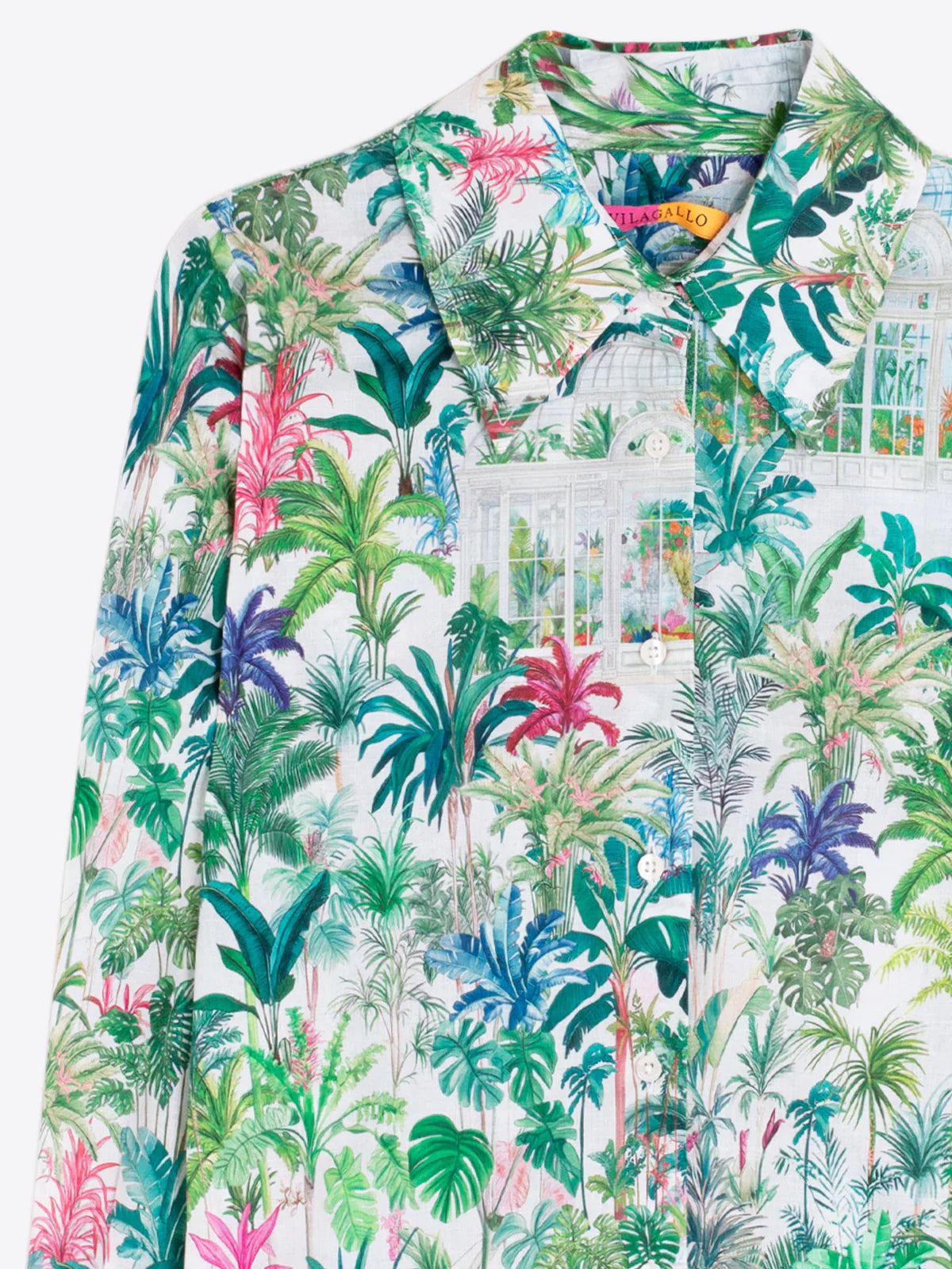 Camisa VILAGALLO Invernaderos con estampado tropical multicolor, predomina el verde.