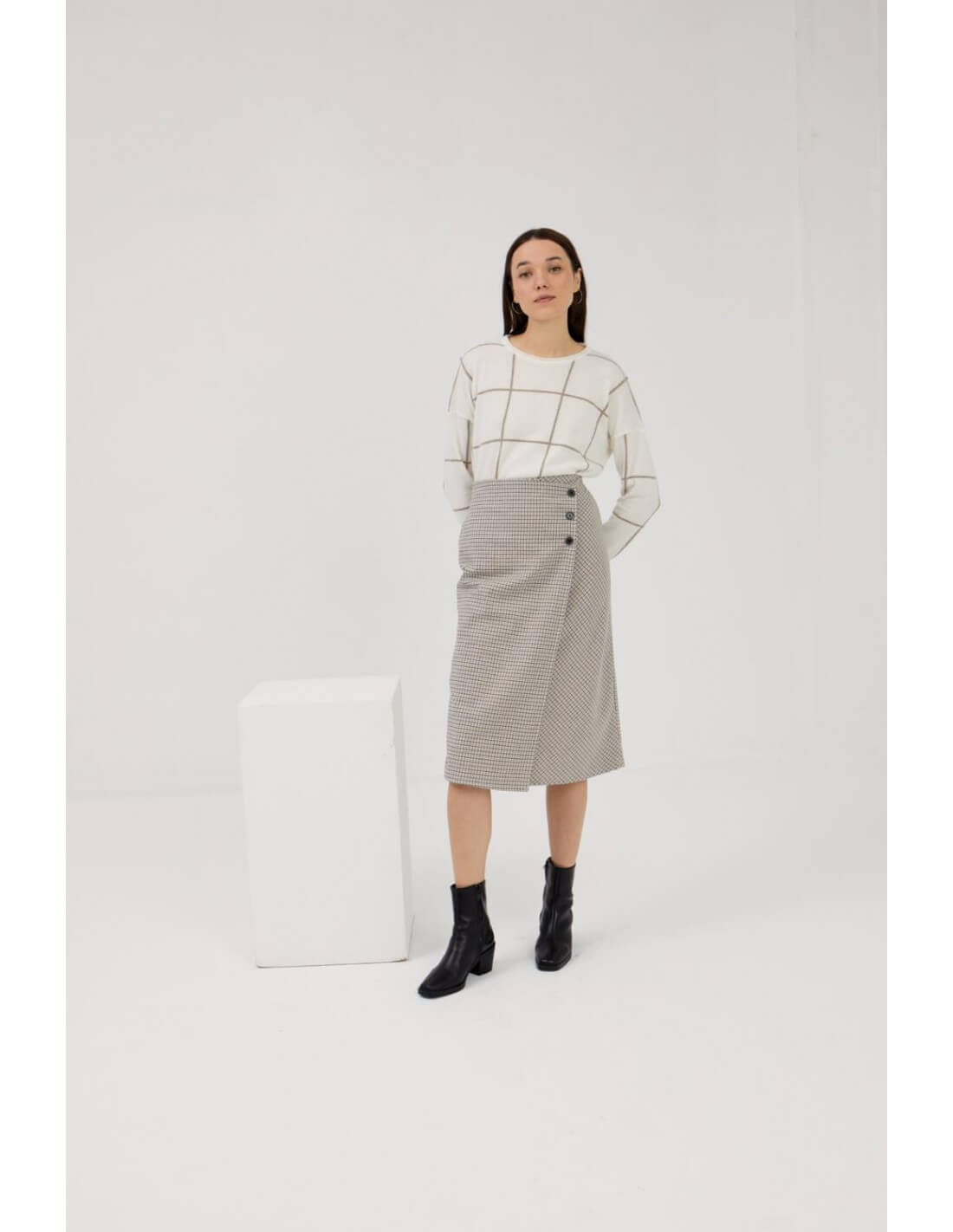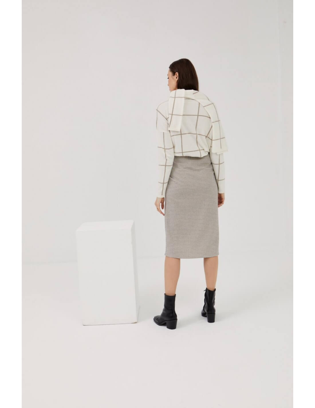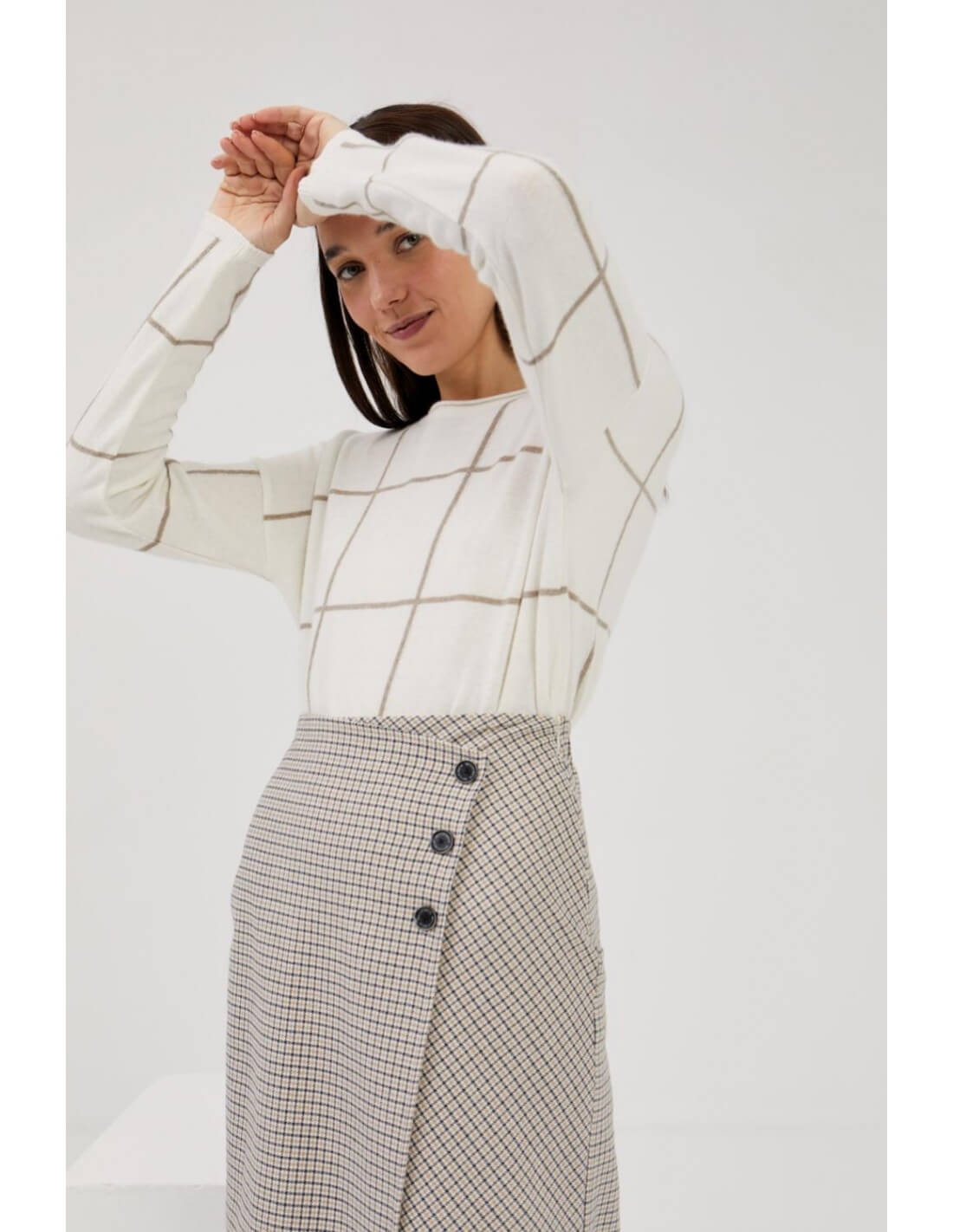Jersey Mus&Bombon Bejar en color crudo y lineas en camel formando cuadros.