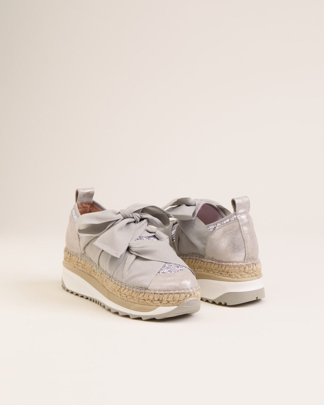 Sneaker Gaimo Venus Plata de piel, con tejido elástico de lentejuelas y lazo.