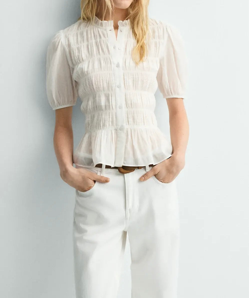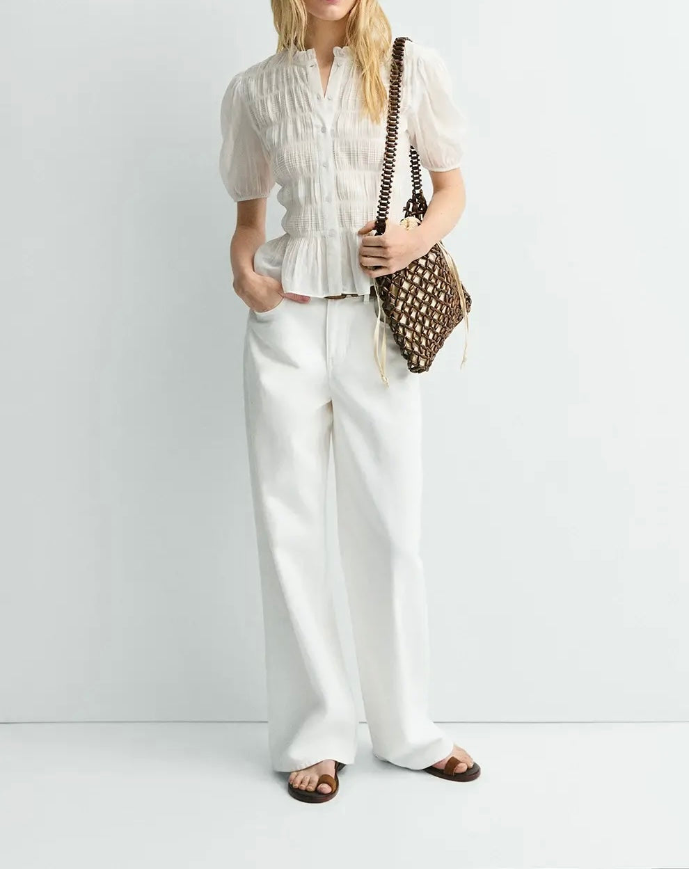 La camisa eseOese es perfecta para combinar con jeans, faldas midi o pantalones fluidos, añadiendo un toque romántico