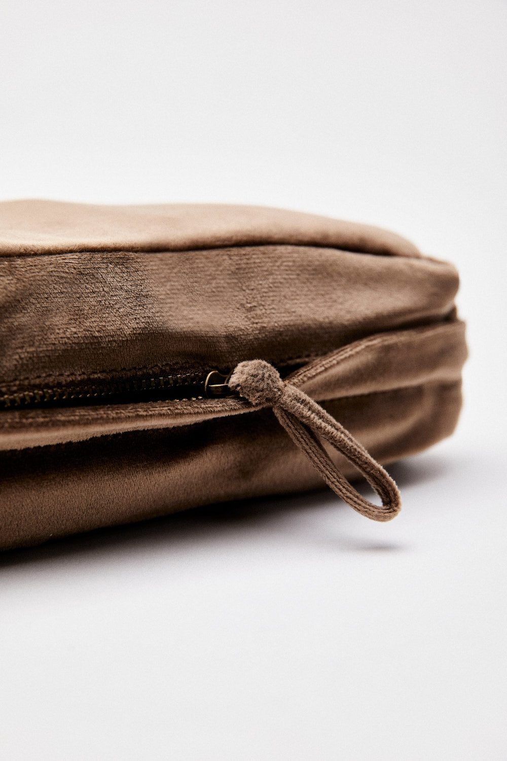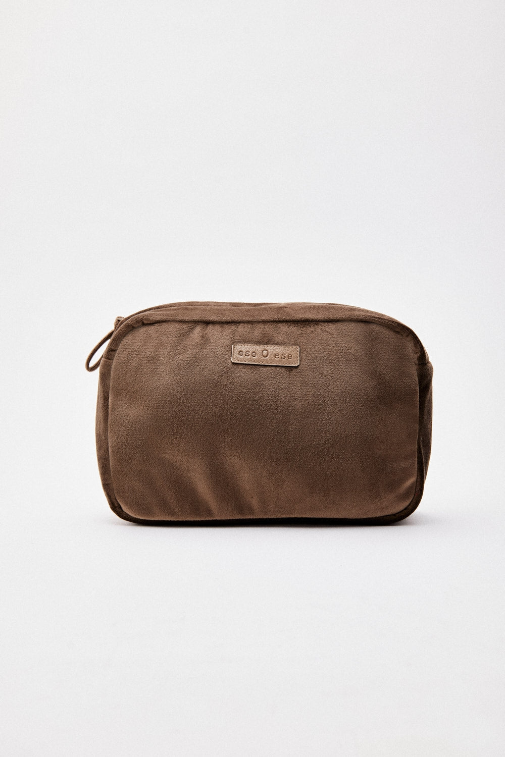 Neceser eseOese Velvet en tejido de terciopelo color taupe.