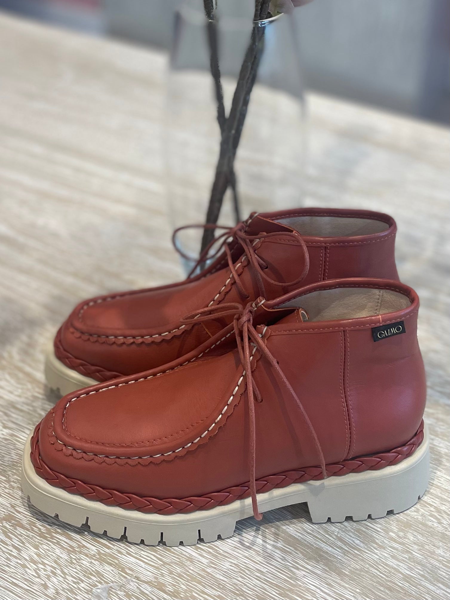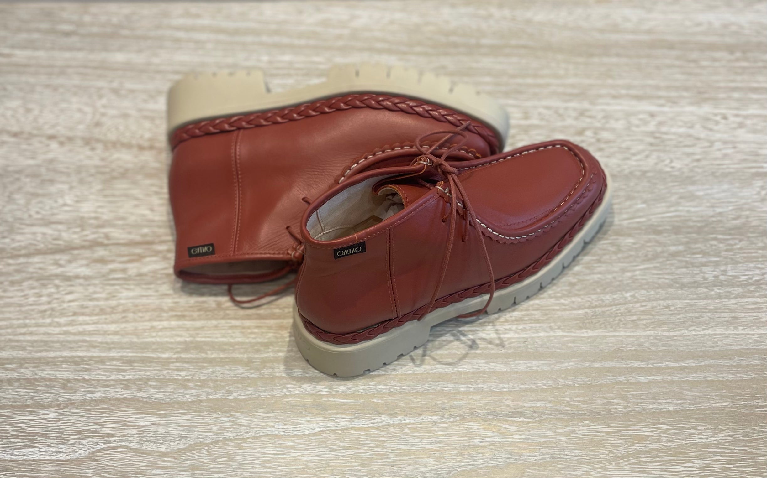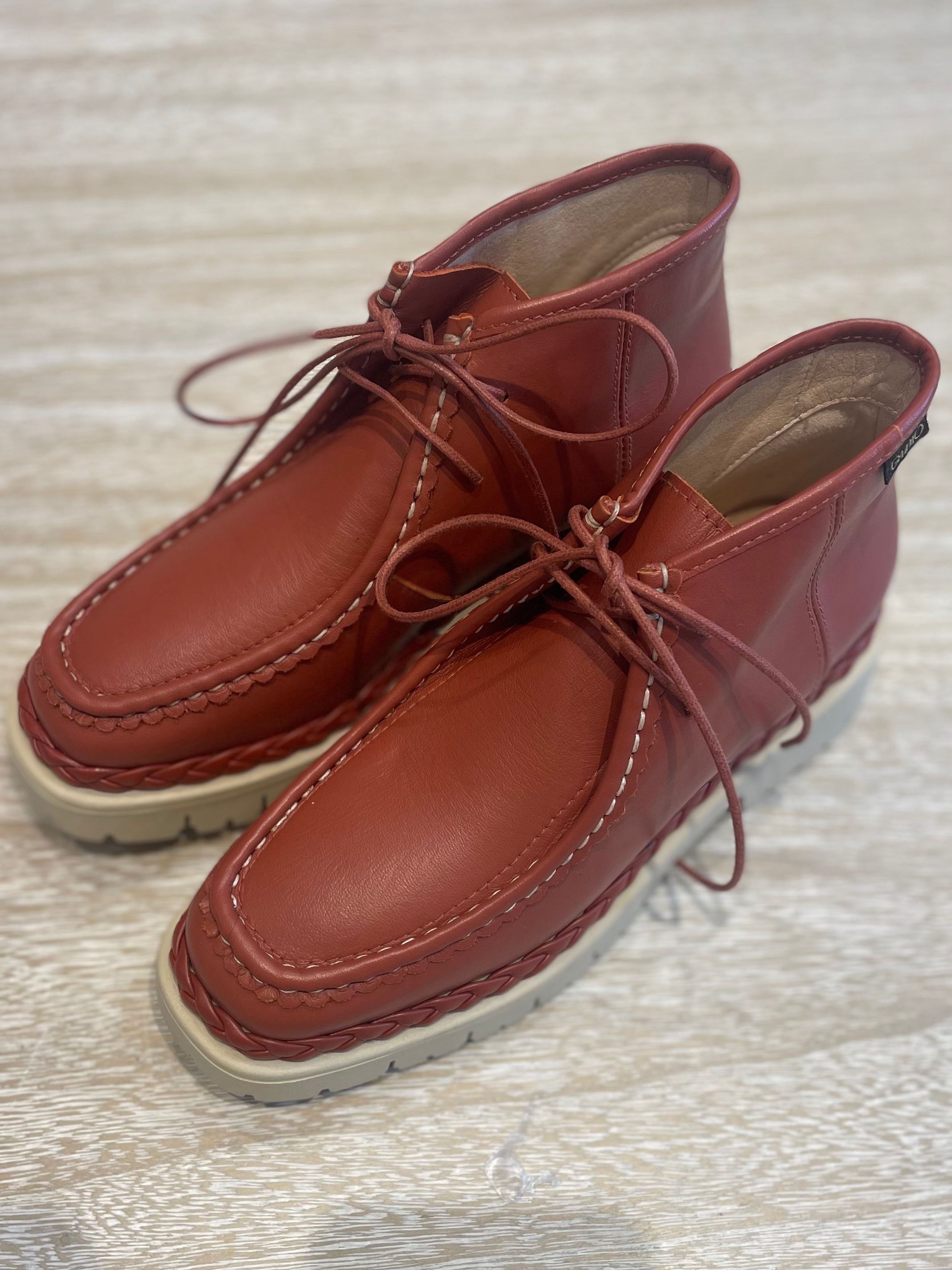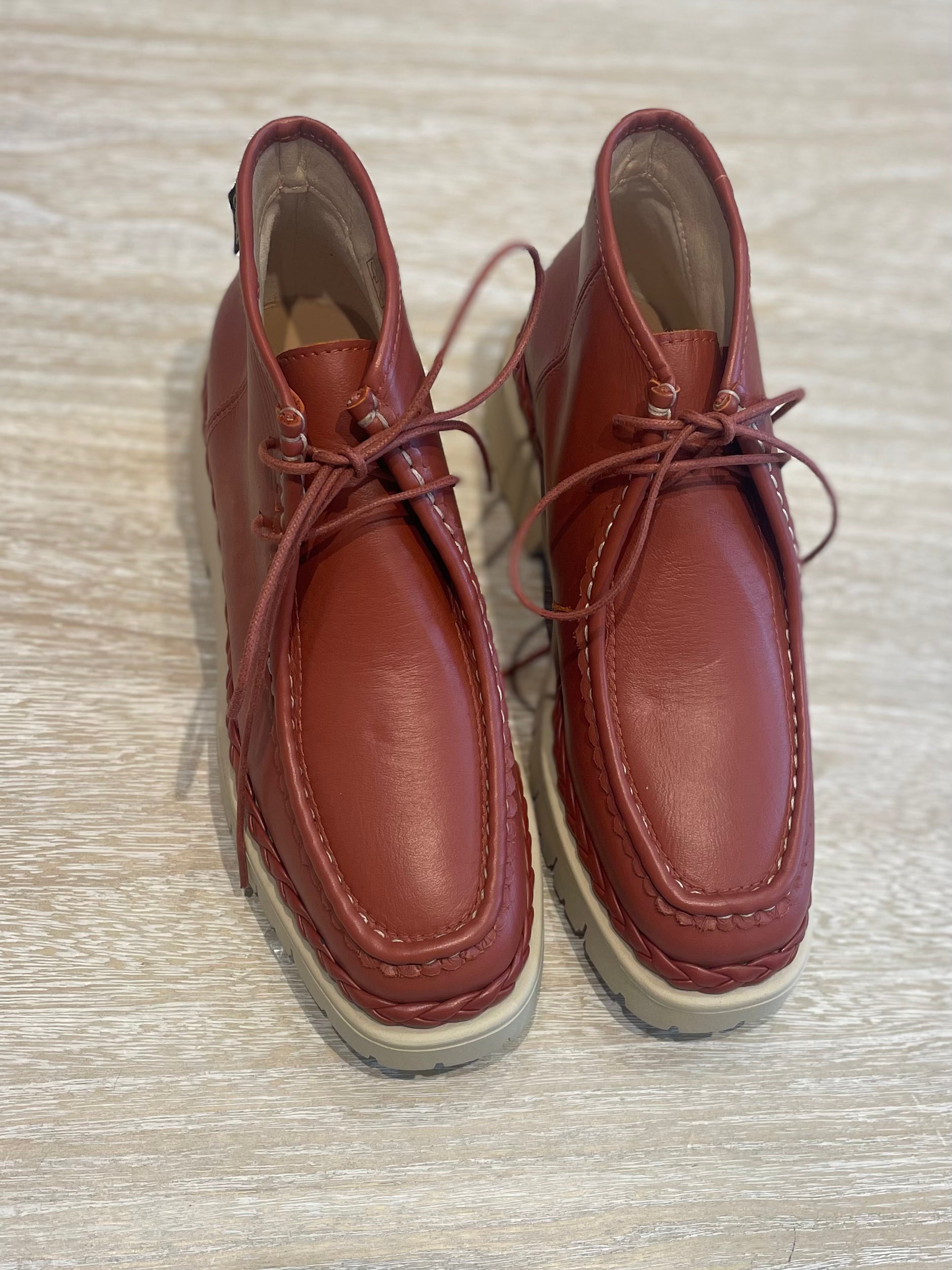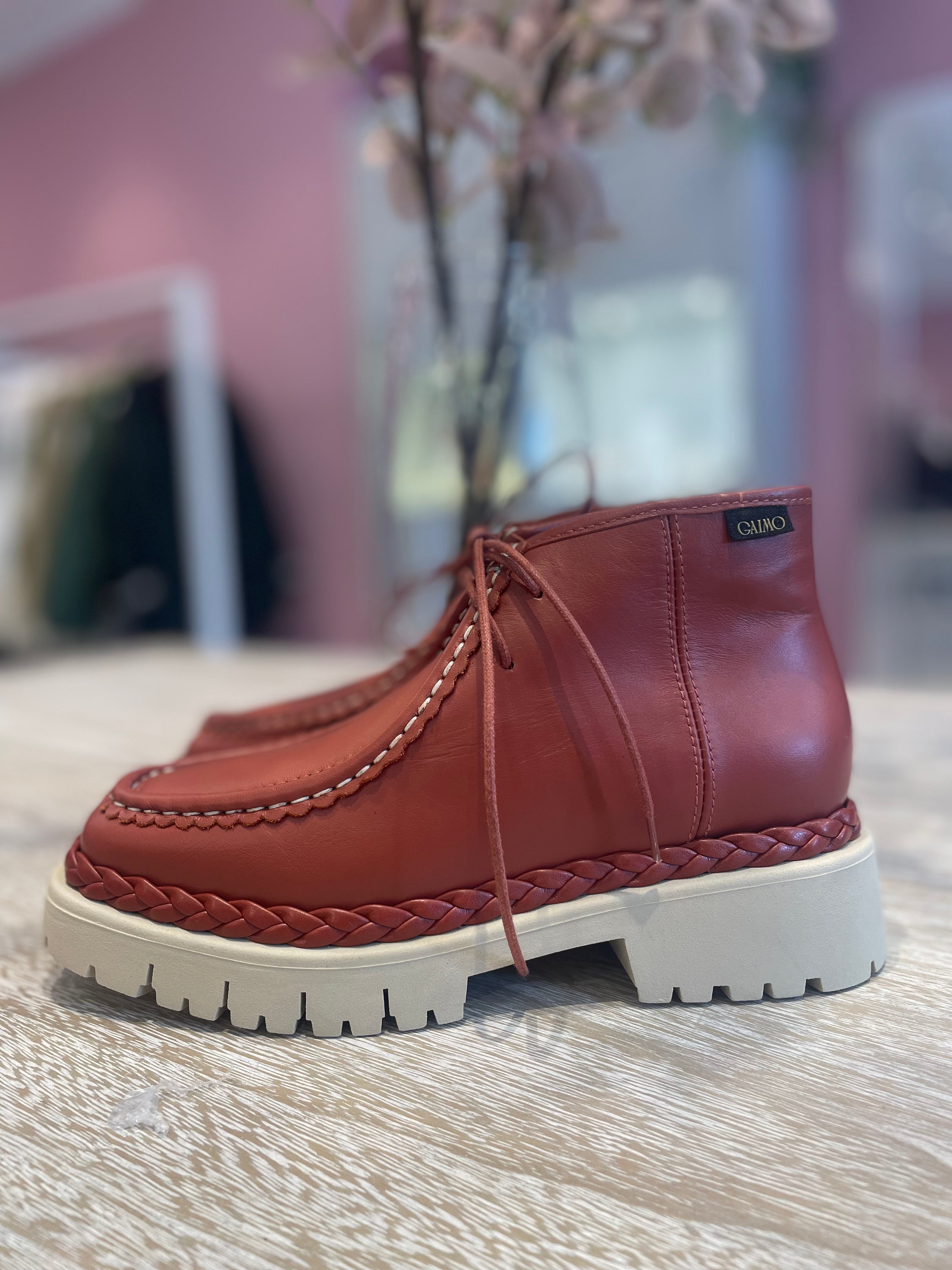 Botin Gaimo Caeli en piel napa color marrón teja, suela truck y detalle trenzado.