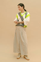 Chaleco PAN PRODUCTO BASICO de punto en gris, blanco y detalles en flúor.