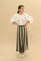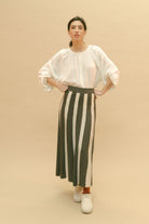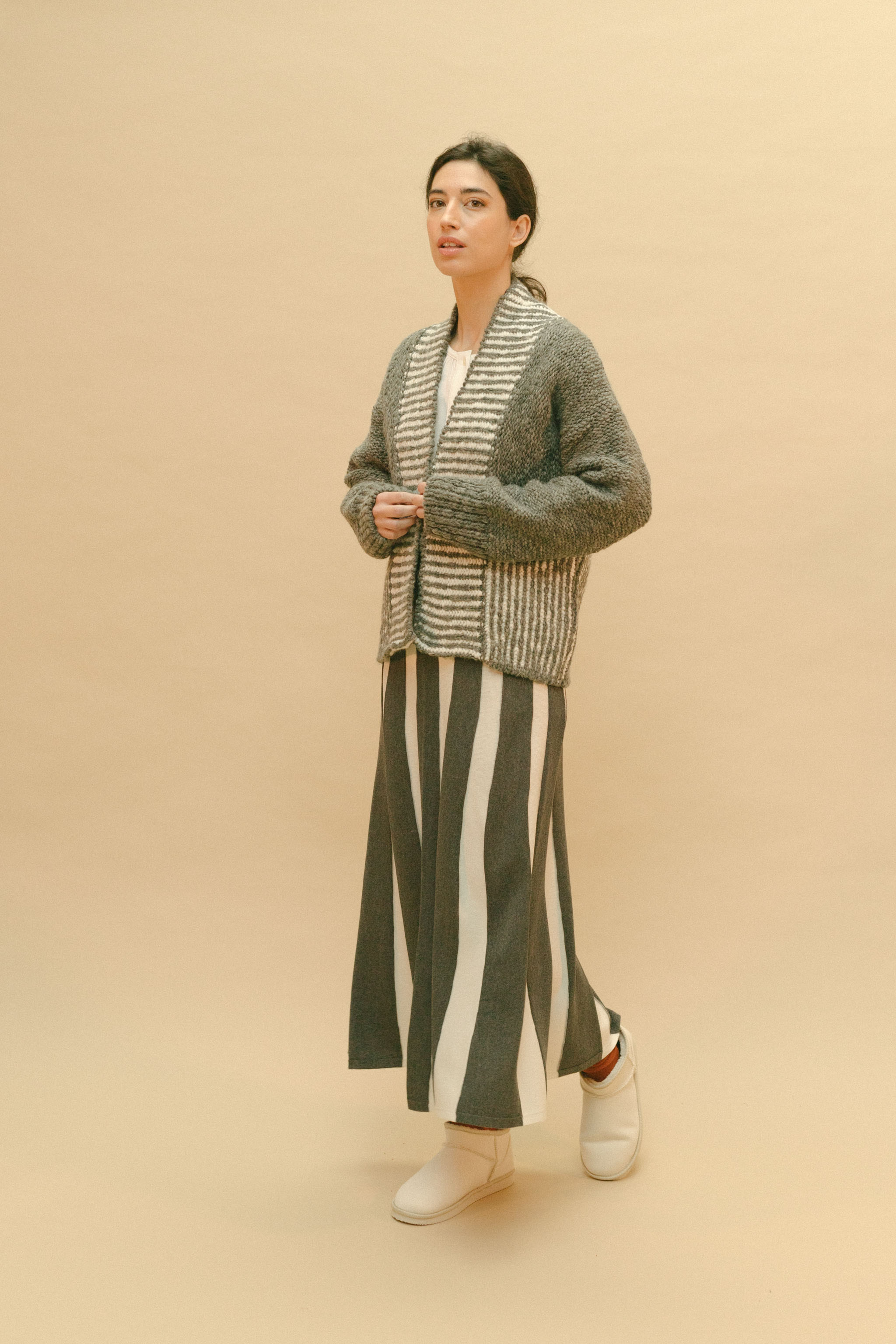 Falda PAN PRODUCTO BASICO de punto con rayas verticales grises y blancas. La cintura es elástica y el corte recto con caida suave.