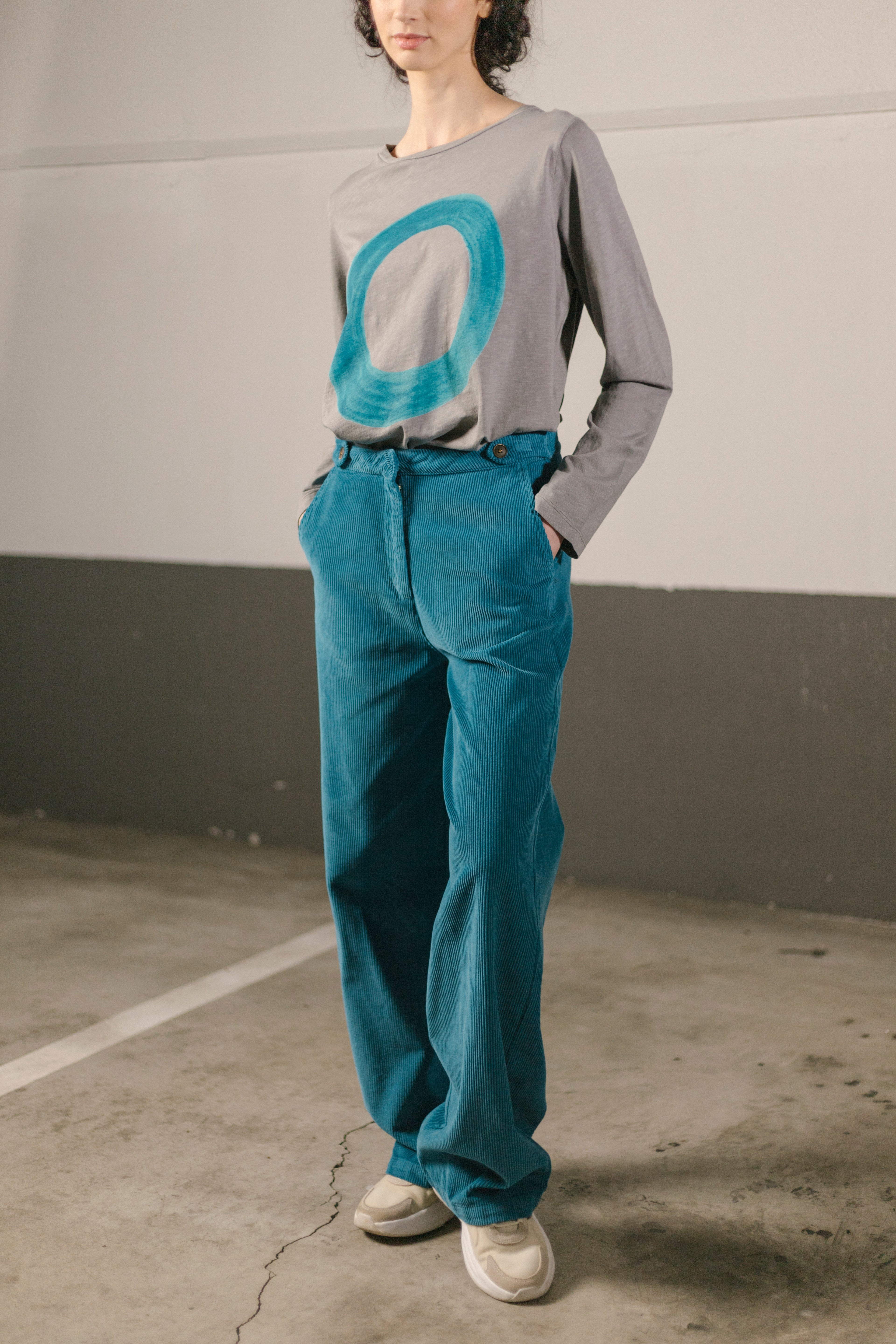 Pantalon Pan Producto Basico de pana fina en color azul petróleo y con bolsillos laterales.