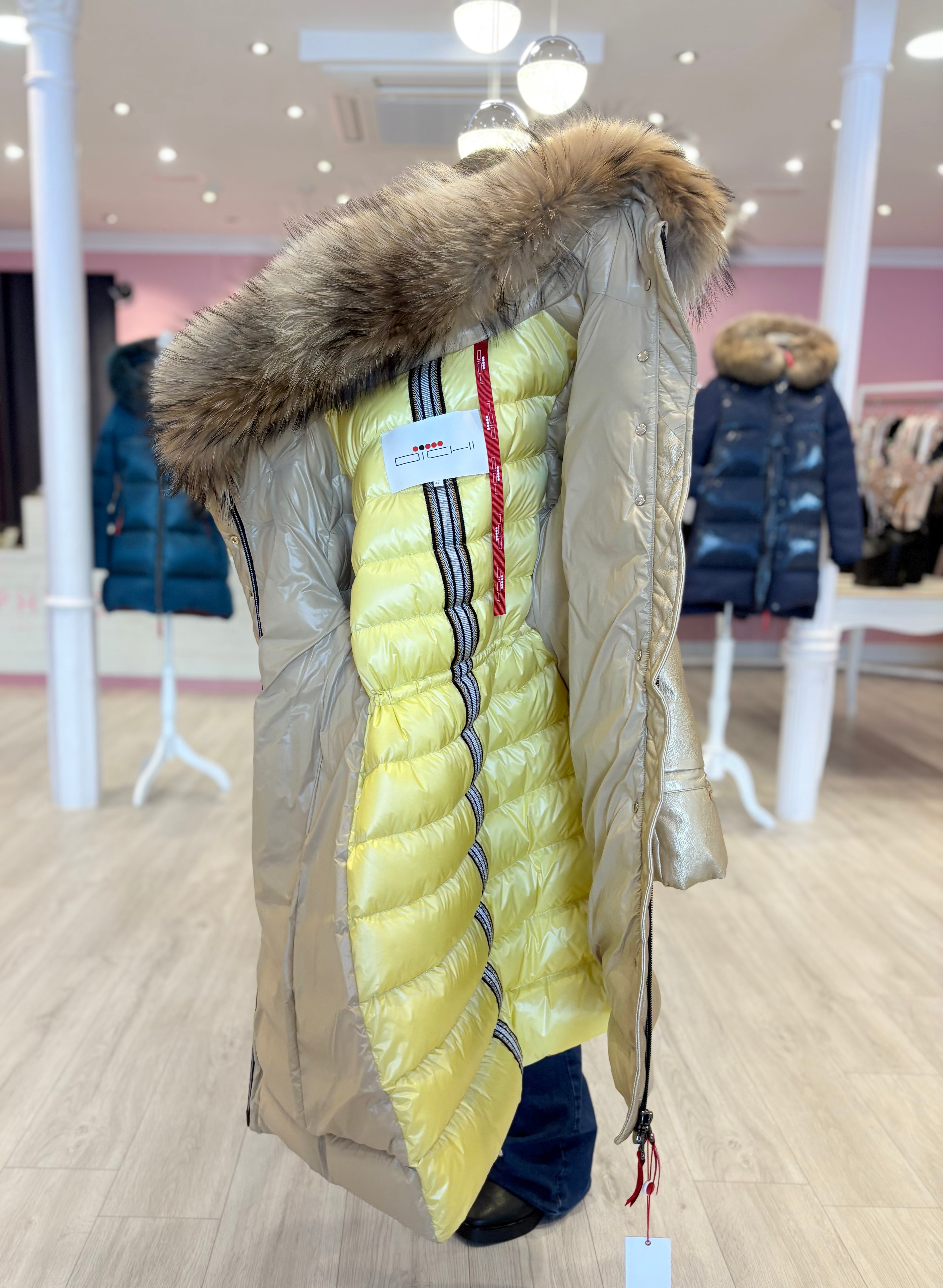 Abrigo DICHI Samara en color dorado con mezcla de tejidos, en piel y acolchado. El pelo natural es desmontable.