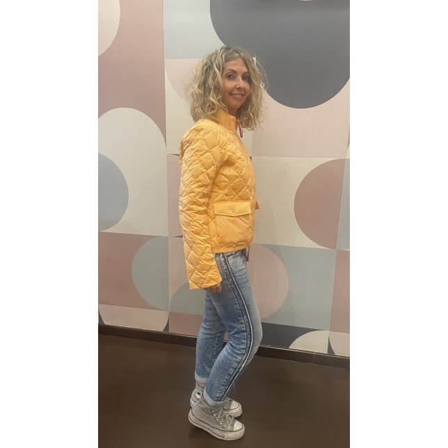 Cazadora DICHI modelo ALBA en color melocotón con un brillo aterciopelado y bolsillos fontales. La cazadora dichi alba ideal para entretiempo.