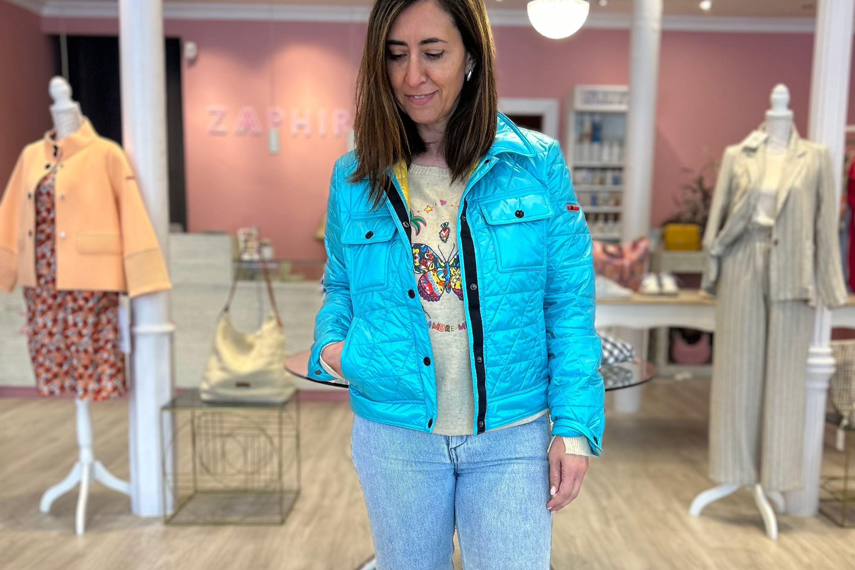 Cazadora Dichi Shela en color tuquesa acolchada con bolsillos.