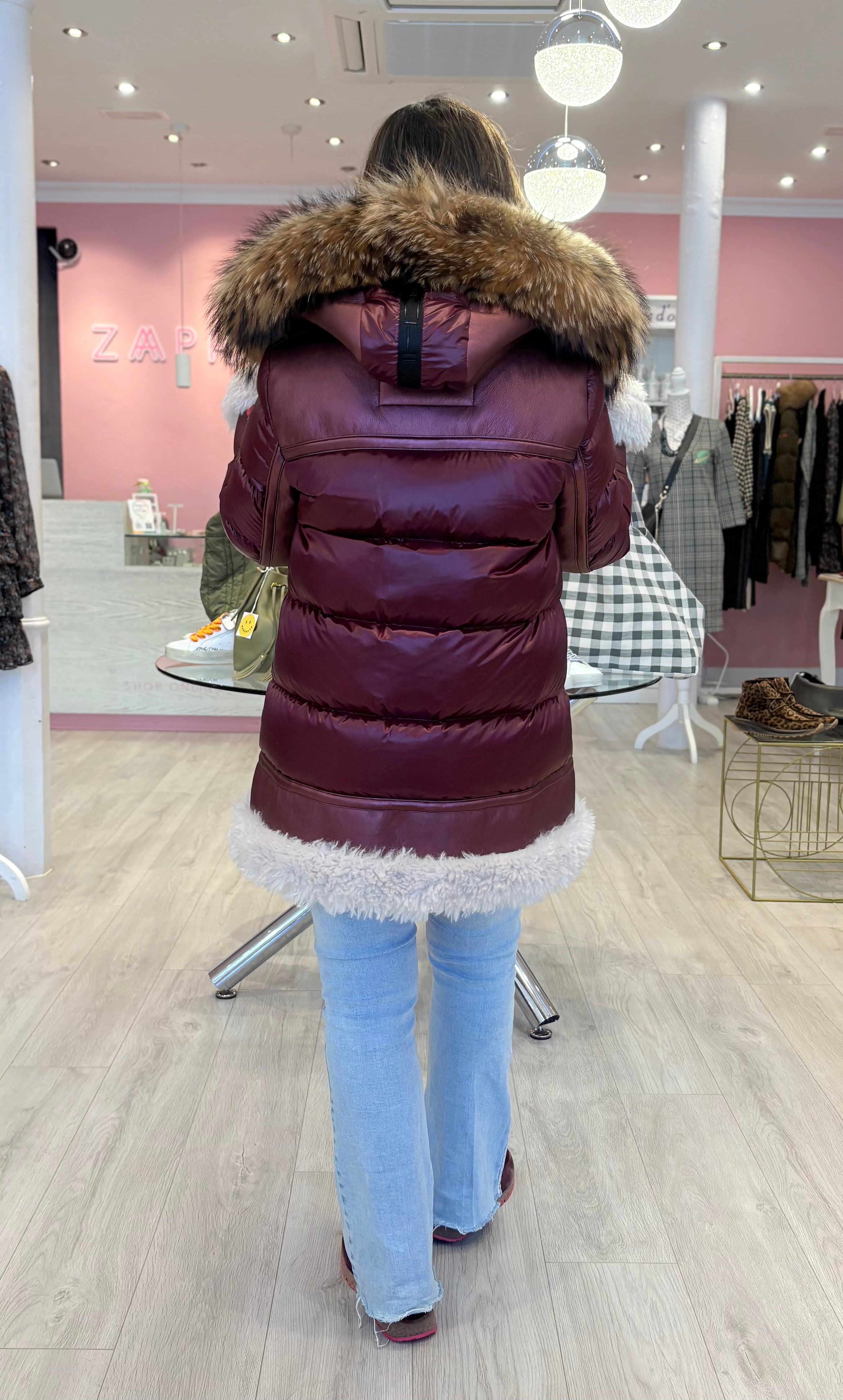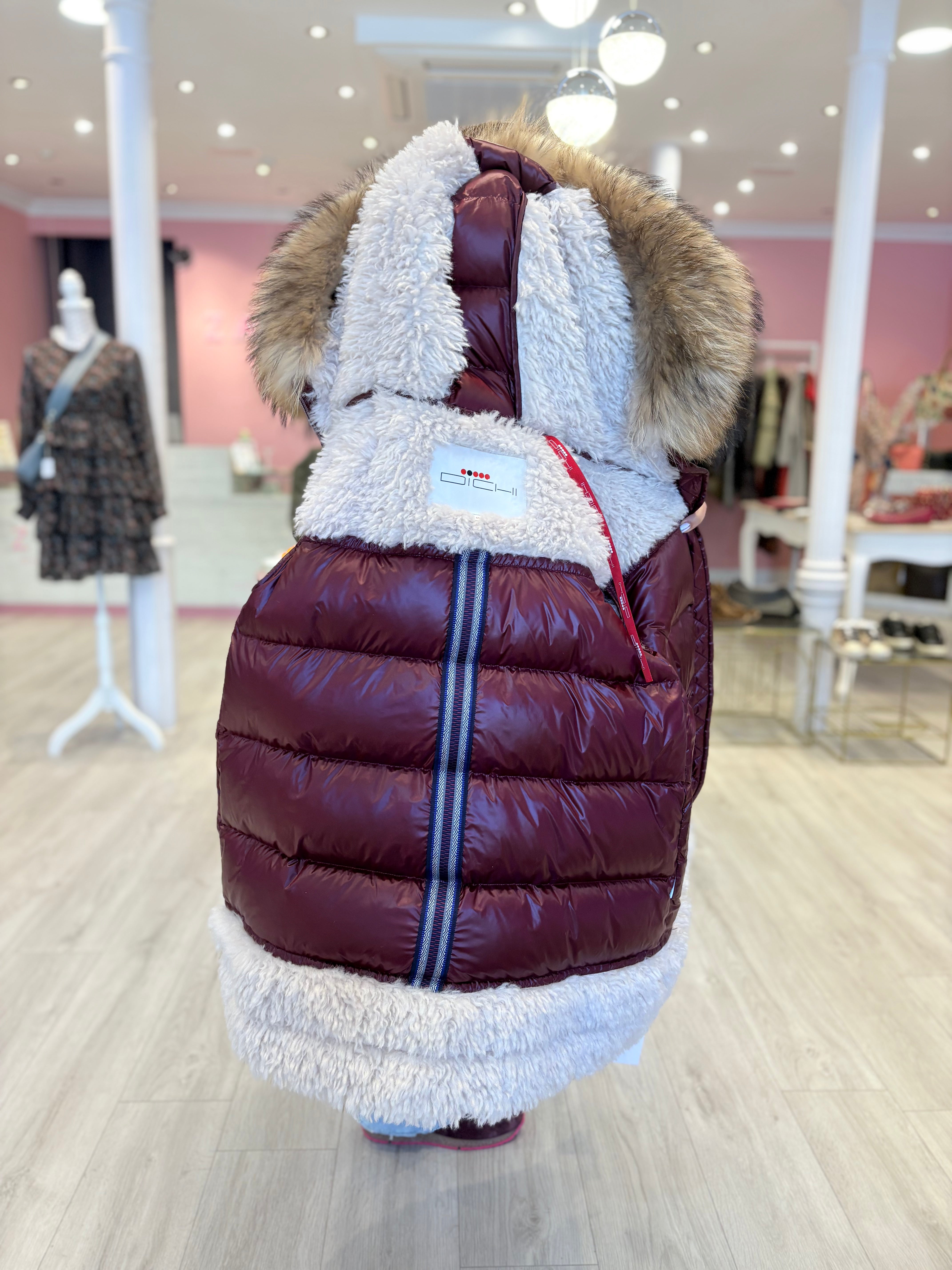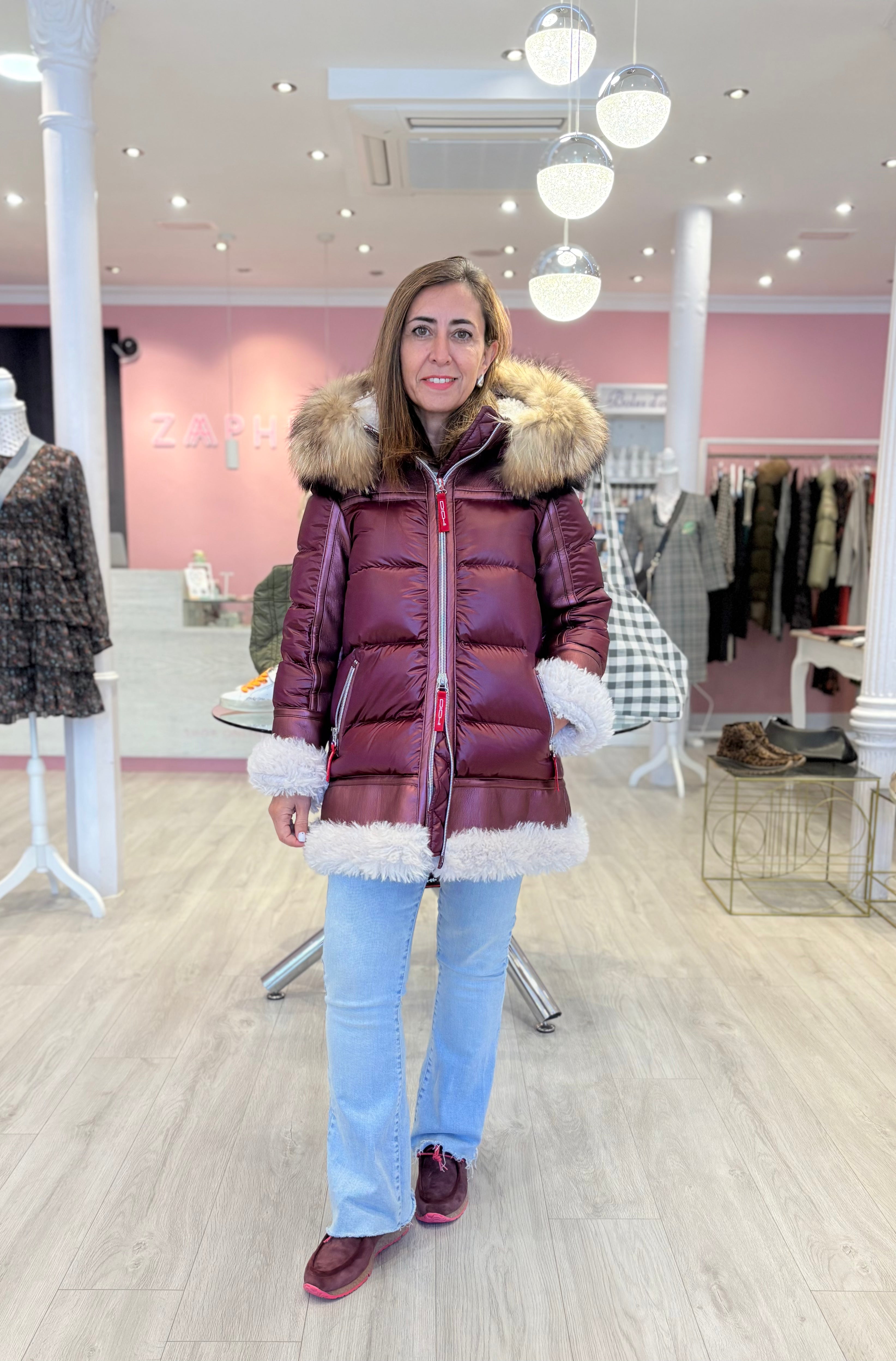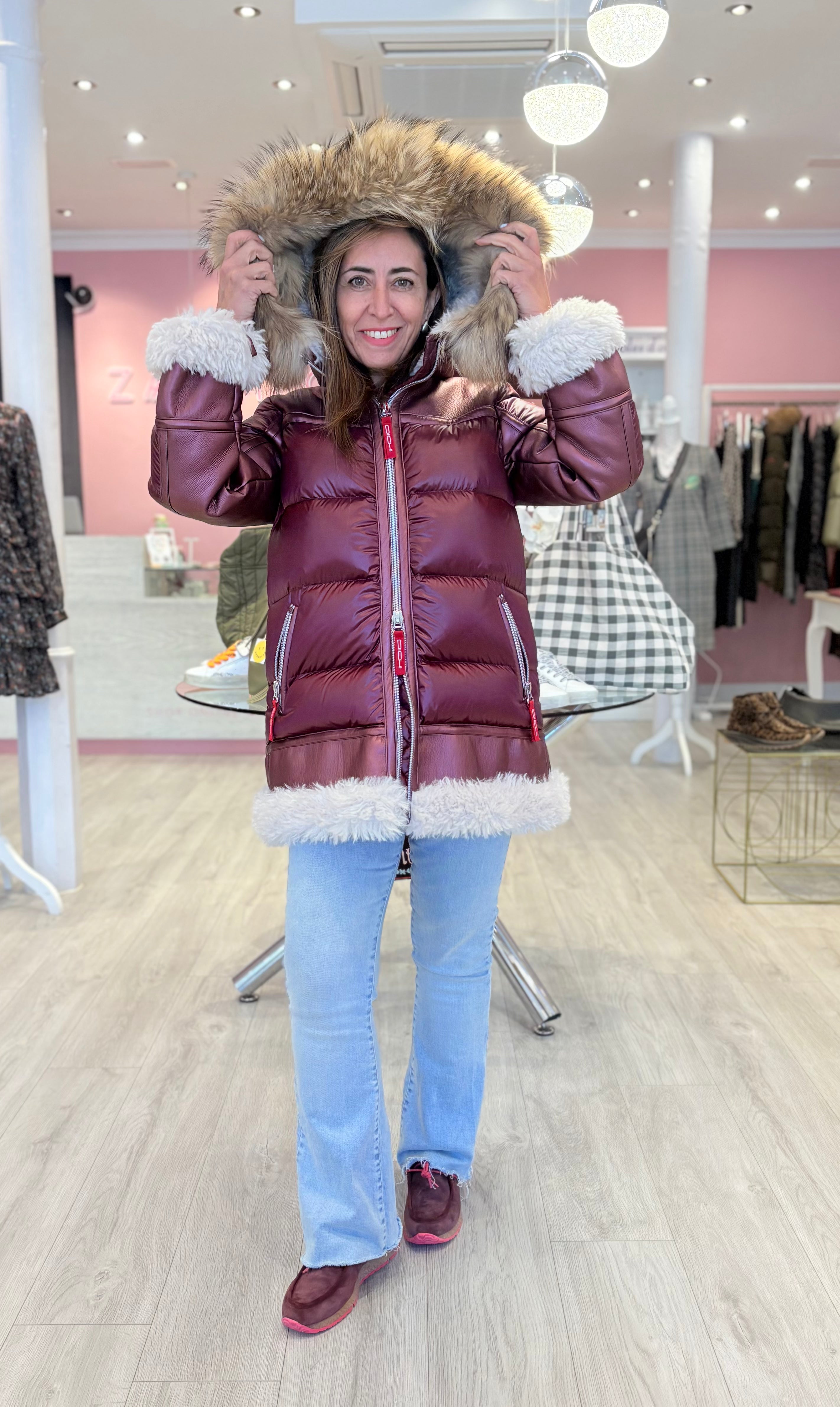 Plumífero DICHI Ayesa con distintos tejidos. El pelo natural al es desmontable.