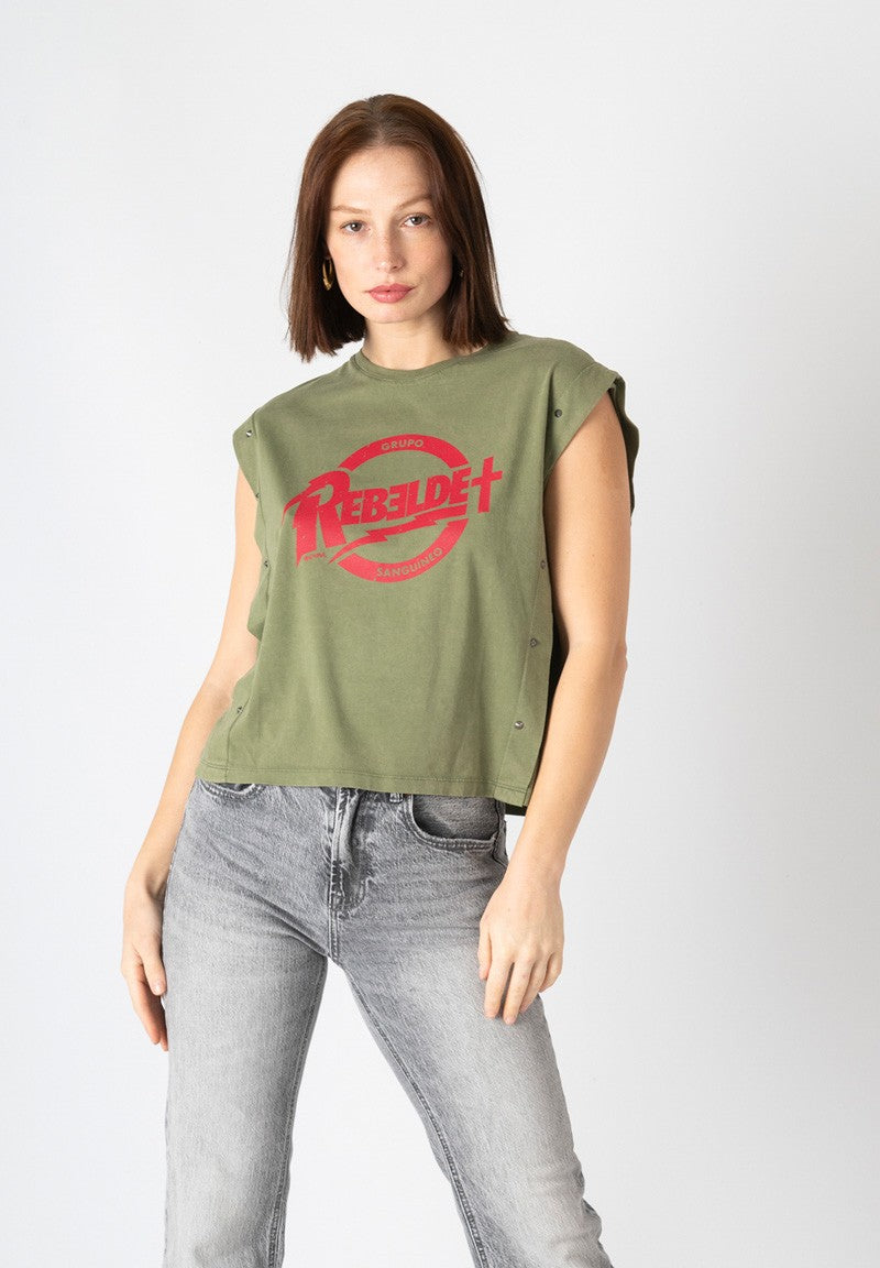 Camiseta ANIMOSA Rebelde en verde, de hombro caído y cuello cerrado. Con tachuelas en los costados.