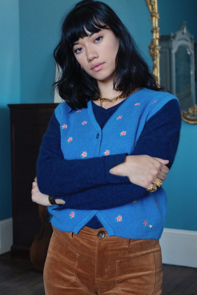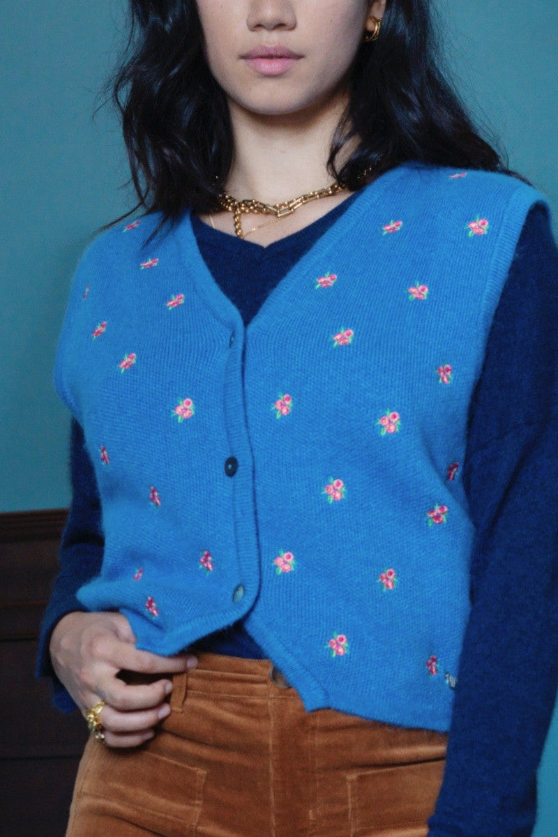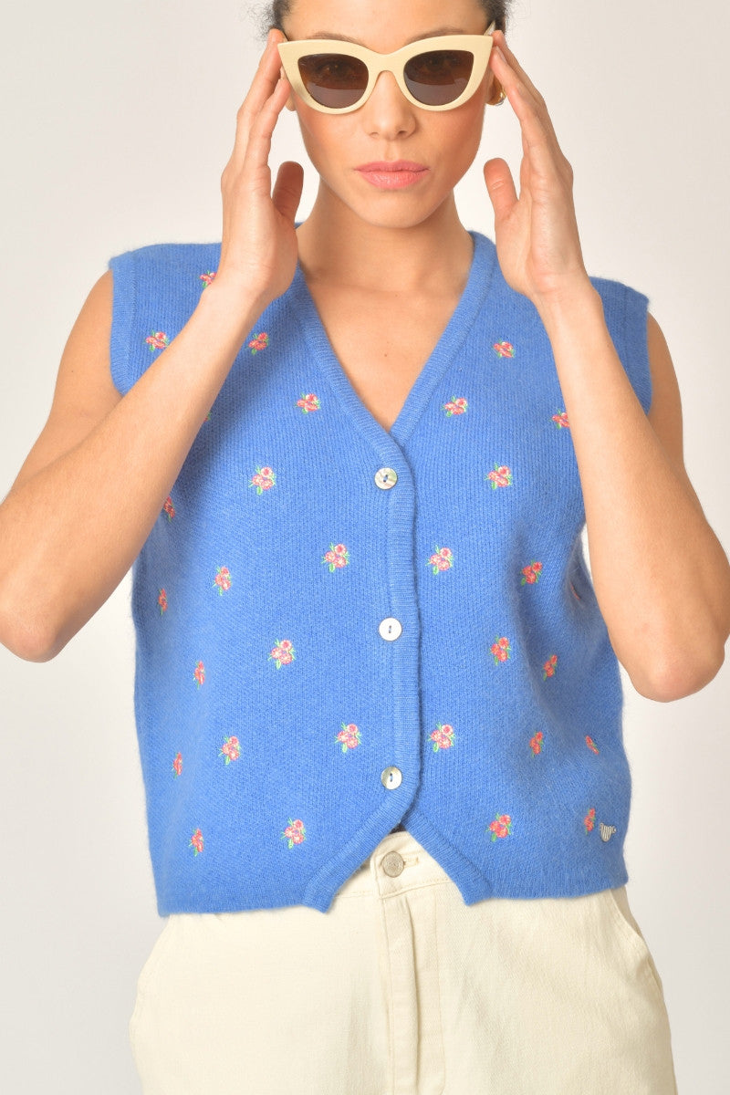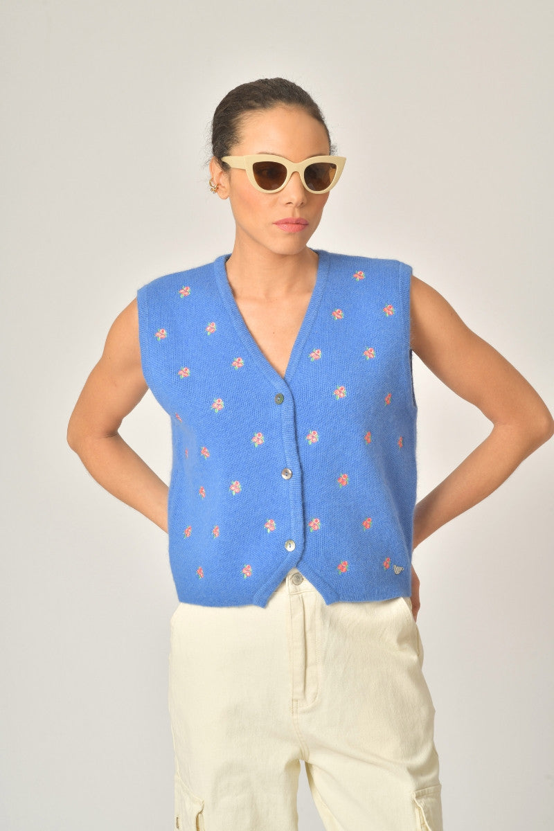Chaleco Orfeo Luby en azul con bordados florales y corte en la cadera.