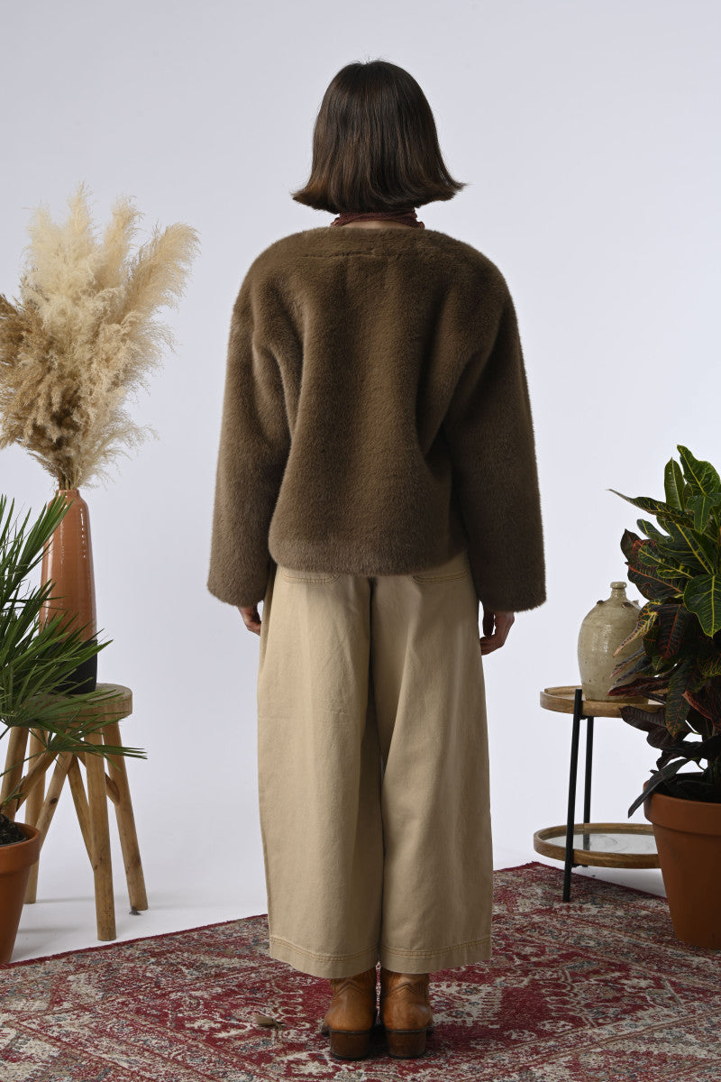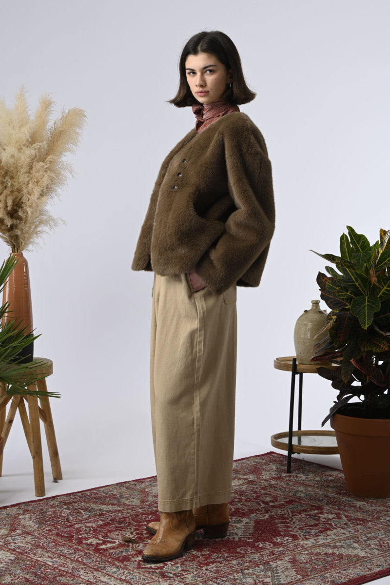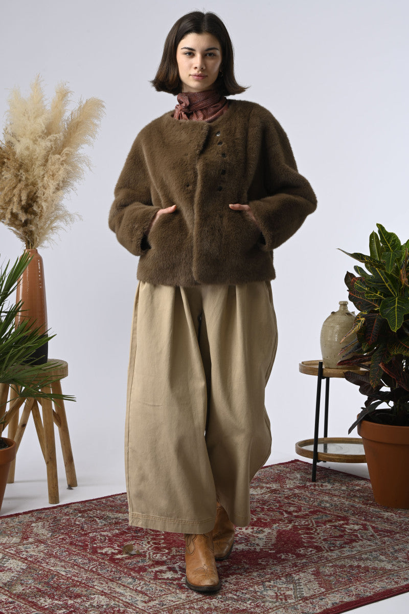 Chaqueta ORFEO Sissi de piel sintética en color chocolate. Lleva un cuello aparte del mismo color y piel para combinar