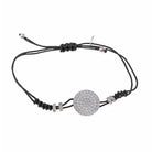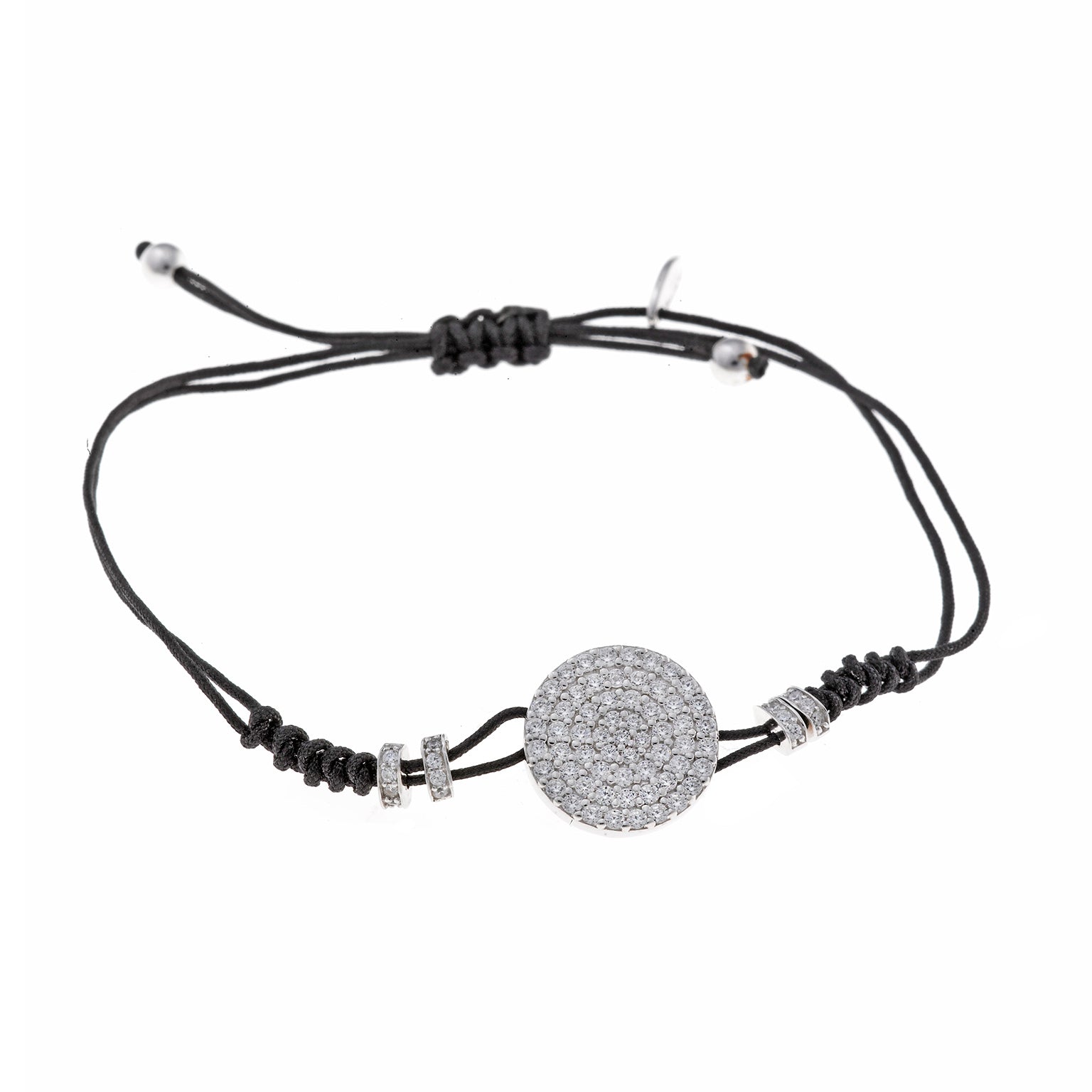 Pulsera SALVATORE PLATA con círculo de circonitas blancas y plata, tejido negro.