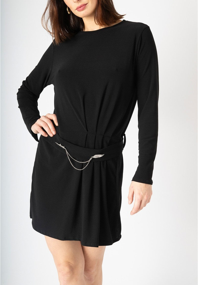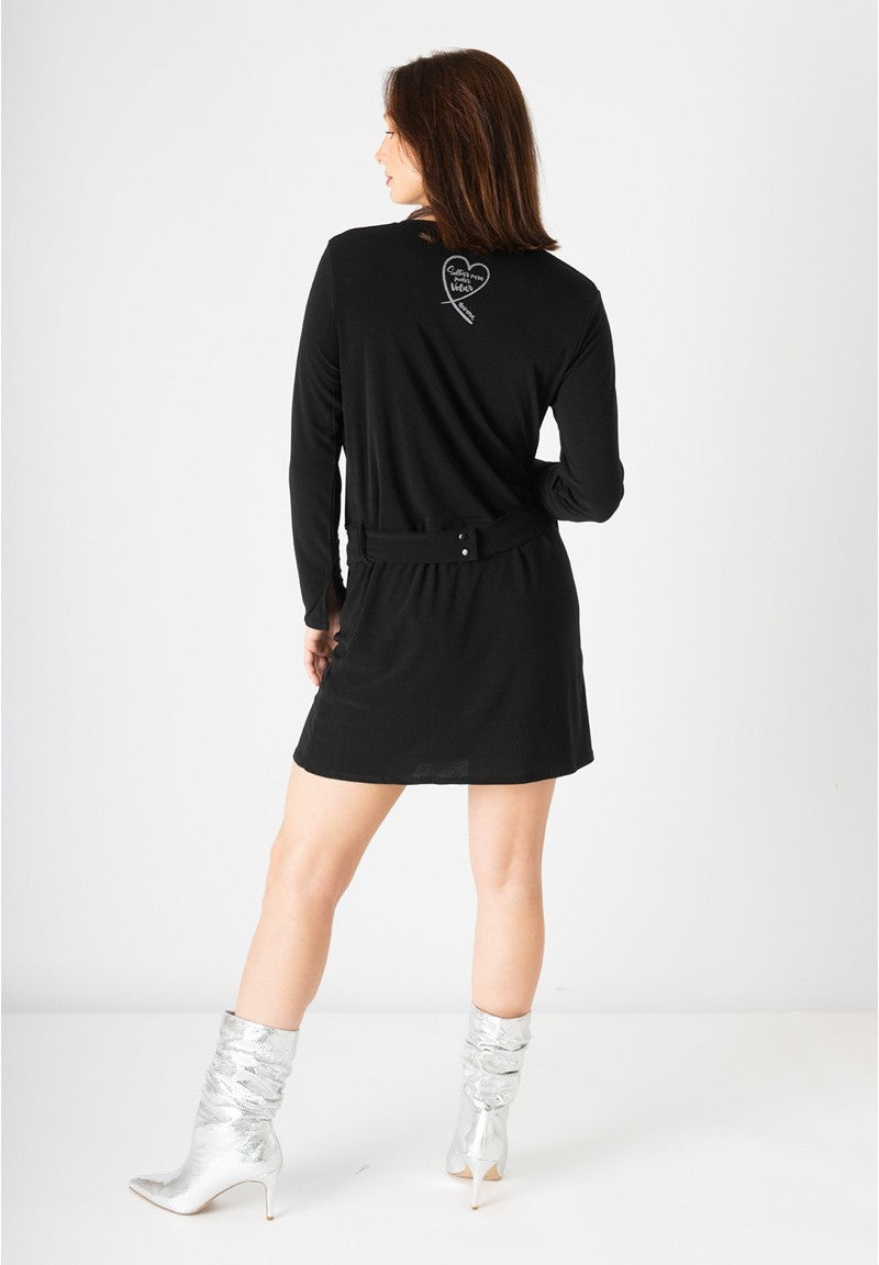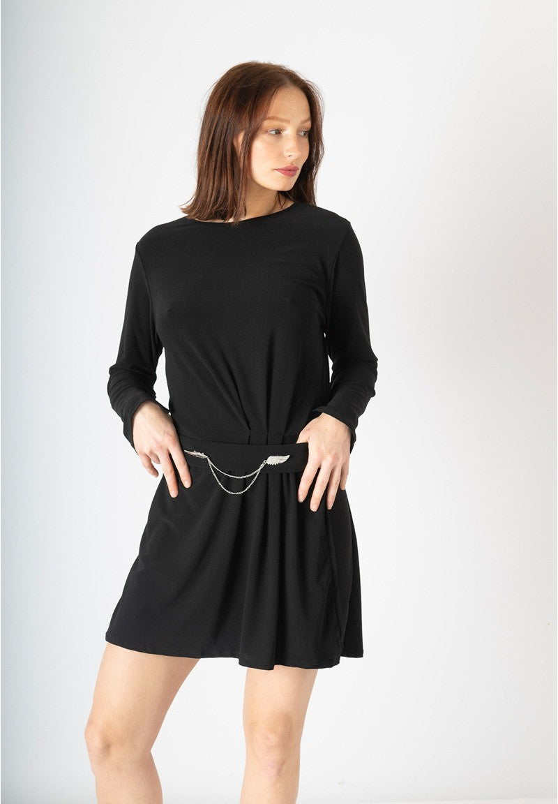 Vestido ANIMOSA Negro con mensaje en la espalda, corto y cinturón con detalle metálico de alas y cadena que se pueden quitar.