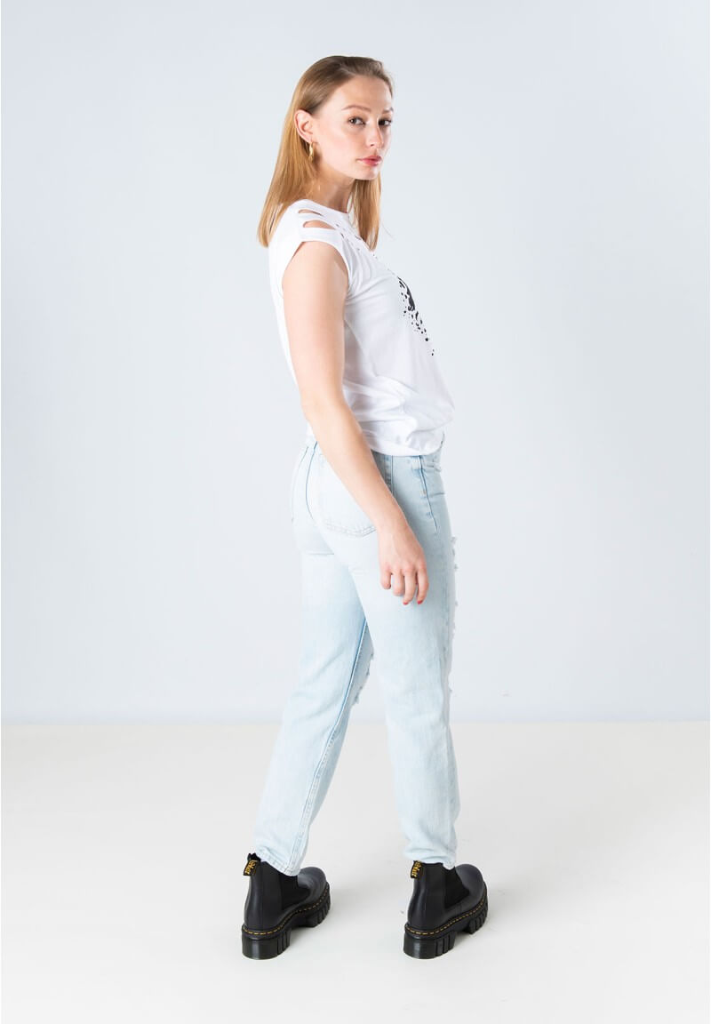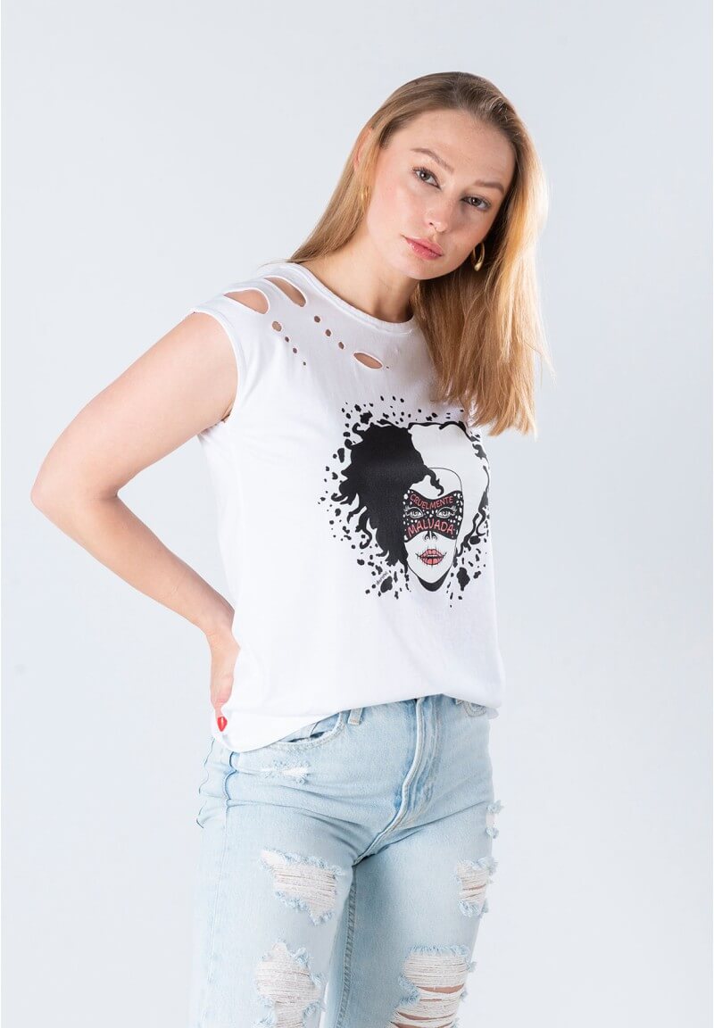 La Camiseta Animosa Malvada tiene aberturas en el hombro que le dan un toque original y diferente