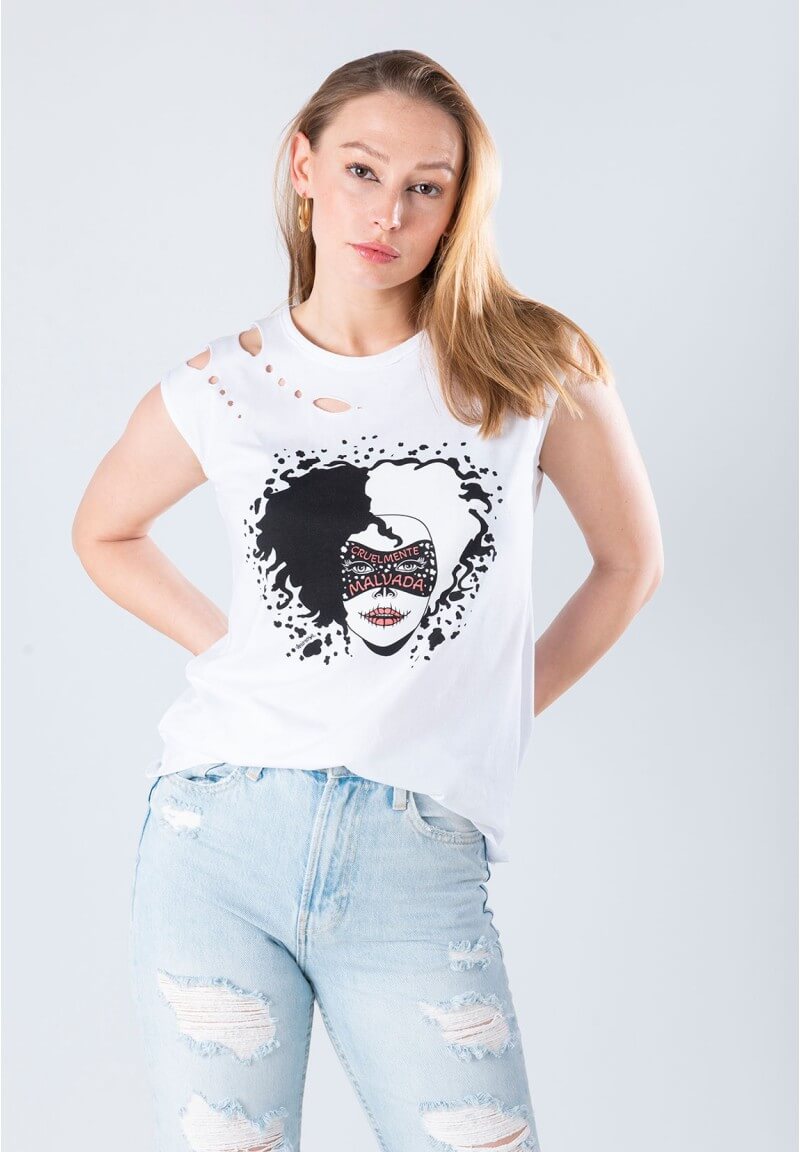 Camiseta Animosa Malvada en algodón blanco con dibujo.