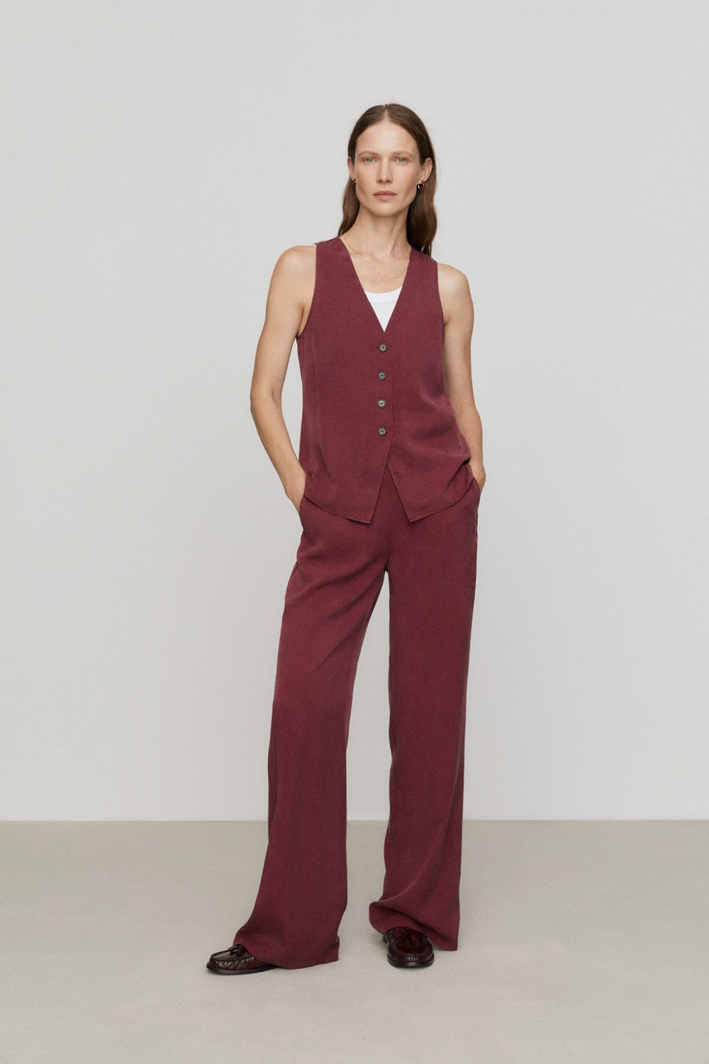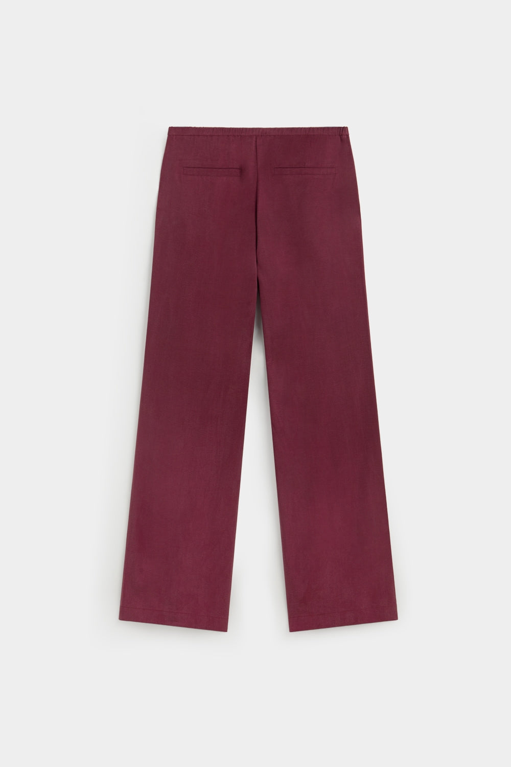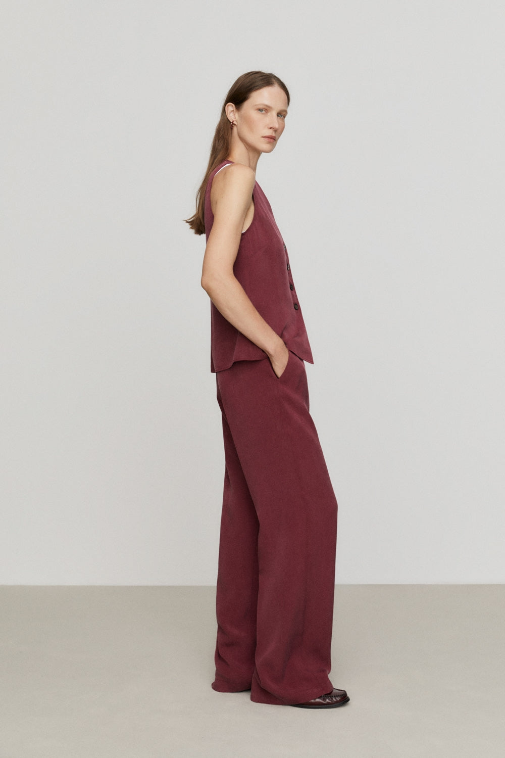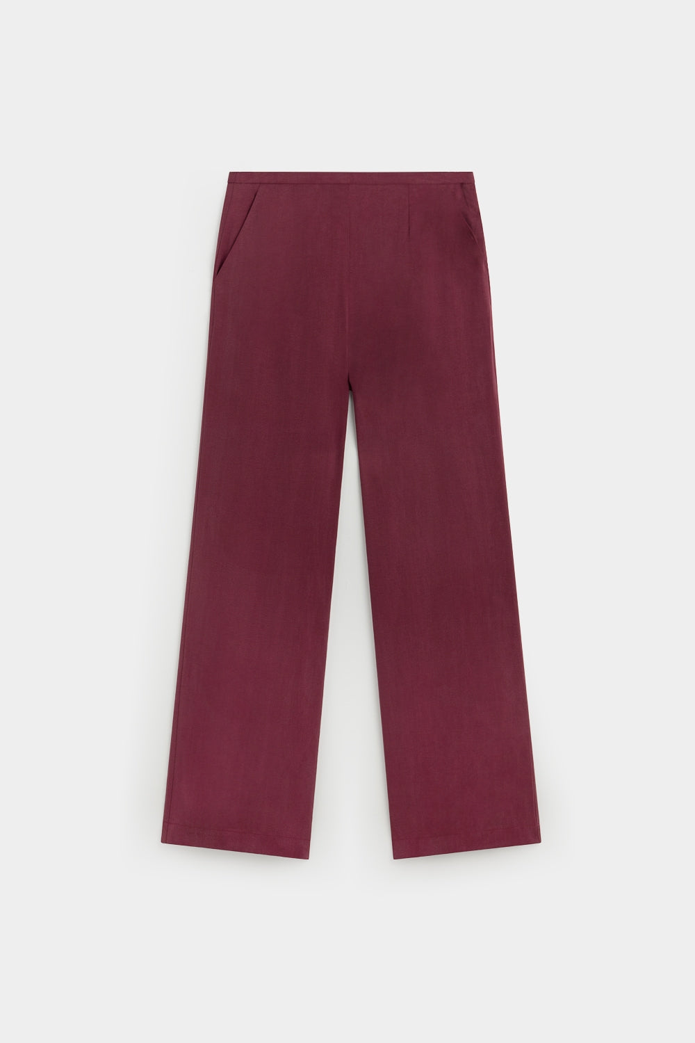 Pantalón eseOese Cannes en color burdeos fluido, con cremallera en el lateral.