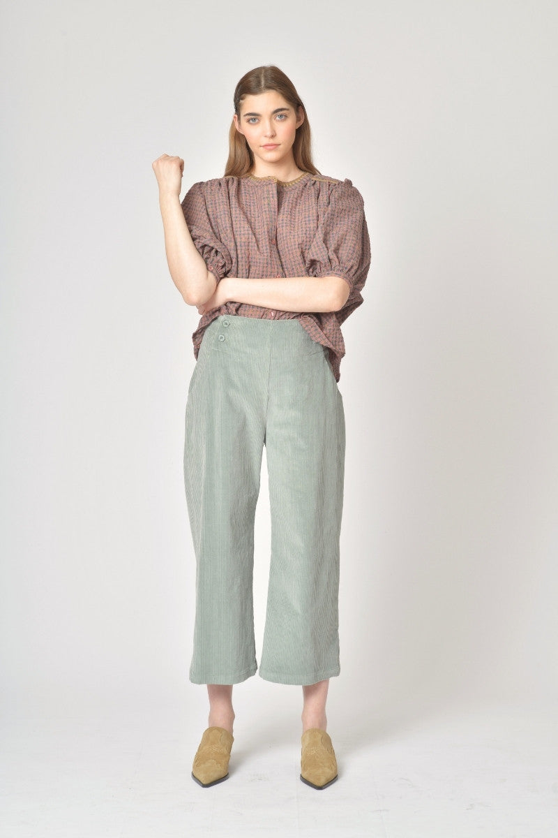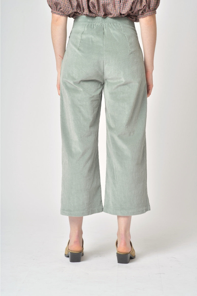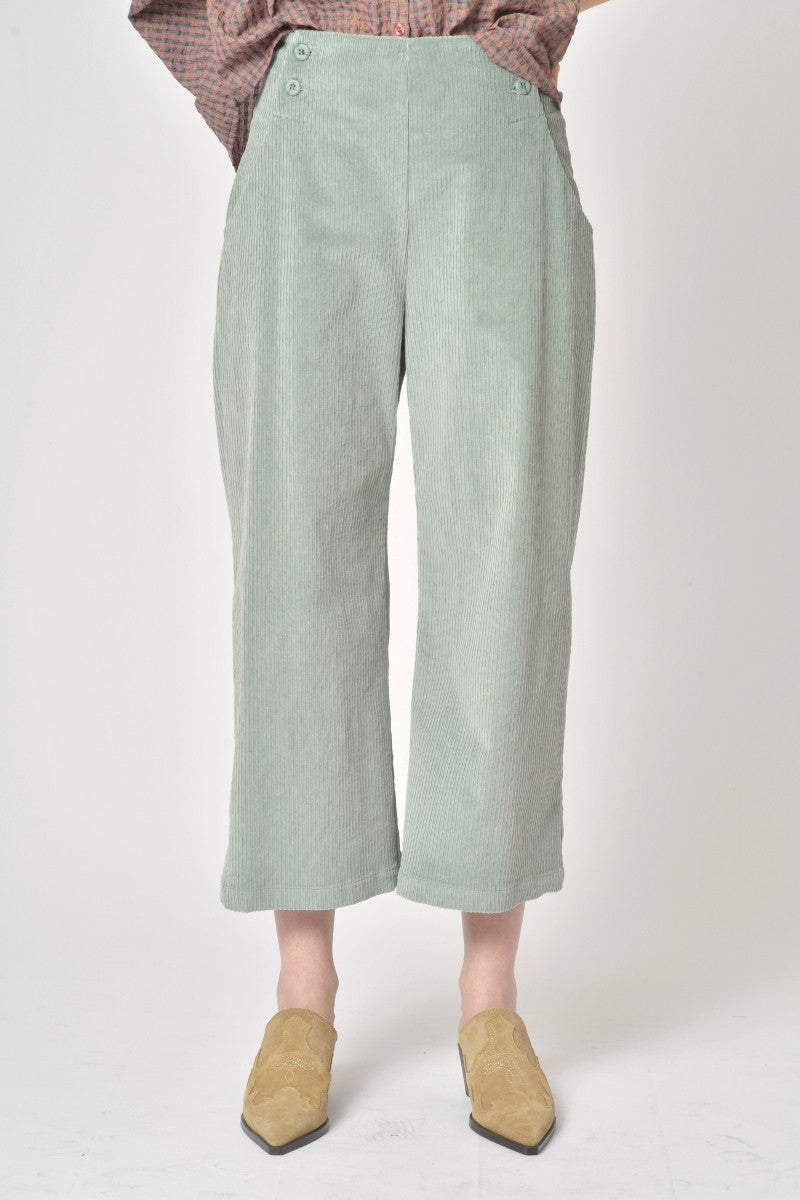 Pantalón Orfeo Leontine en color verde agua de pana fina, con bolsillos.