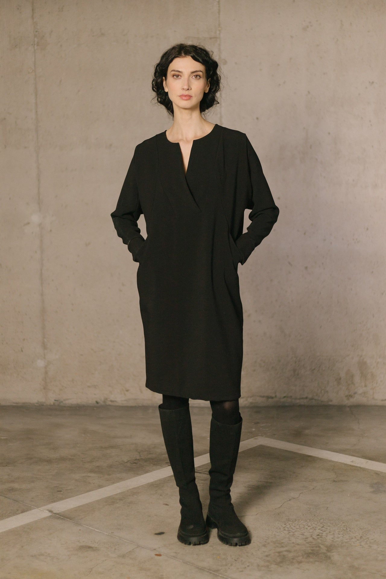 Vestido PAN PRODUCTO BASICO en color negro con bolsillos y escote a pico.
