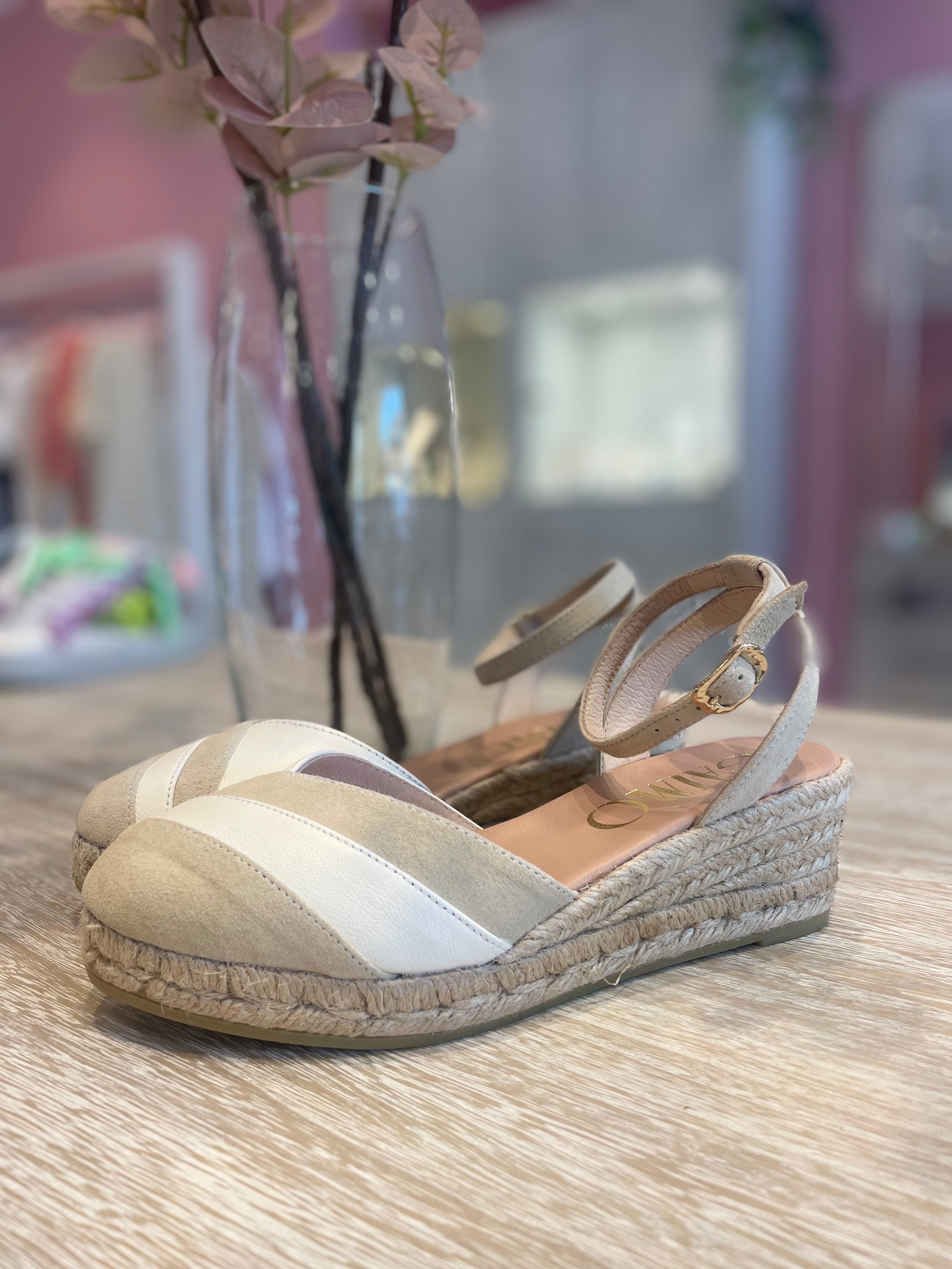 Alpargata gaimo Orus de piel en tonos beige, con diferentes texturas y pulsera en tobillo.