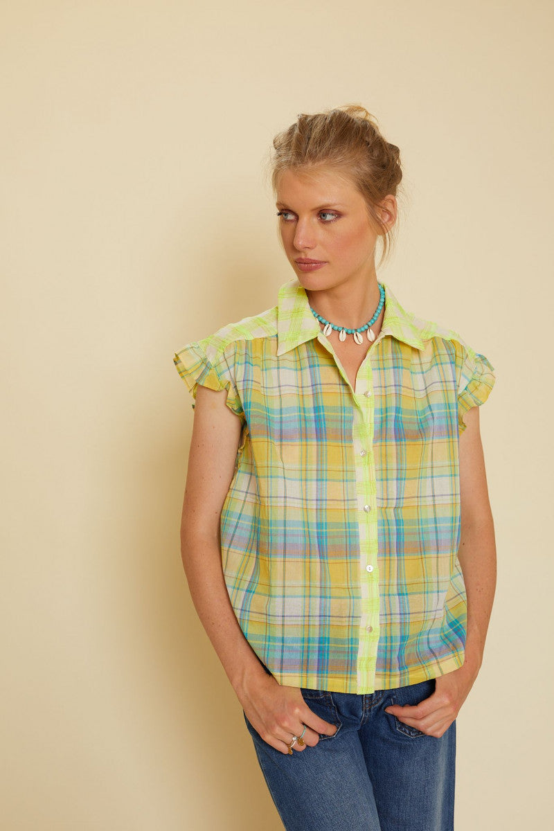Blusa Orfeo Alcor en tonos lima y turquesa con detalle de volante.
