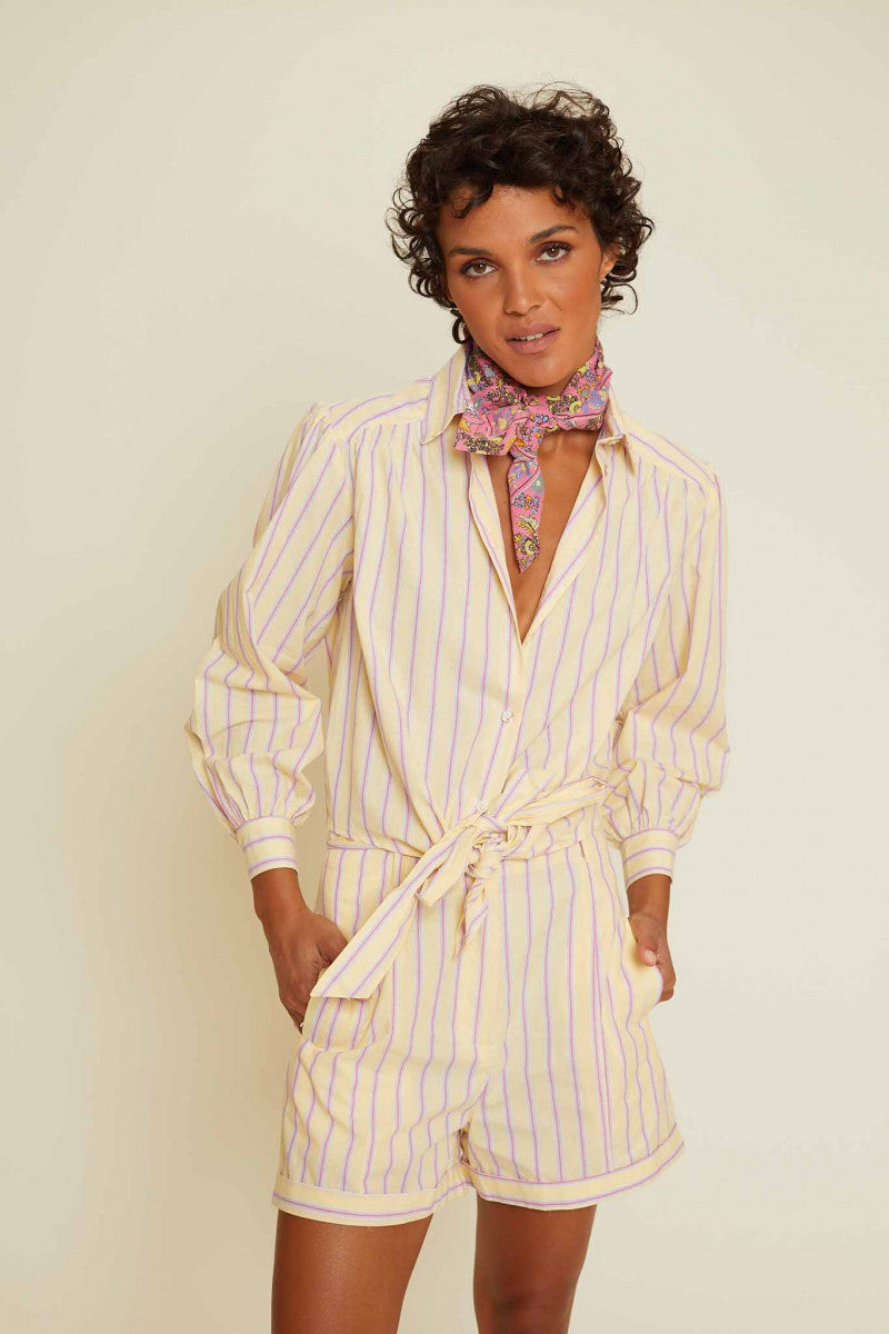 Blusa Orfeo Angele de rayas, con fondo amarillo y lineas en rosa.