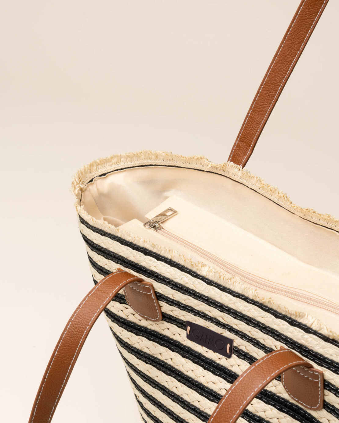 Bolso GAIMO Cameros estilo shopper de rayas trenzado en rafia, con cierre de cremallera.