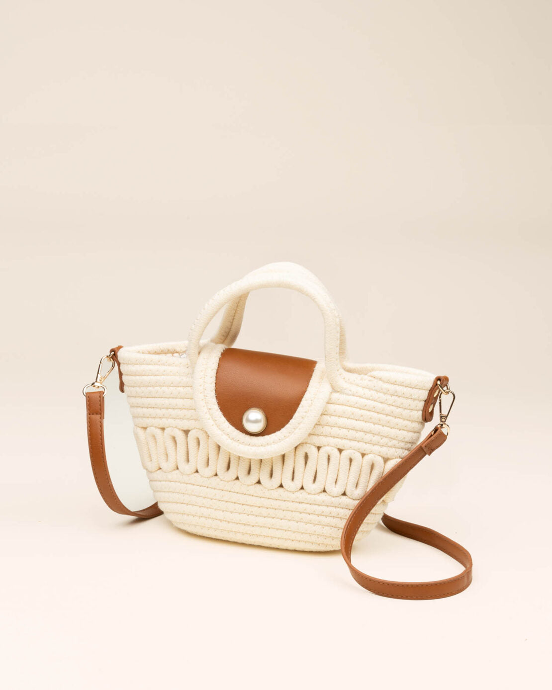 Bolso GAIMO Millan estilo cesta de algodón en tono marfil con solapa en color cuero con detalle de perla.