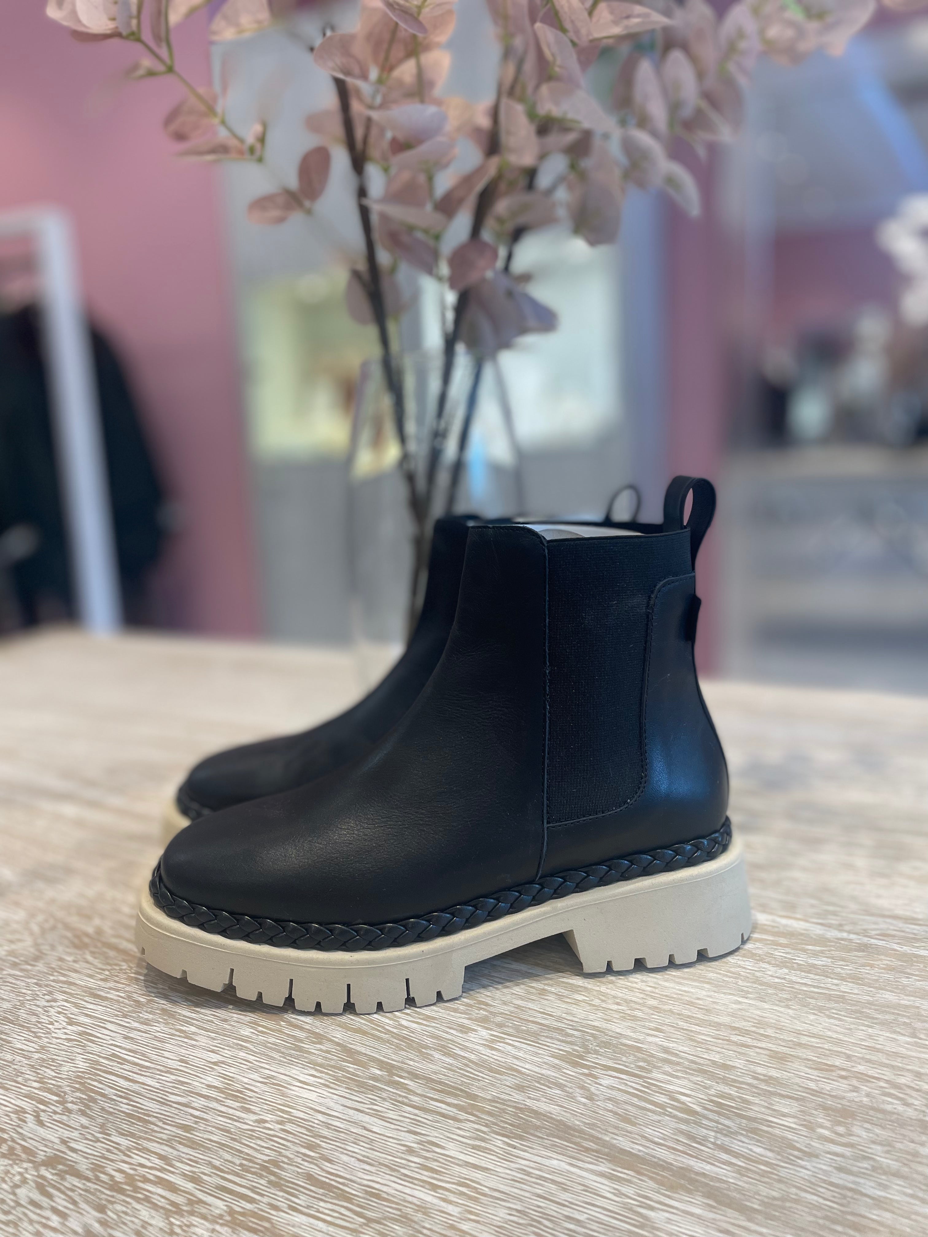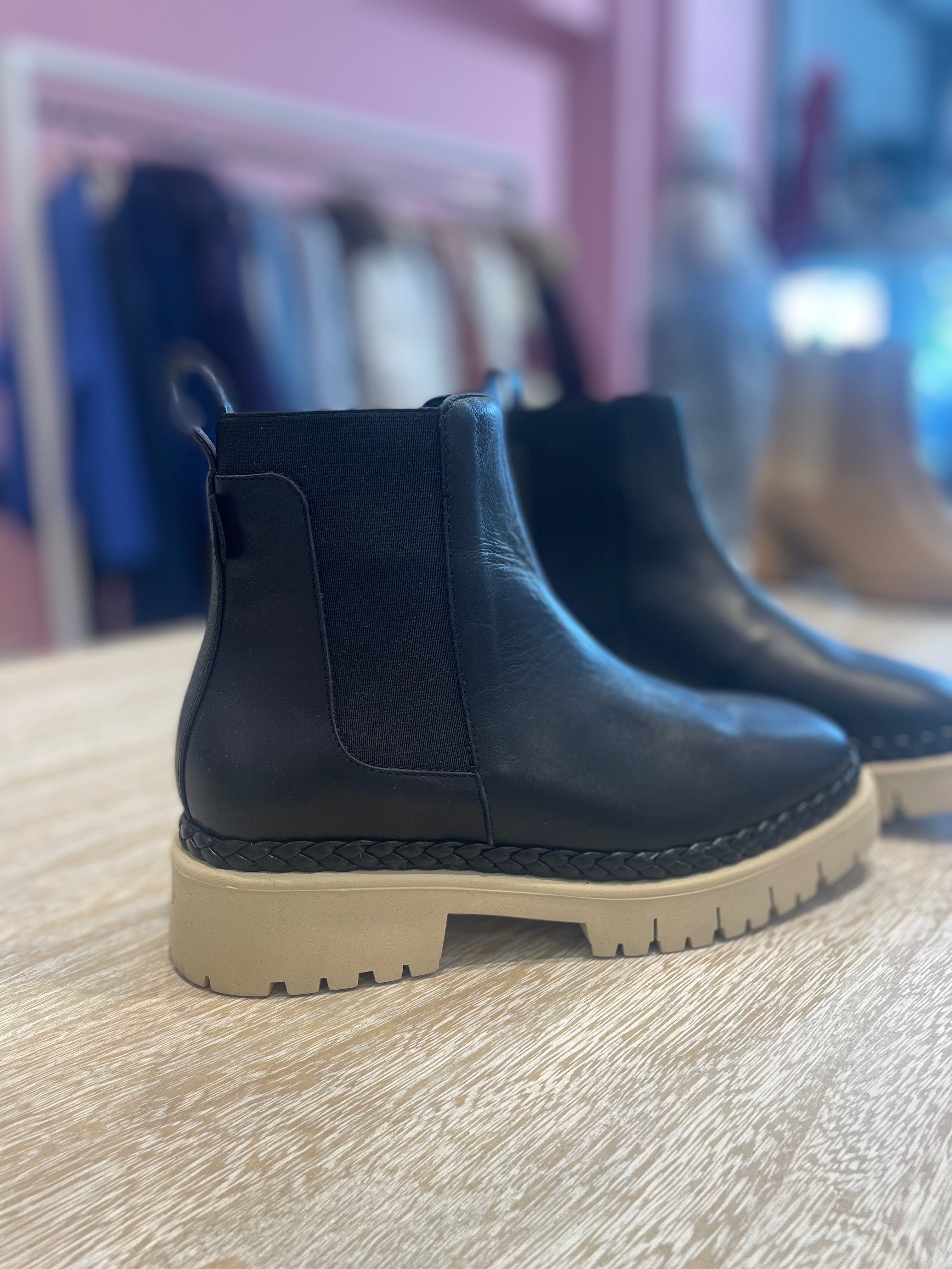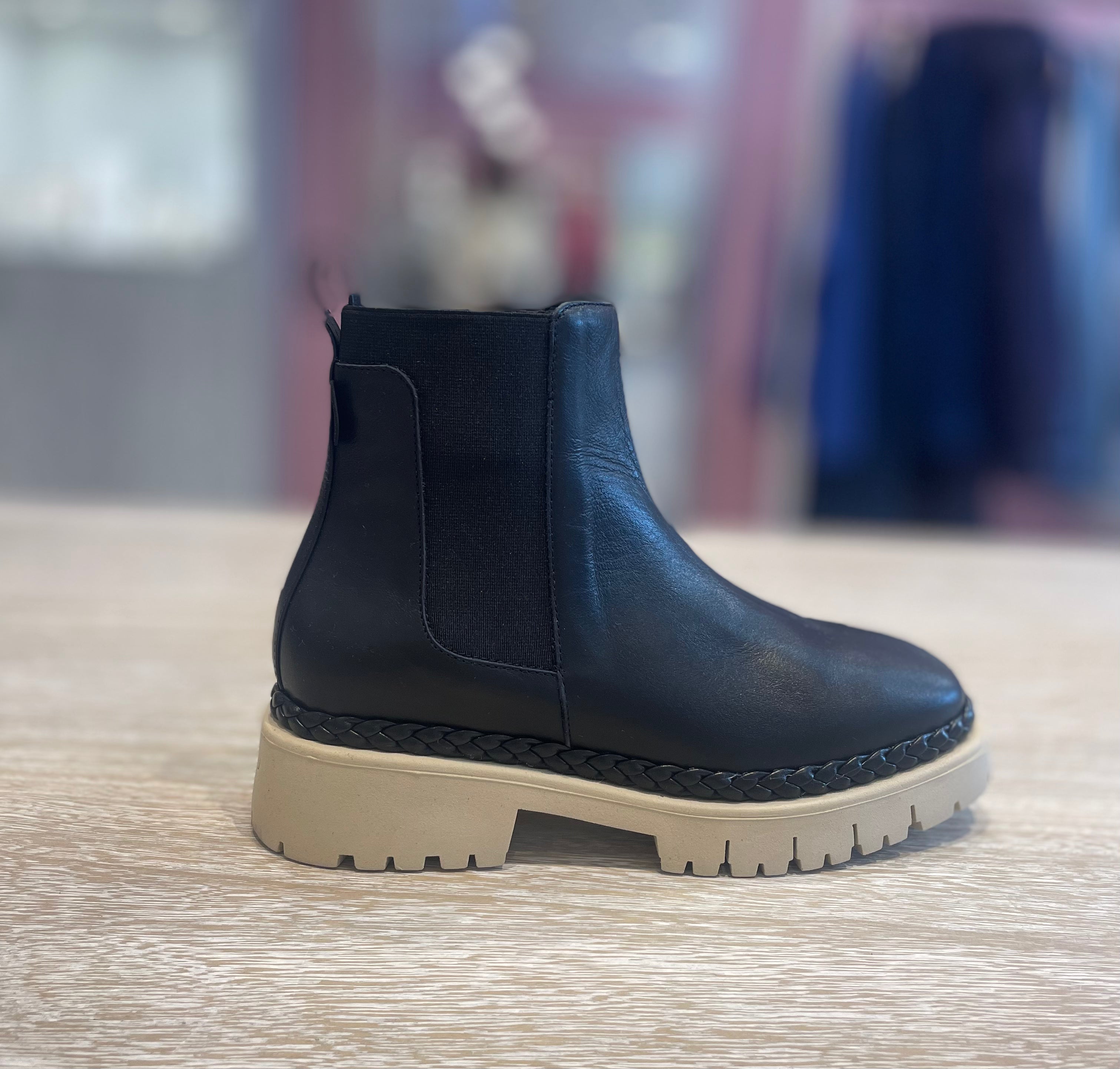 Botin Gaimo Catrina negro tipo Chelsea en piel soft con detalle trenzado y suela track.