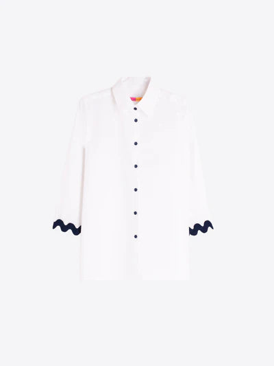 Camisa VILAGALLO Ondulina blanca con botones azules en forma de flor, y mangas con terminación de onda azul